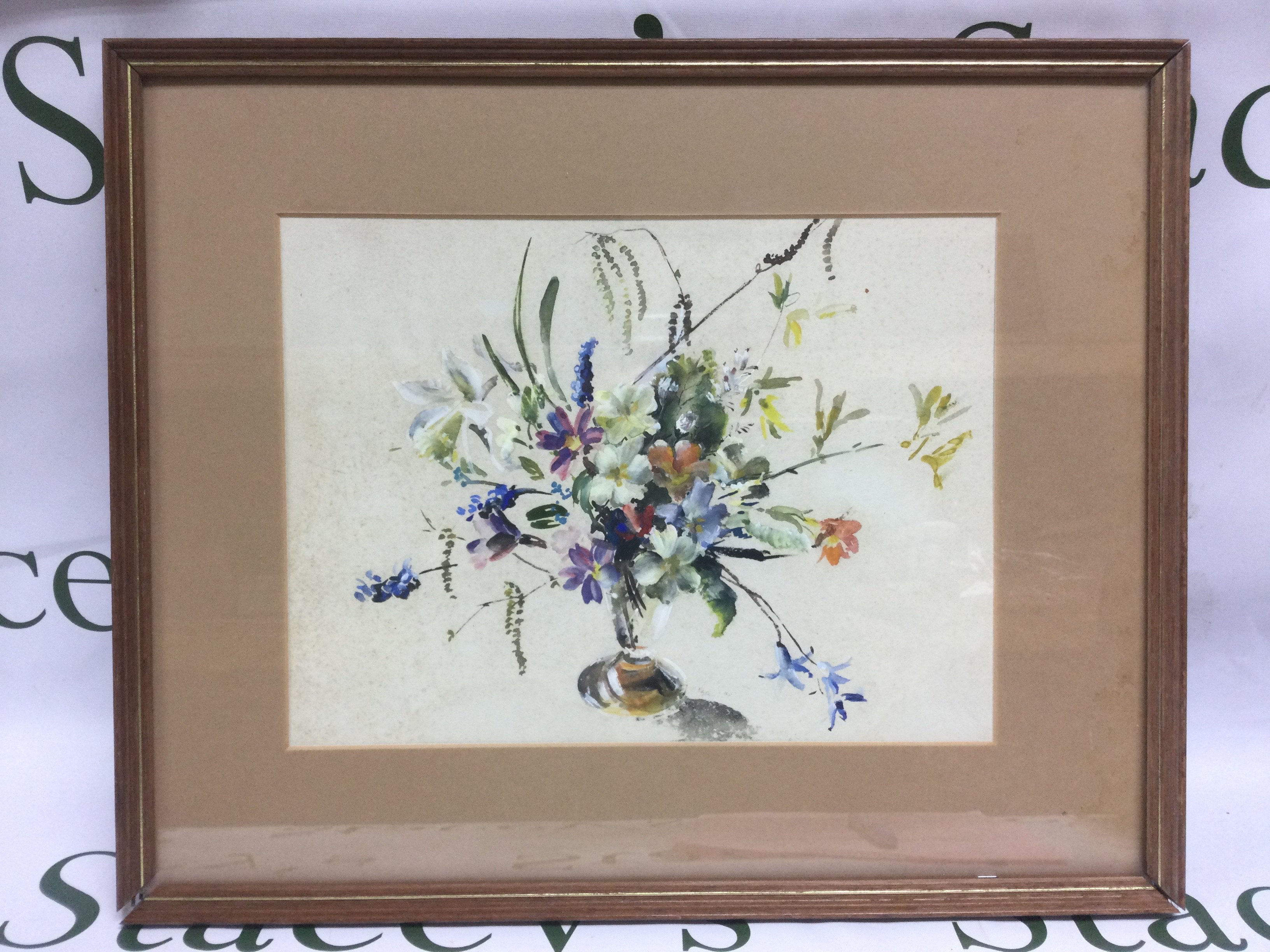 A framed and glazed Barbara Crowe watercolour of flowers in a vase, approx 41cm x 34cm including frame. Shipping category D.