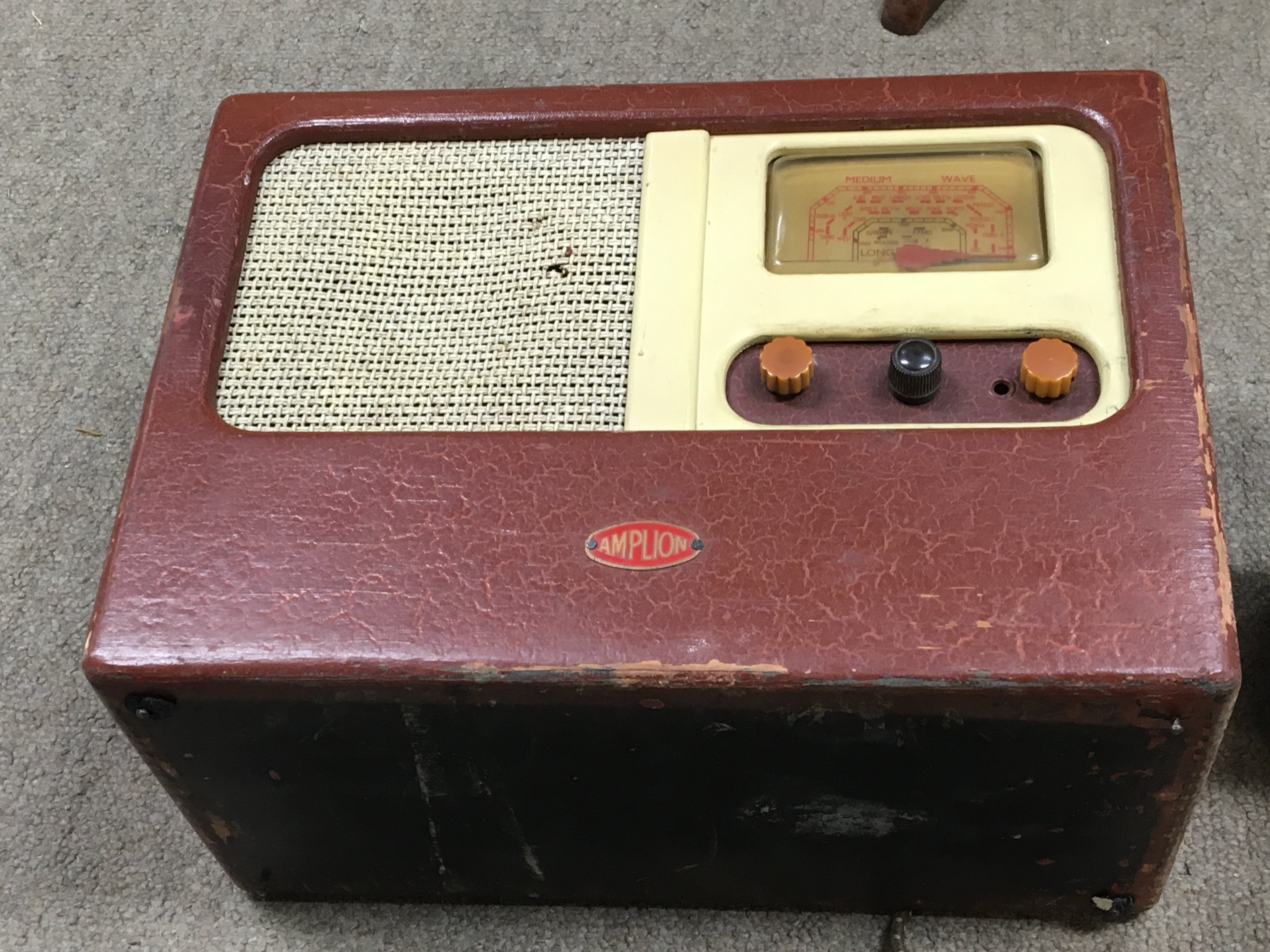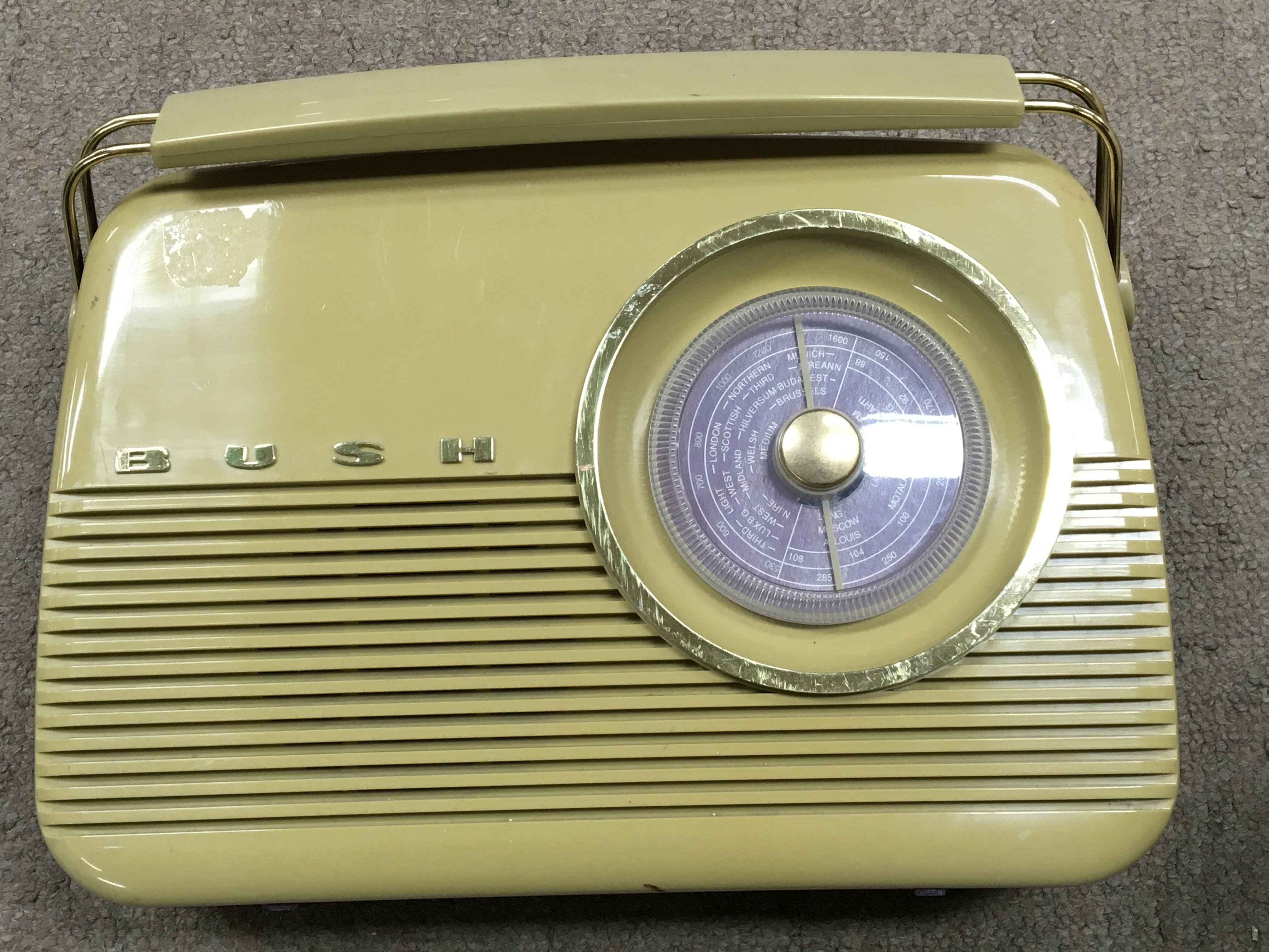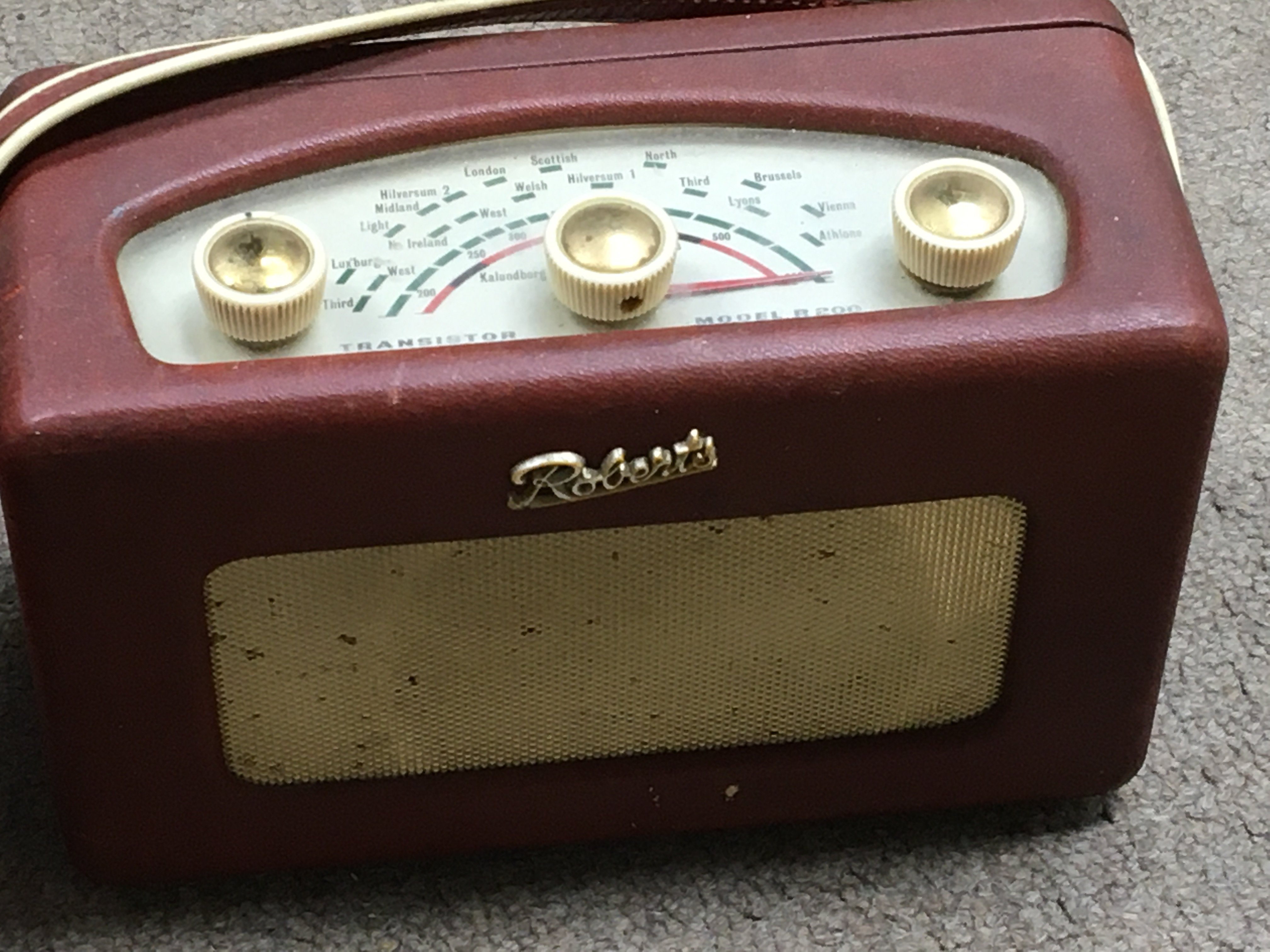 A collection of music related items including a traditional antique BUSH radio, a 4 valve portable receiver by Amplion, VINTAGE ORIGINAL ROBERTS R200 TRANSISTOR RADIO,