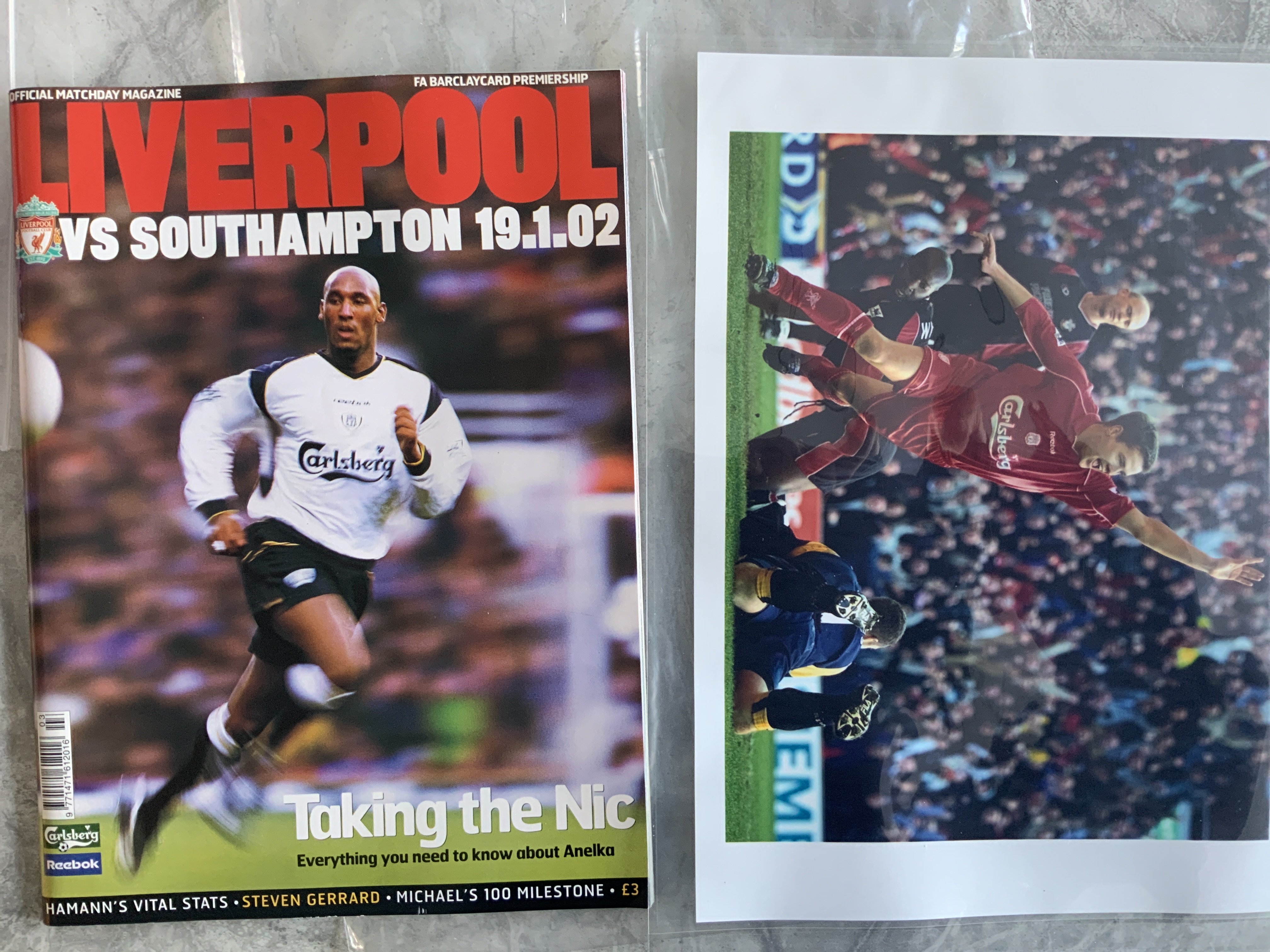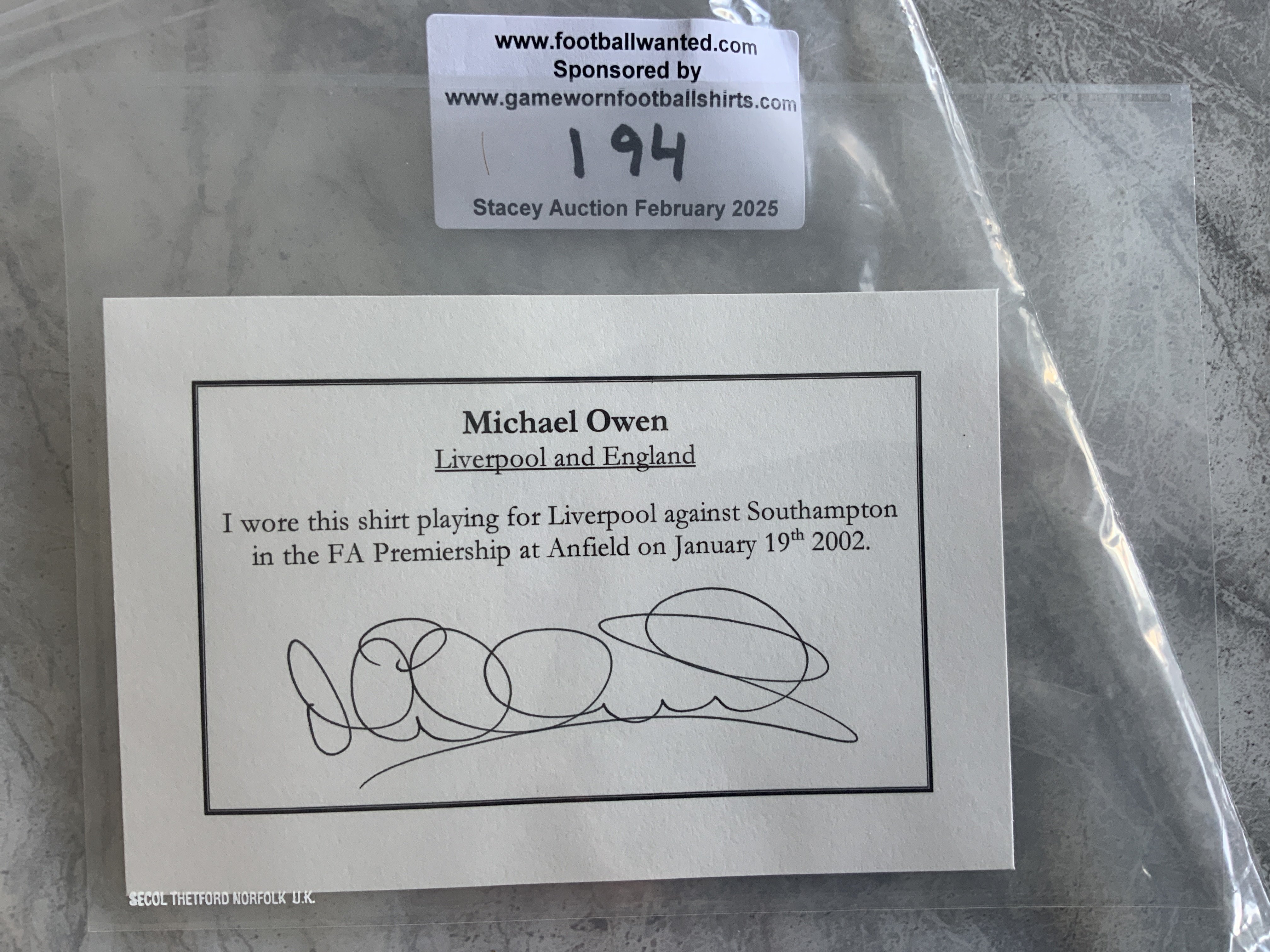 Liverpool 2001 - 2002 Home Match Worn Football Shirt: Red short sleeve Reebok shirt with Premier League badging to sleeves. Owen 10 to rear. Worn v Southampton on 19 January 2002. Comes with signed COA from the player who scored in the match, press photo and matchday programme.