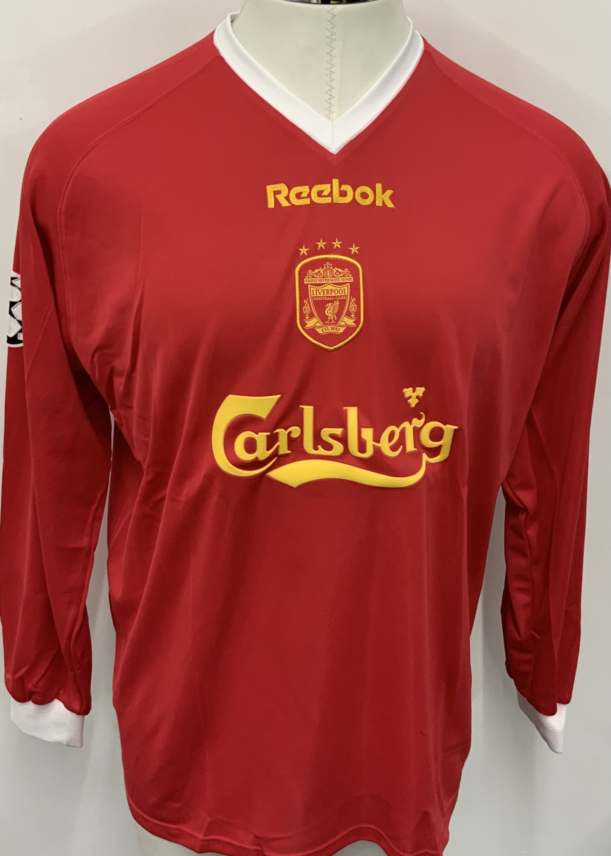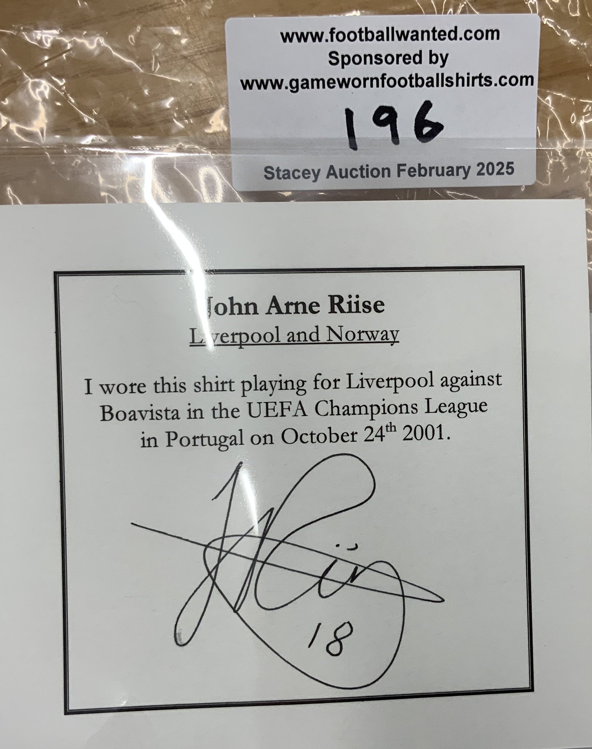 Liverpool 2001 - 2002 Home Match Worn Football Shirt: Red long sleeve Reebok shirt with Champions League badging to sleeve. Riise 18 to rear. Worn v Boavista on 24 October 2001. Comes with signed COA from the player.