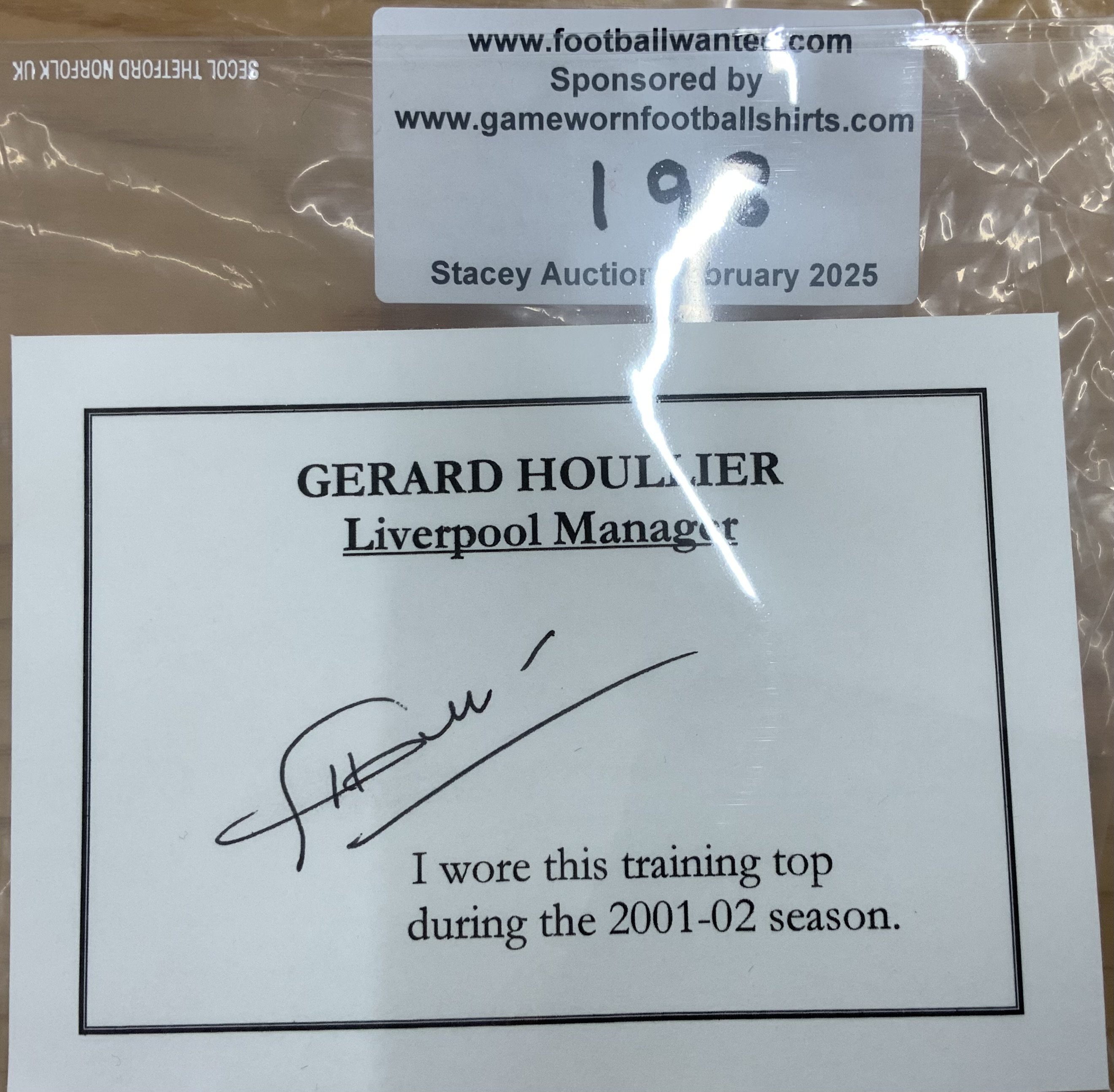 Liverpool 2001 - 2002 Training Top: Red long sleeve Reebok shirt with initials GH to front. Worn by the manager Gerard Houllier. Comes with signed COA from him.