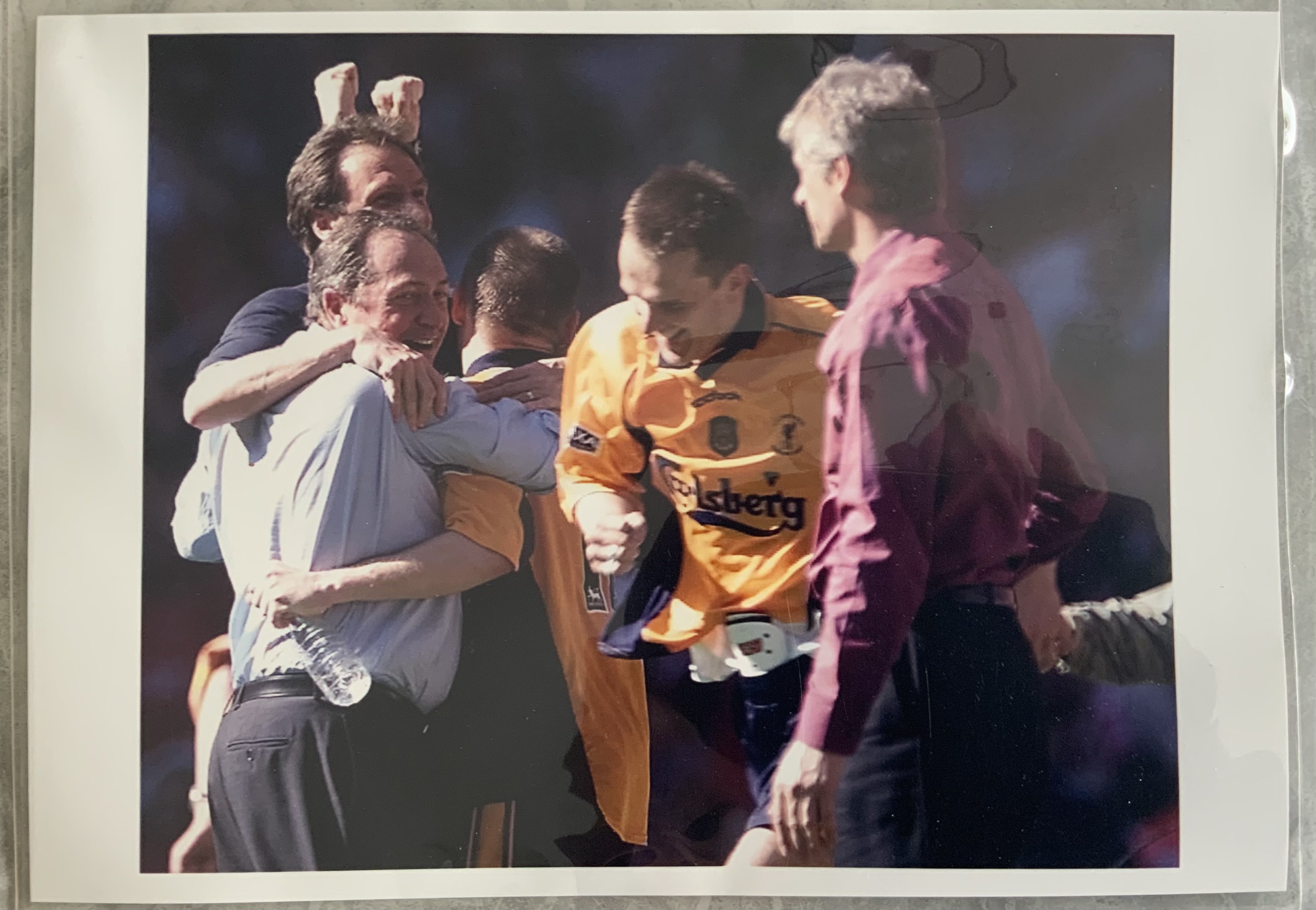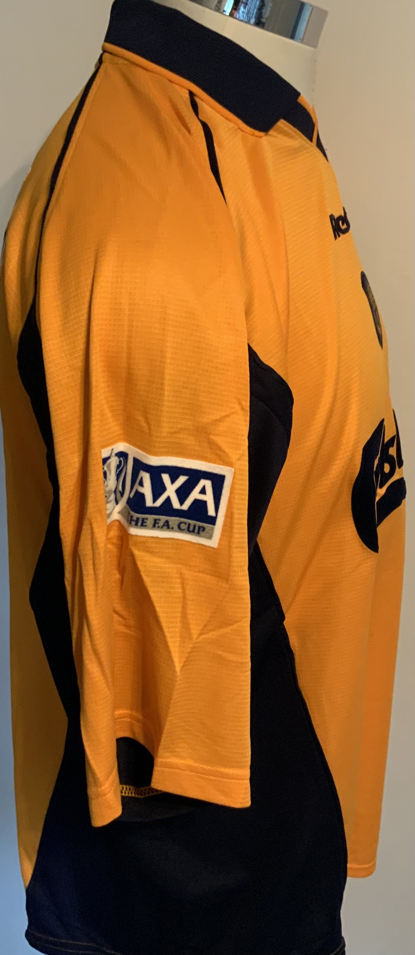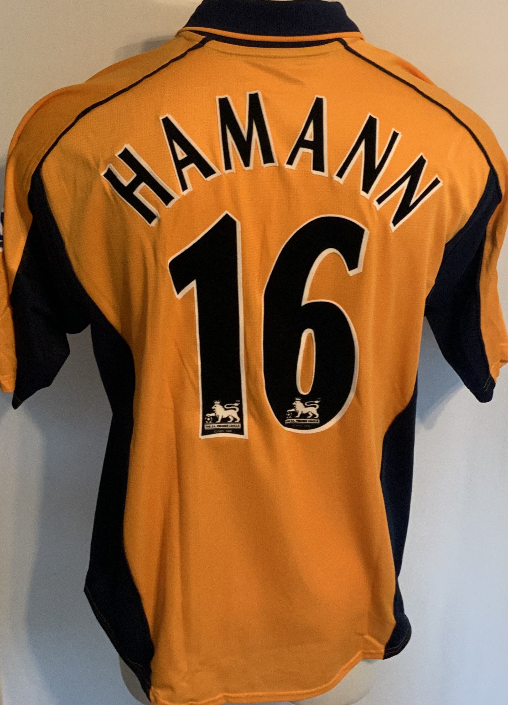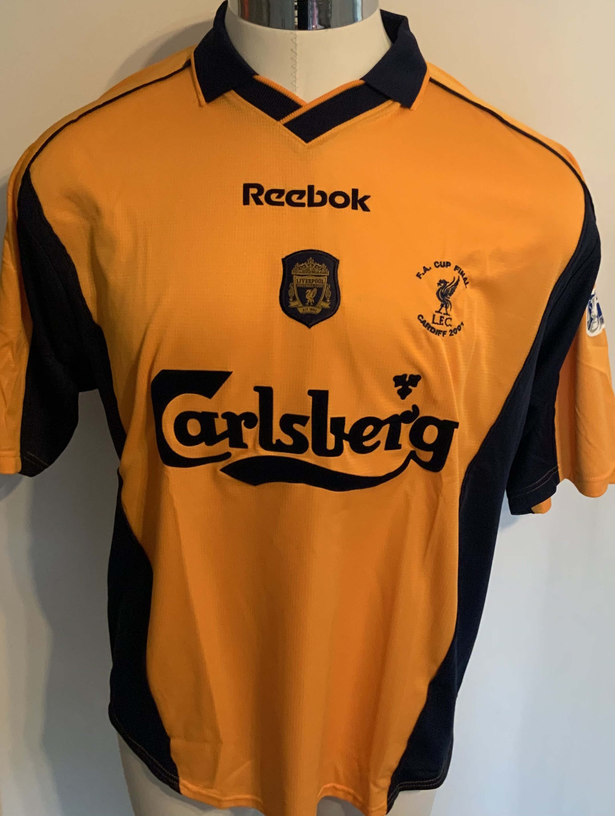 Liverpool 2001 FA Cup Final Match Issued Football Shirt: Gold short sleeve Reebok shirt with FA Cup badging to sleeves and embroidered to front with FA Cup Final 2001. Hamann 16 to rear. Issued for the Cup Final v Arsenal. Match day programme and press photo is included. Hamann played in the final which Liverpool won. This was the first FA Cup final not played at Wembley since 1922 excluding replays.