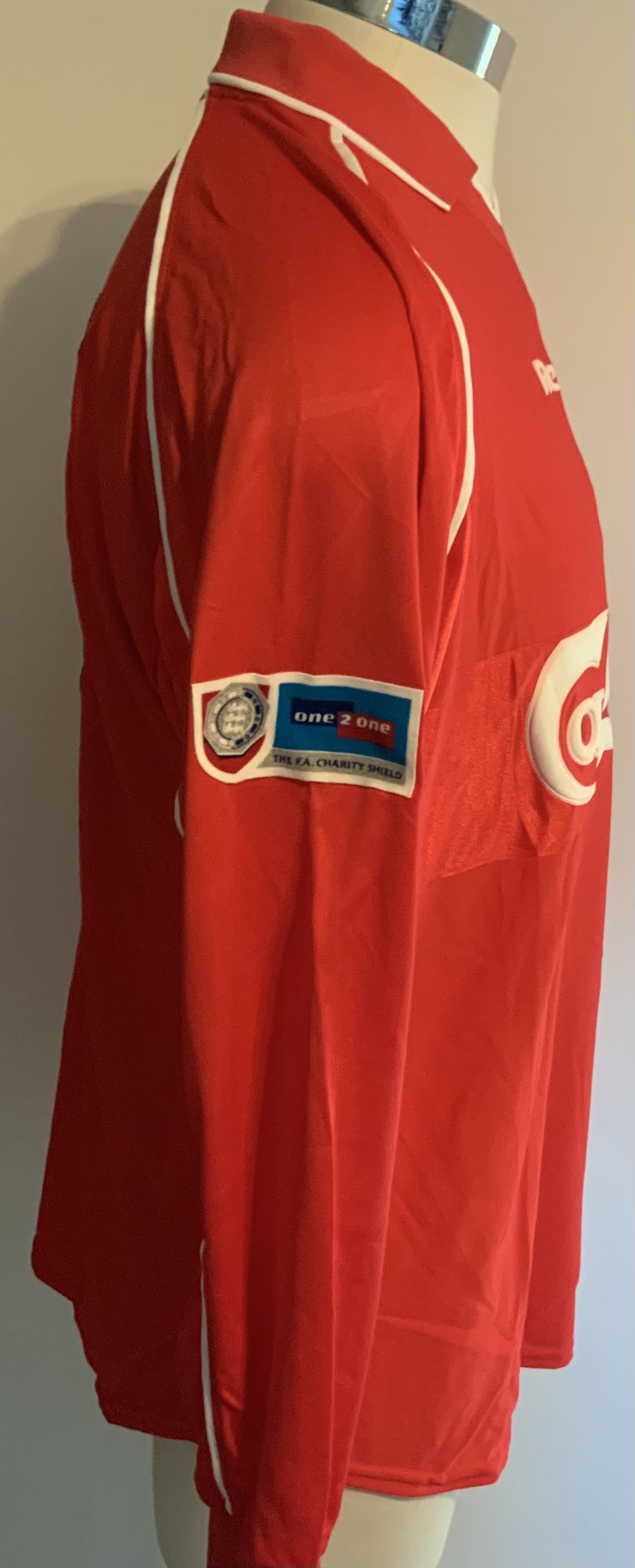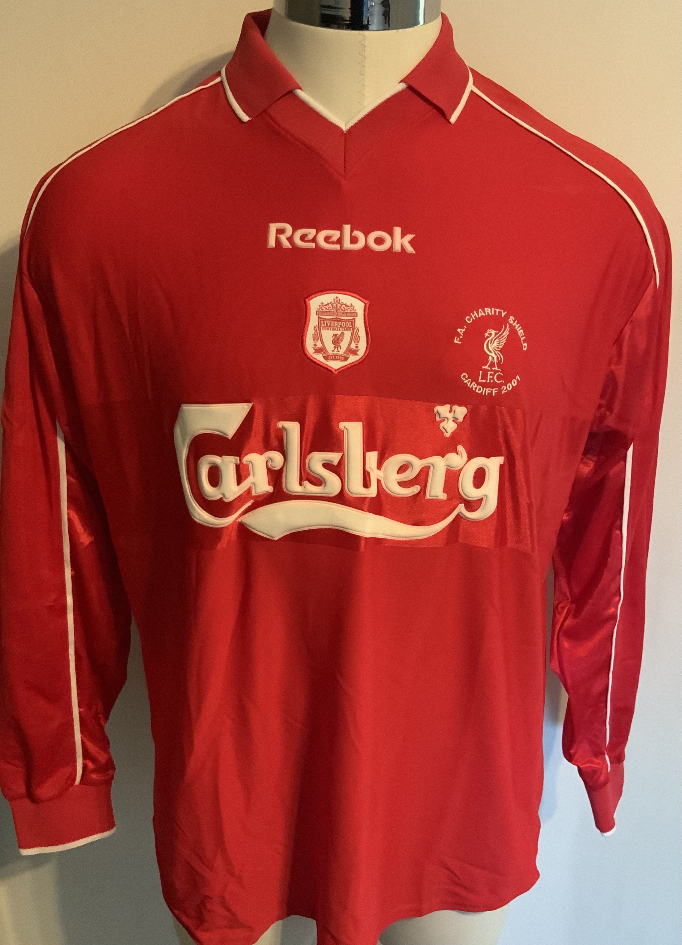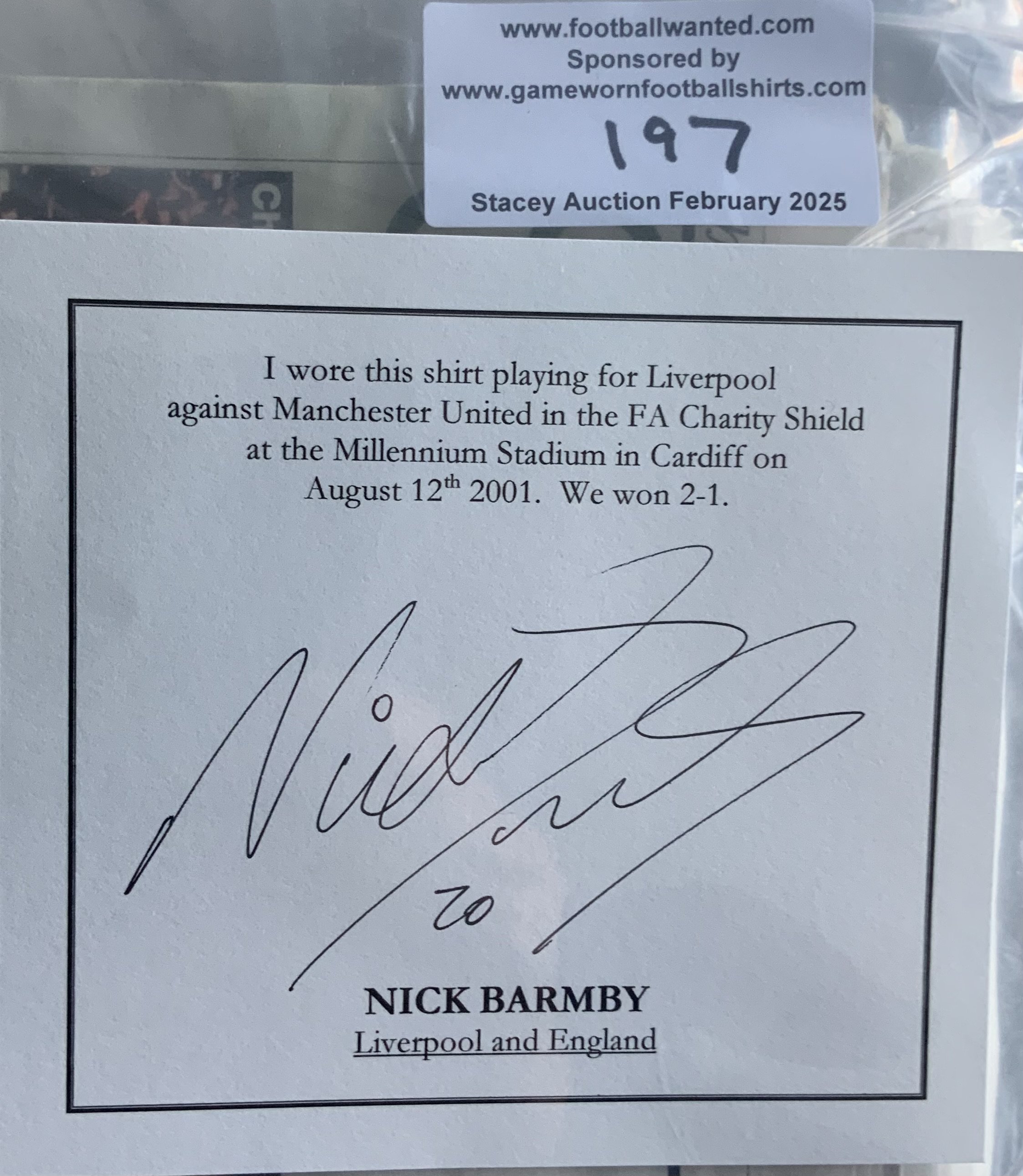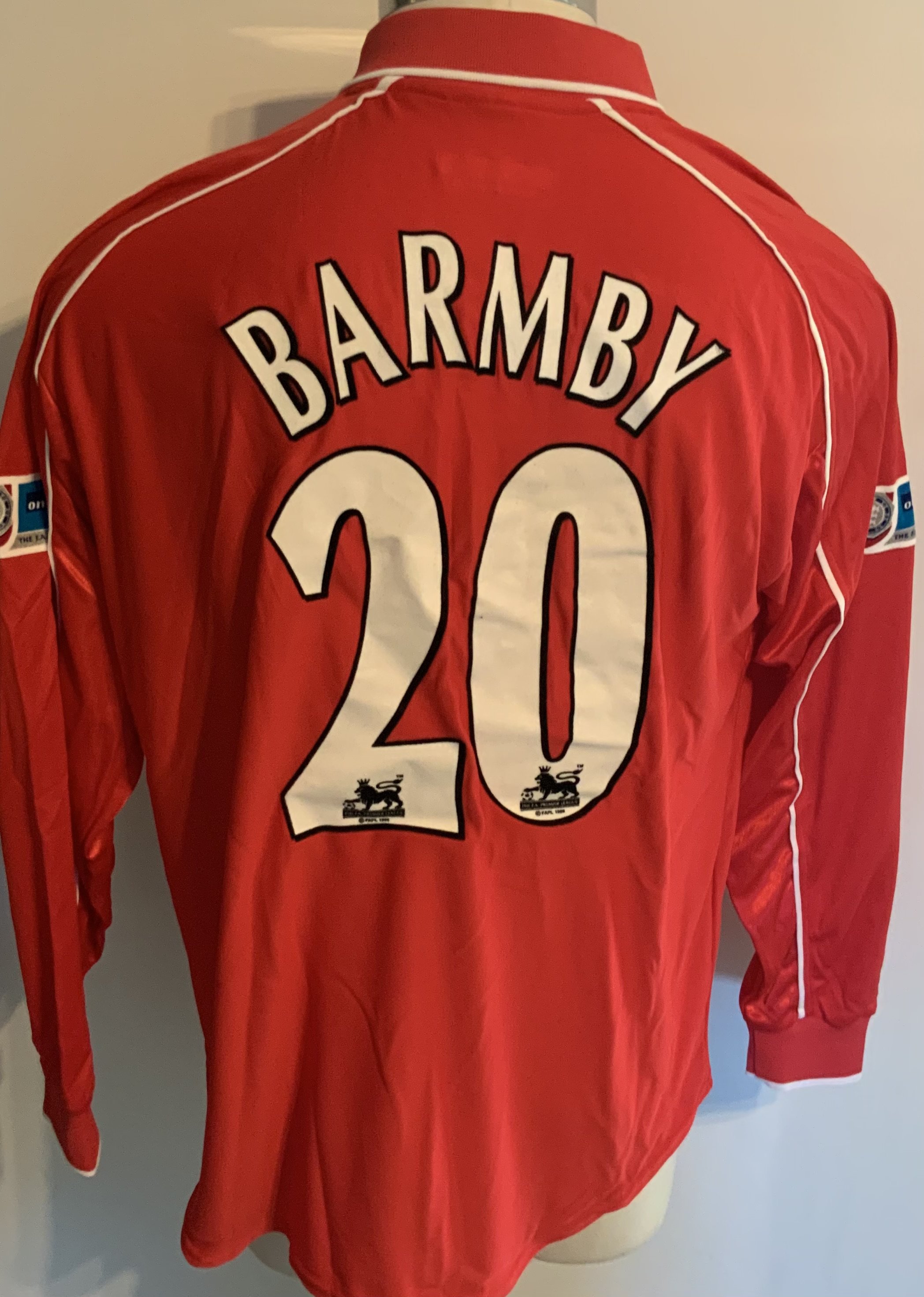 Liverpool 2001 Match Worn Charity Shield Football Shirt: Red long sleeve Reebok shirt with Charity Shield badging to sleeves. Barmby 20 to rear. Worn v Manchester United on 12 August 2001. Comes with signed COA from the player.