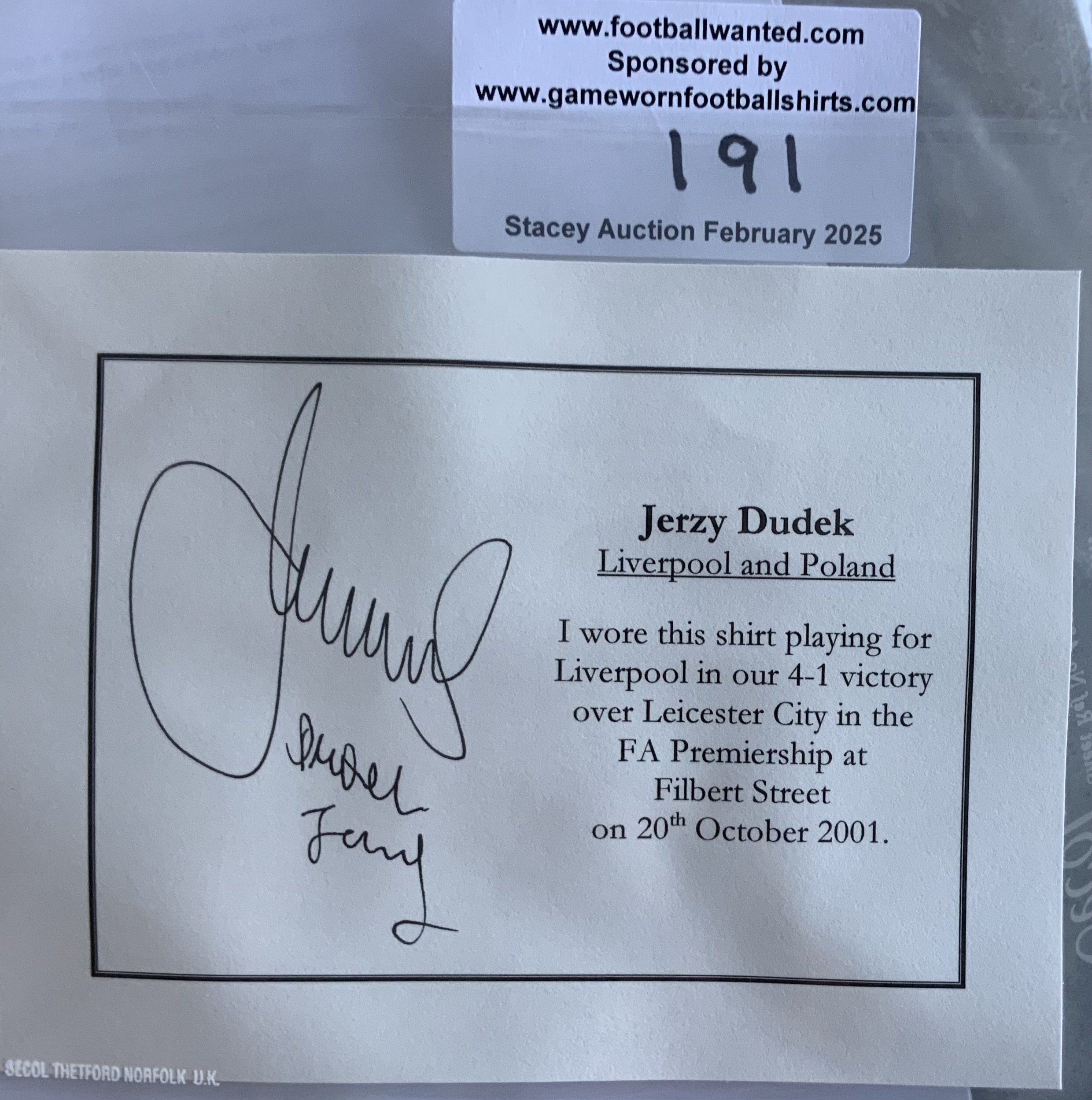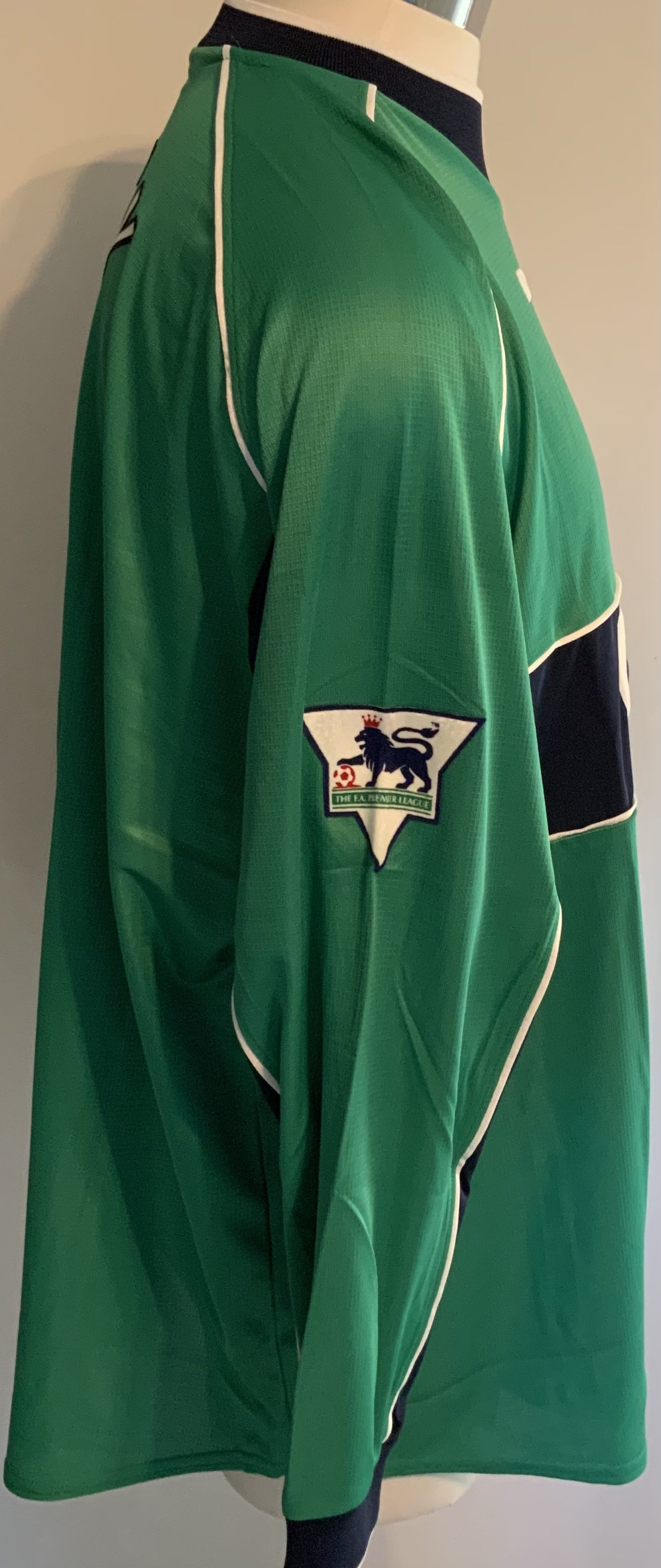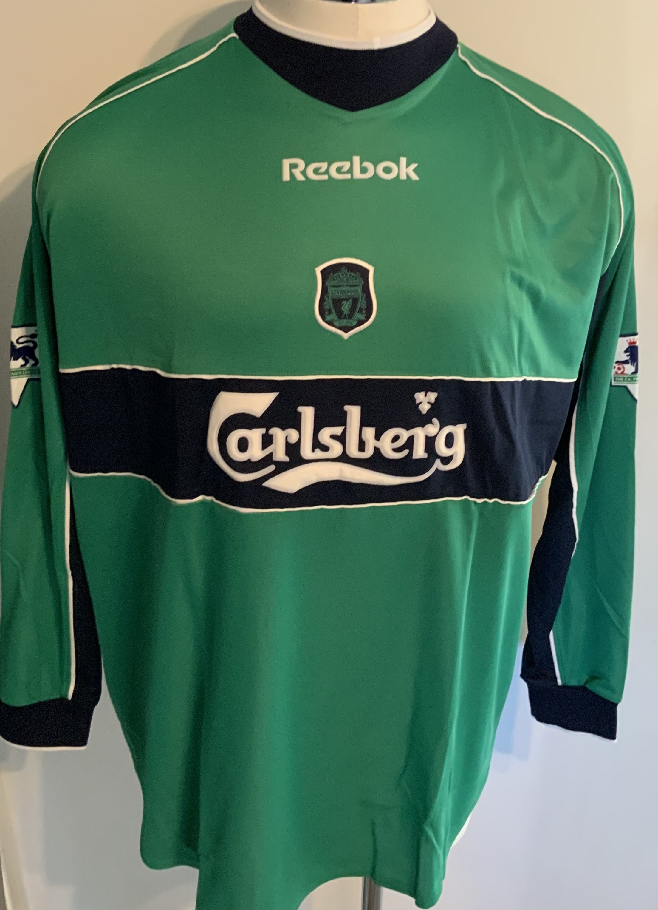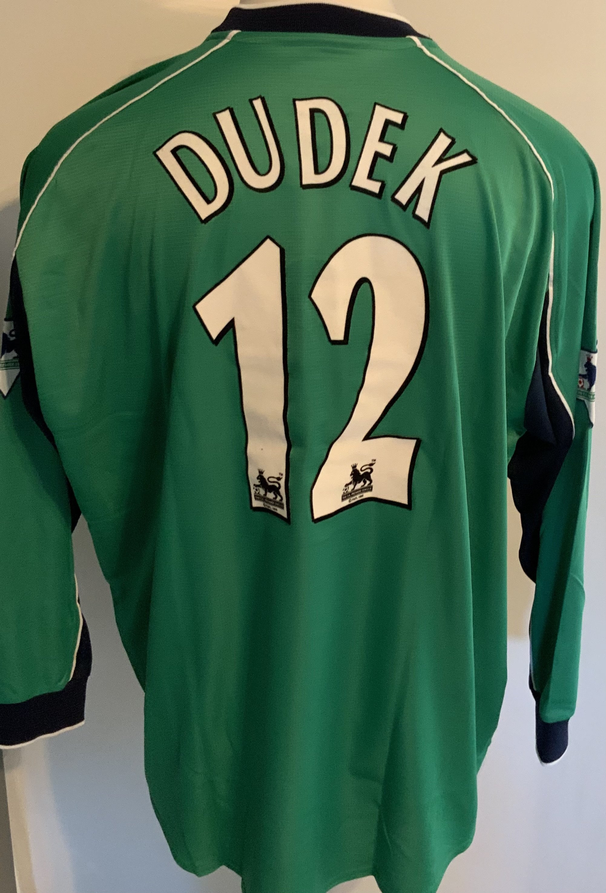 Liverpool 2001 - 2002 Match Worn Football Shirt: Green long sleeve Reebok goalkeeper shirt with Premier League badging to sleeves. Dudek 12 to rear. Worn v Leicester on 20 October 2001. Comes with signed COA from the player.