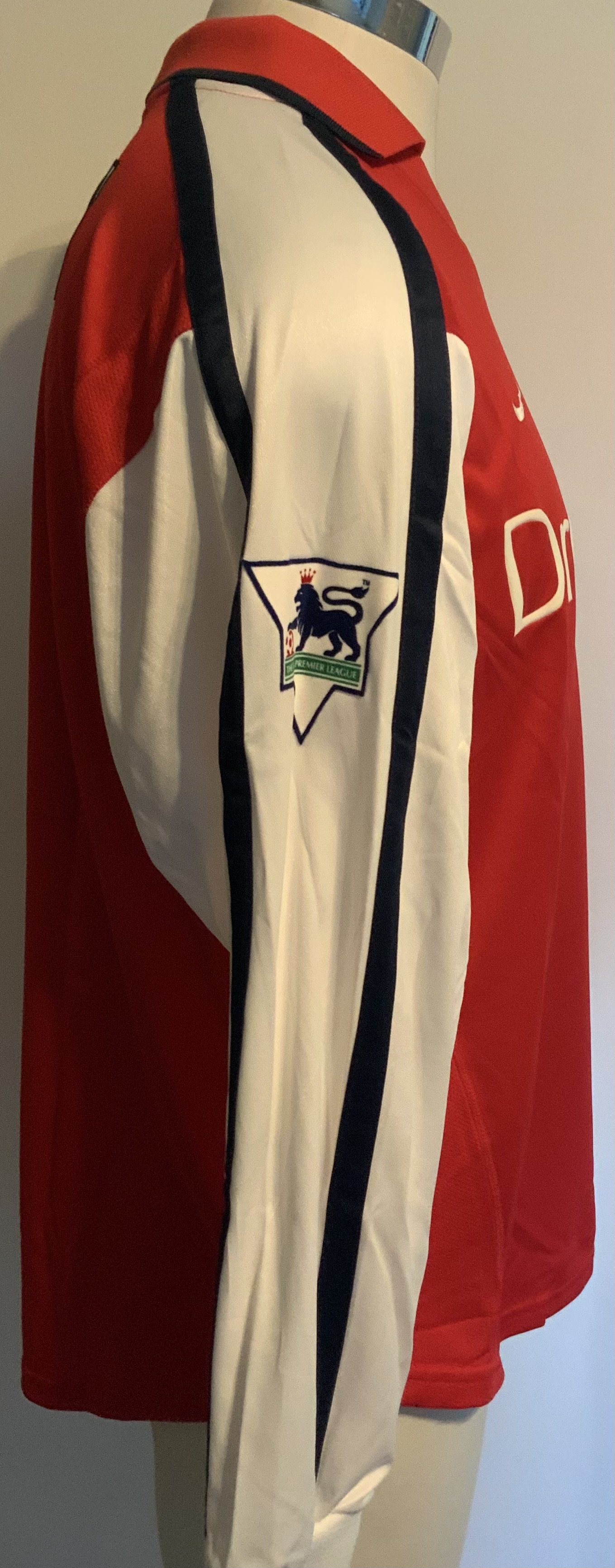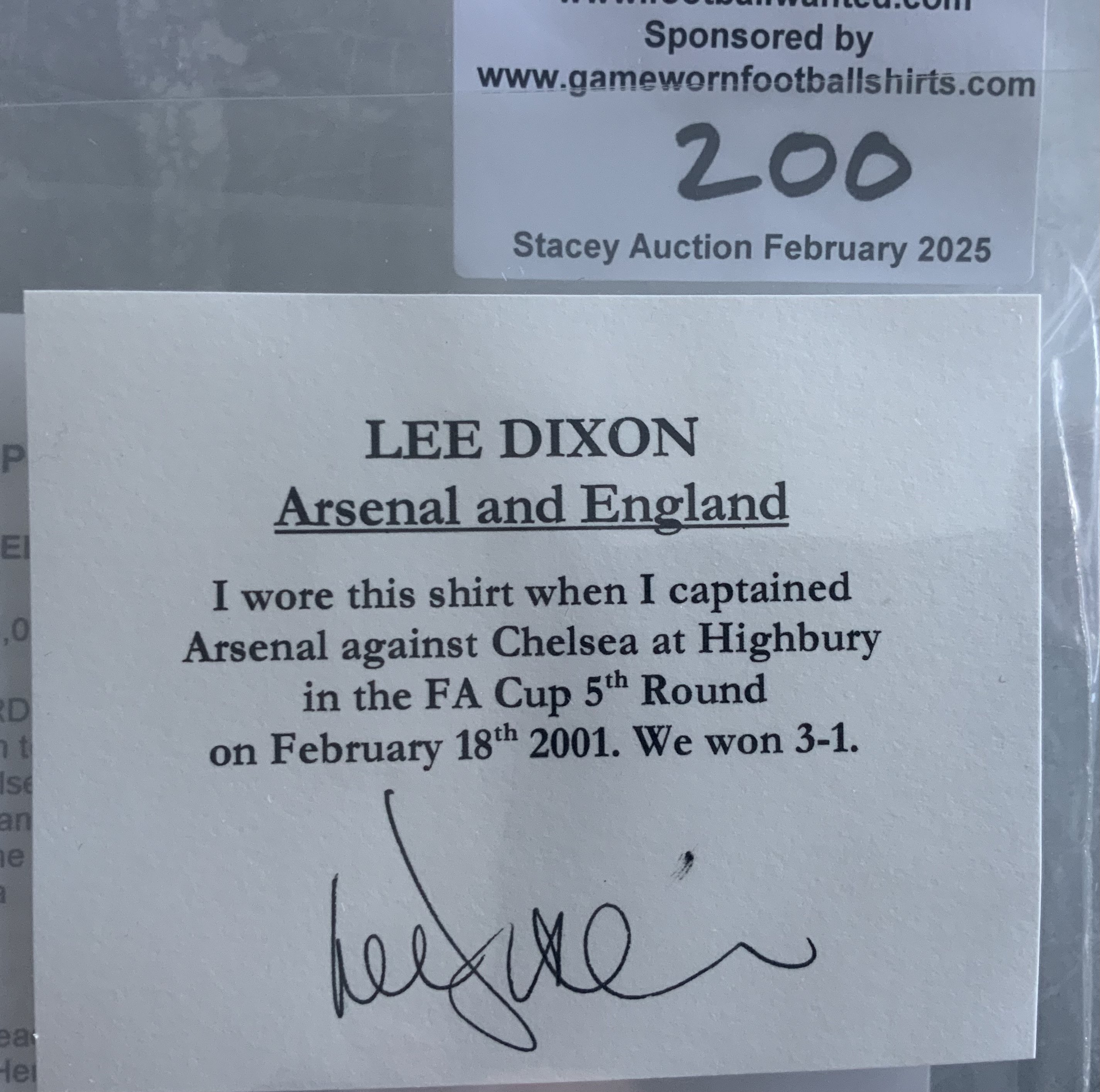 Arsenal 2000 - 2001 Home Match Worn Football Shirt: Red and white long sleeve unwashed Nike shirt with Premier League badging to sleeves. Dixon 2 to rear. Worn v Chelsea on 18 February 2001. Comes with signed COA from the player who was captain on the day.