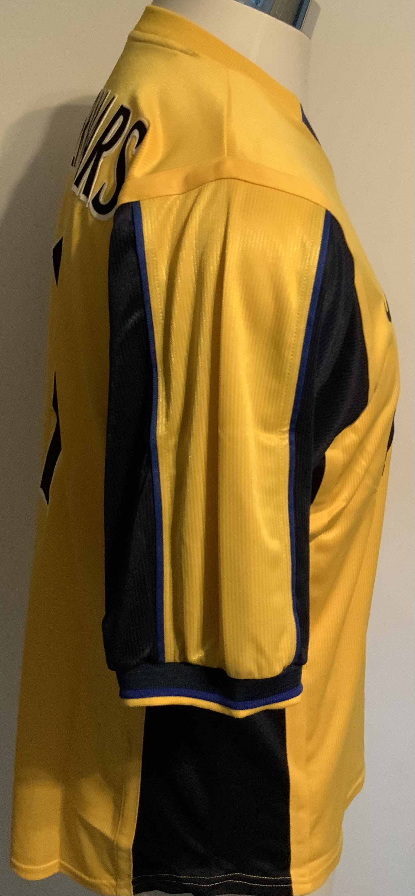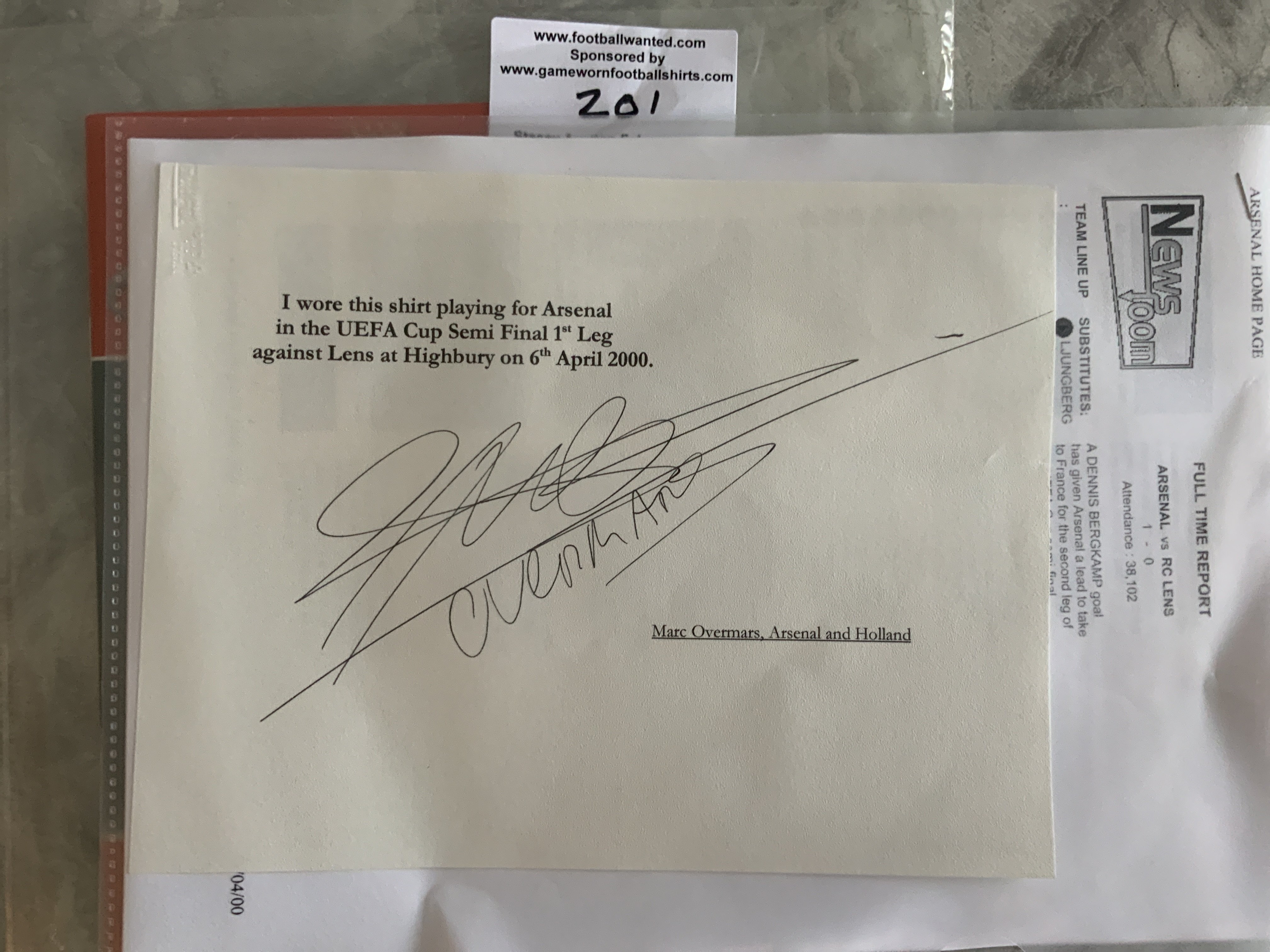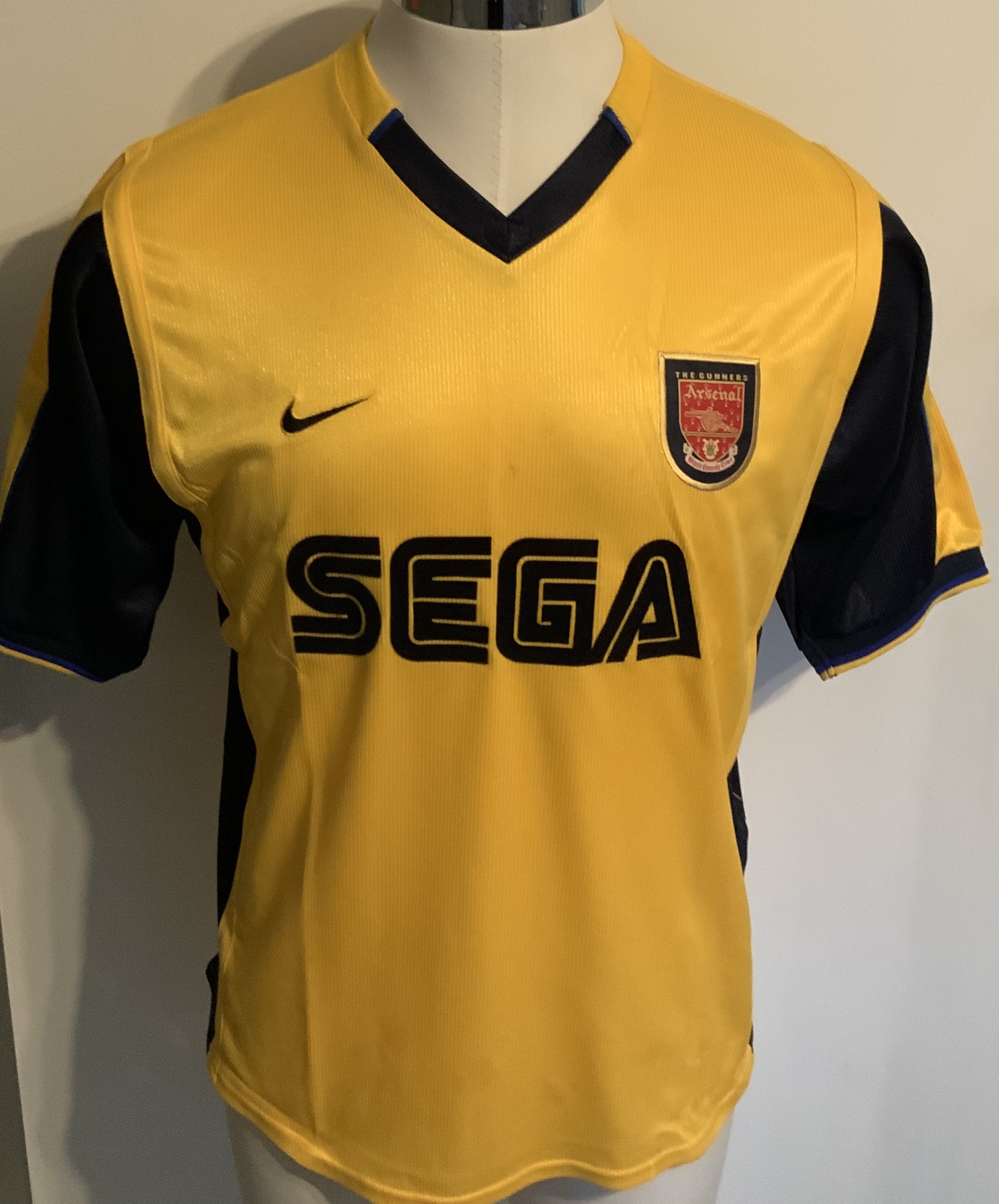 Arsenal 1999 - 2000 UEFA Cup Semi Final Match Worn Football Shirt: Yellow short sleeve Nike Sega shirt with Overmars 11 to rear. Worn v Lens in UEFA Cup semi final 1st leg on 6 April 2000. Comes with signed COA from the player and programme.