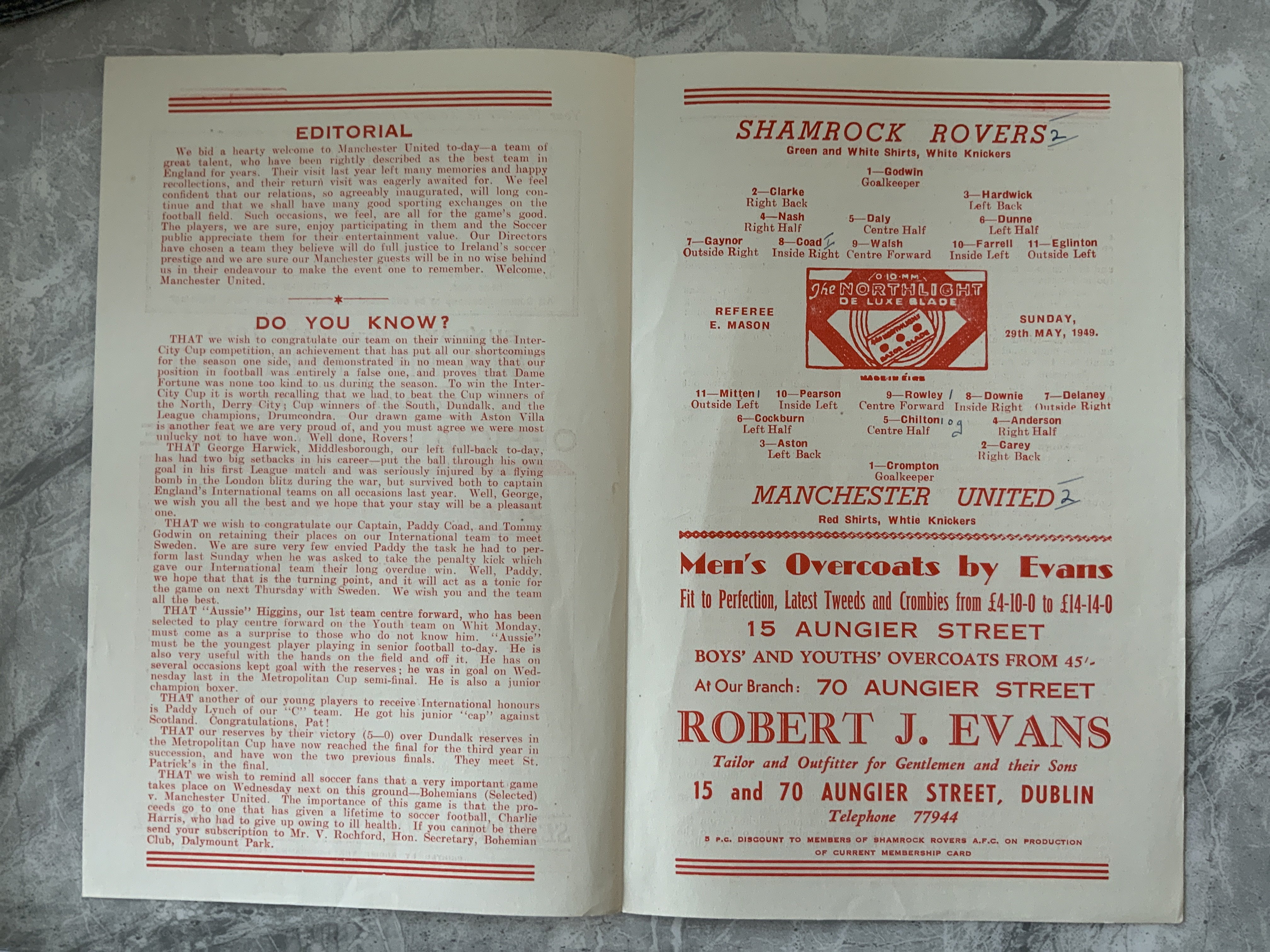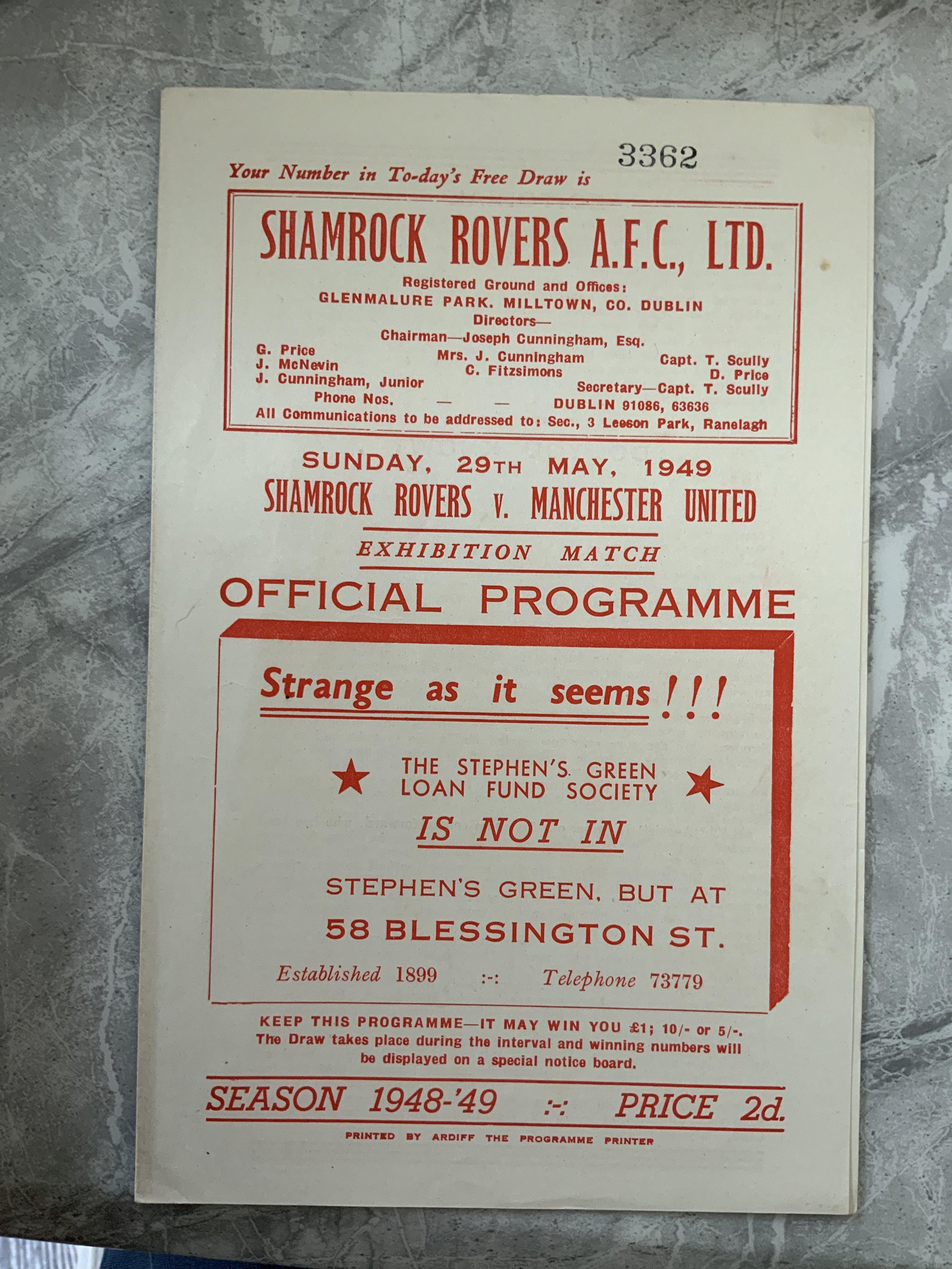 48/49 Shamrock Rovers v Manchester United Football Programme: End of season 4 page exhibition match. Excellent condition with score and scorers noted inside.