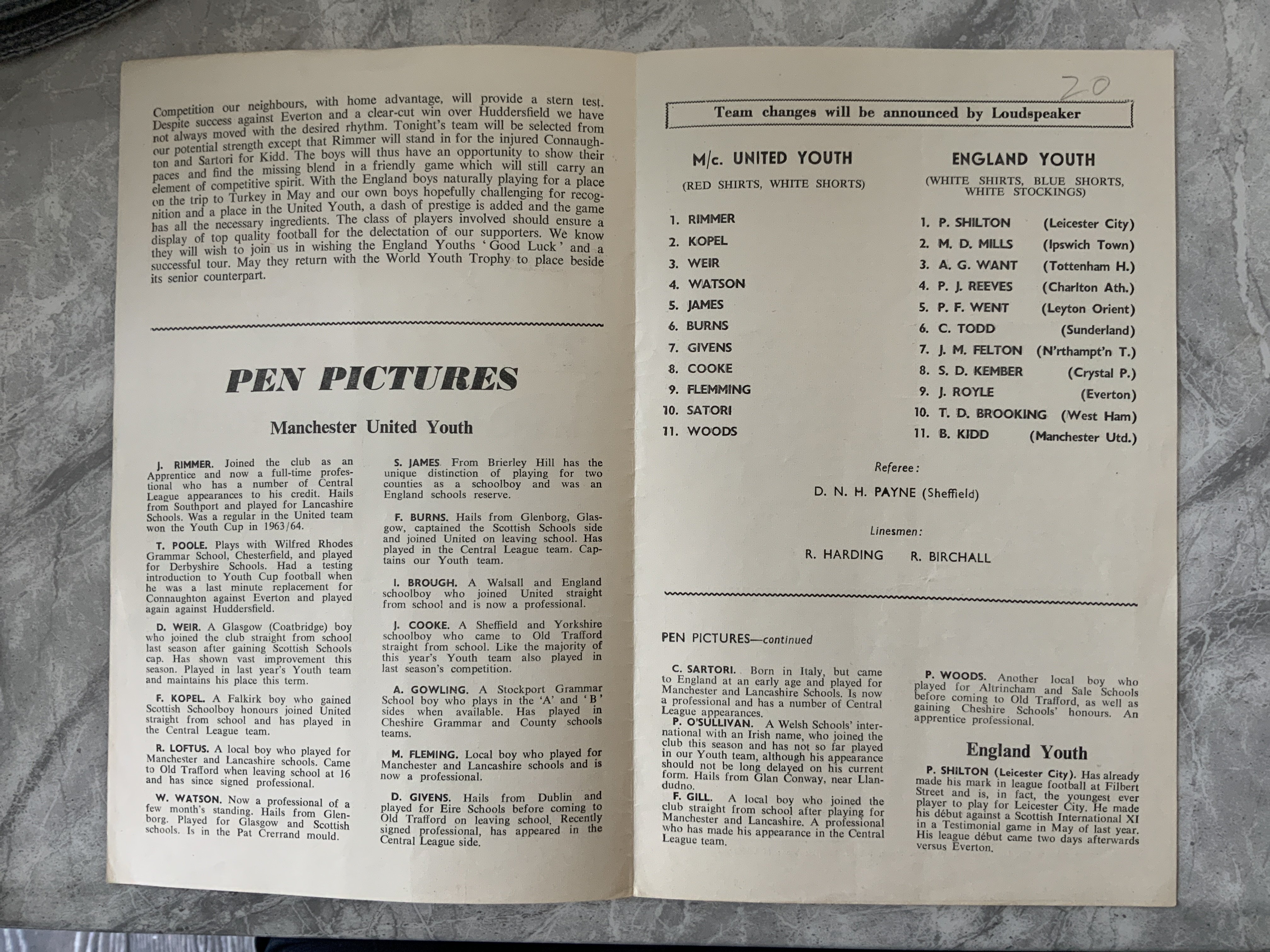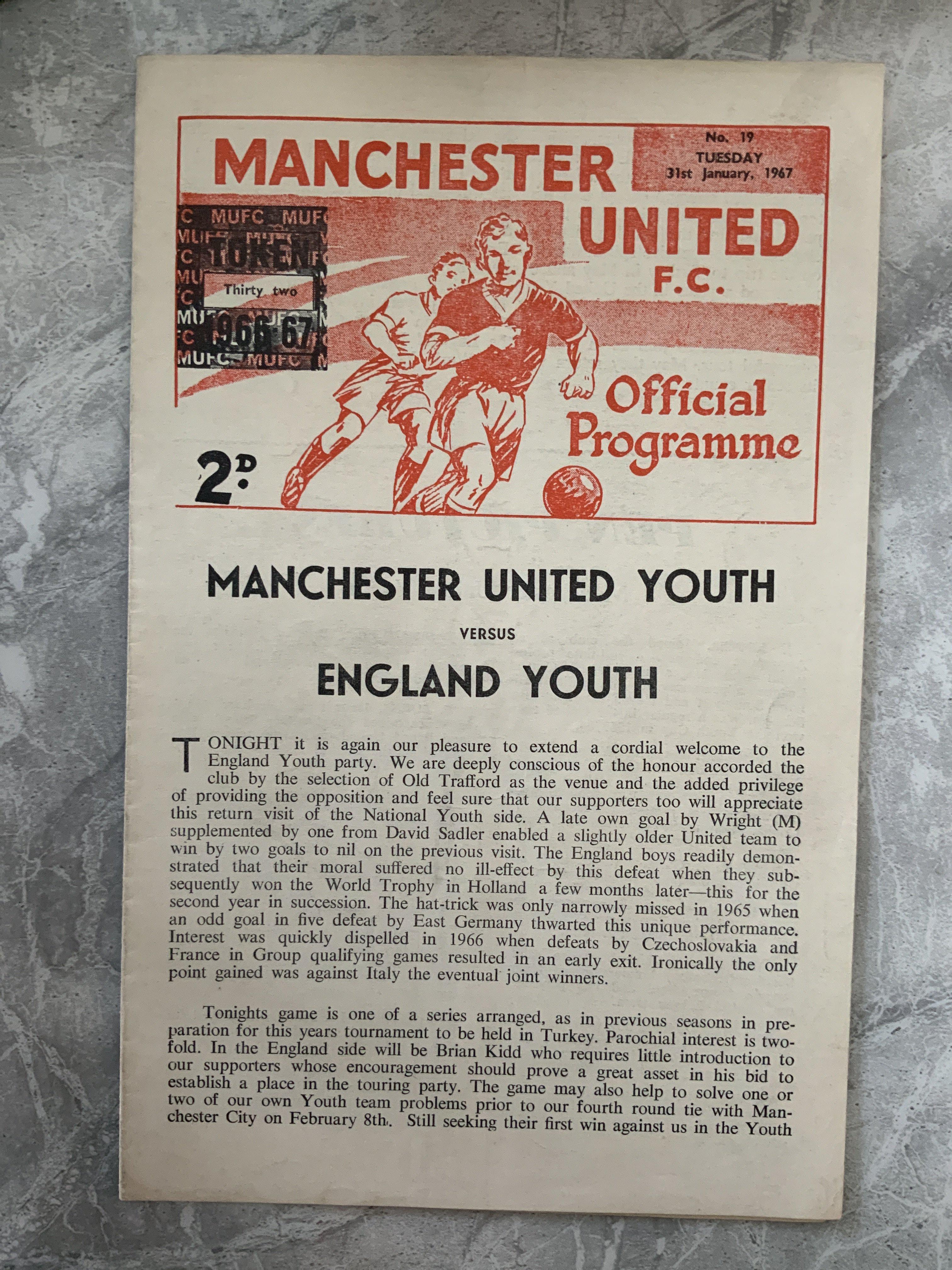 66/67 Manchester United Youth v England Youth Football Programme: Near mint condition 4 pager dated 31 1 1967. No team changes and token intact. England Youth team has Brooking Shilton Royle Todd Mills and Kidd playing.