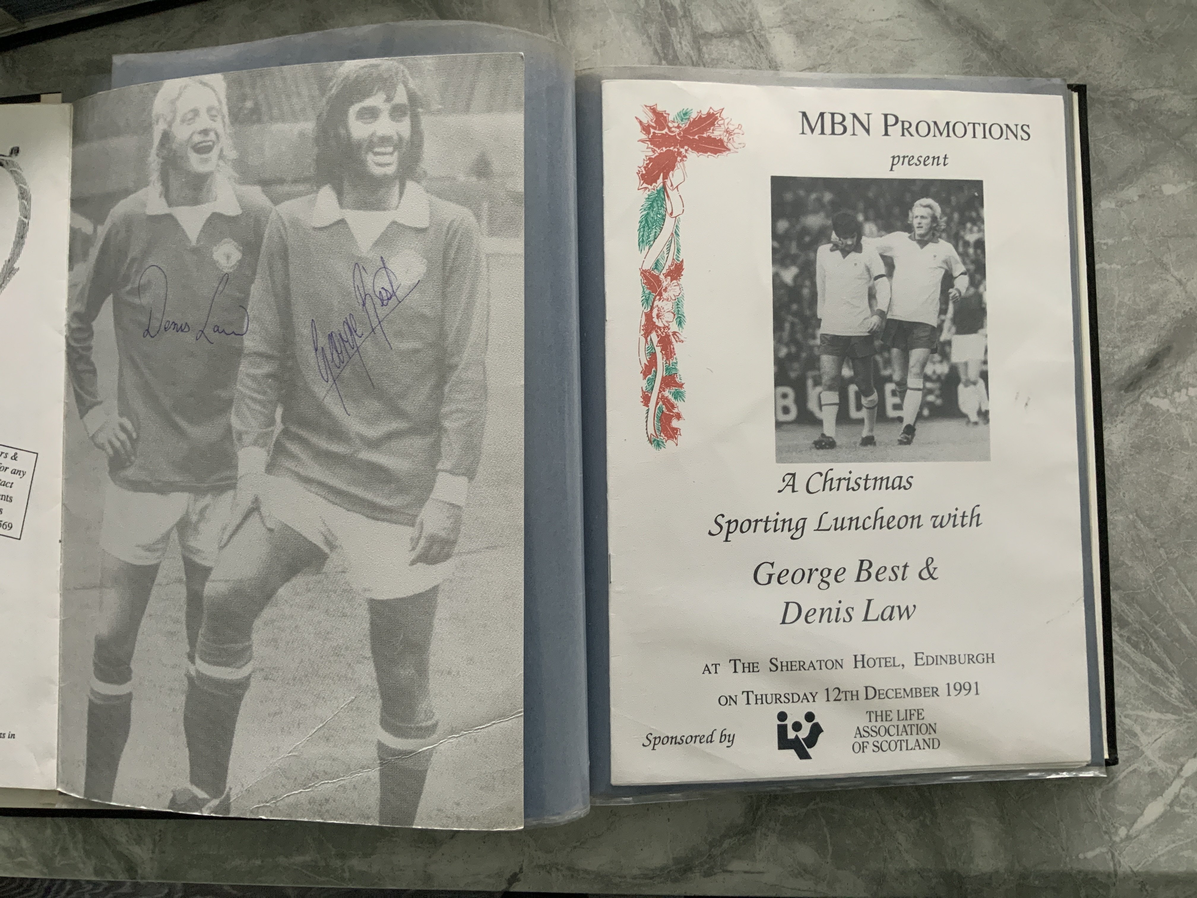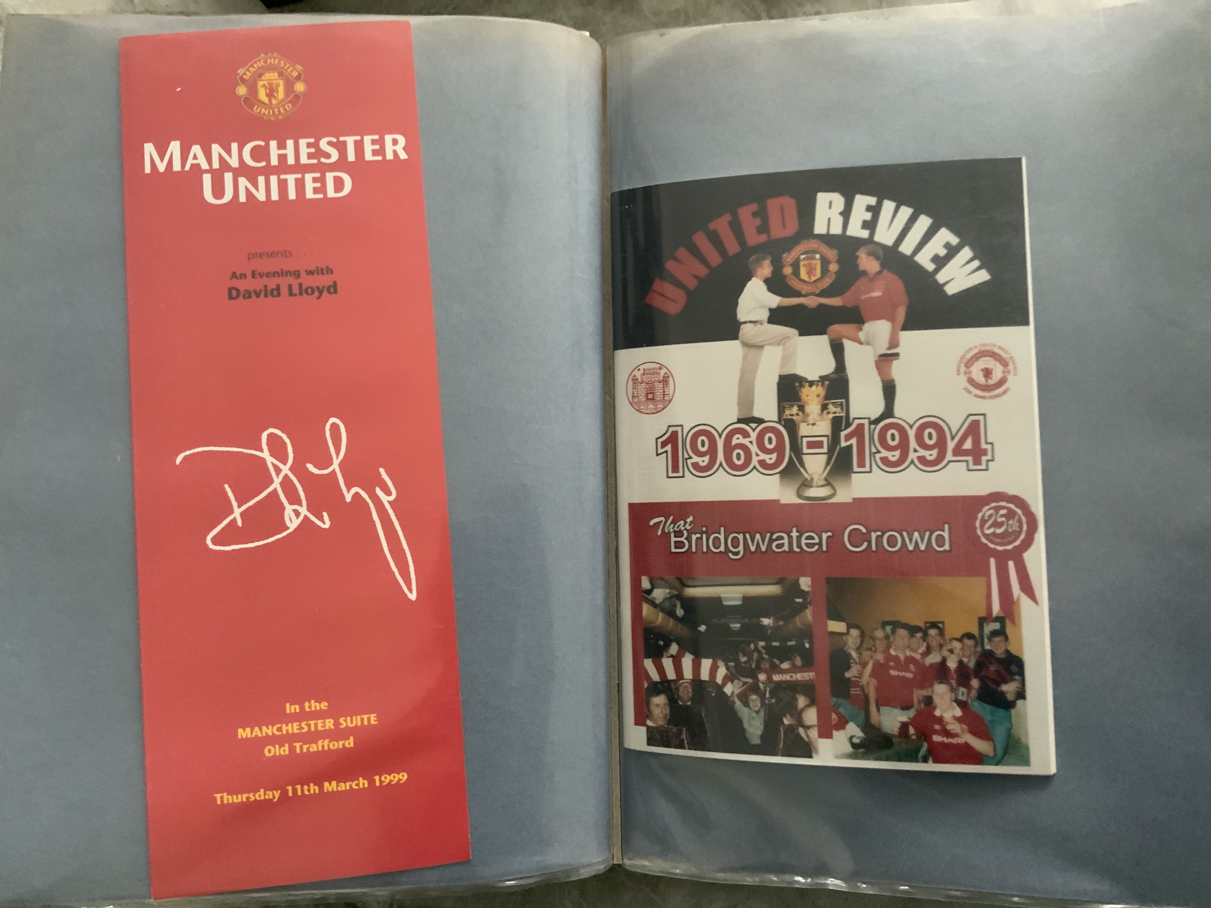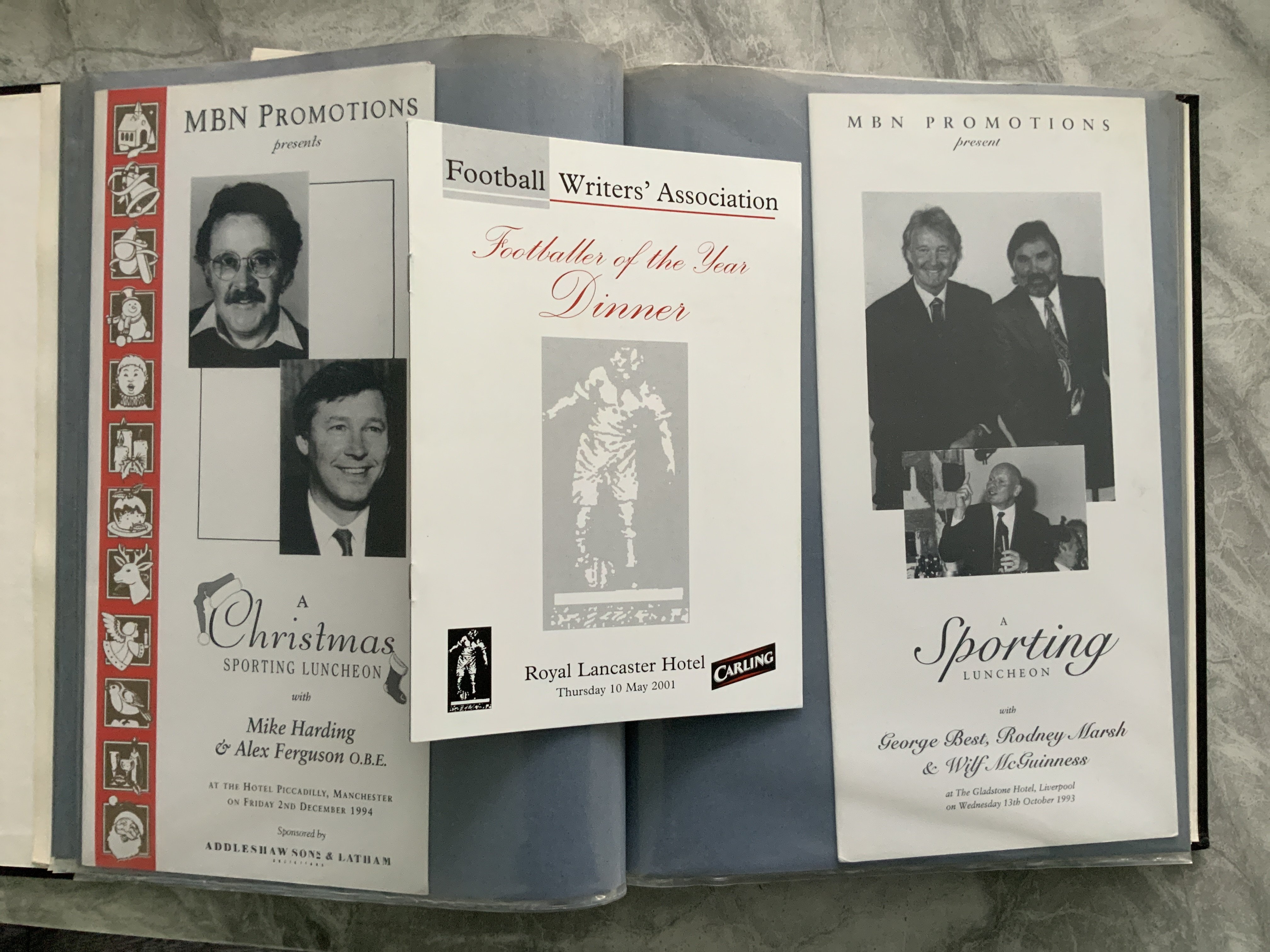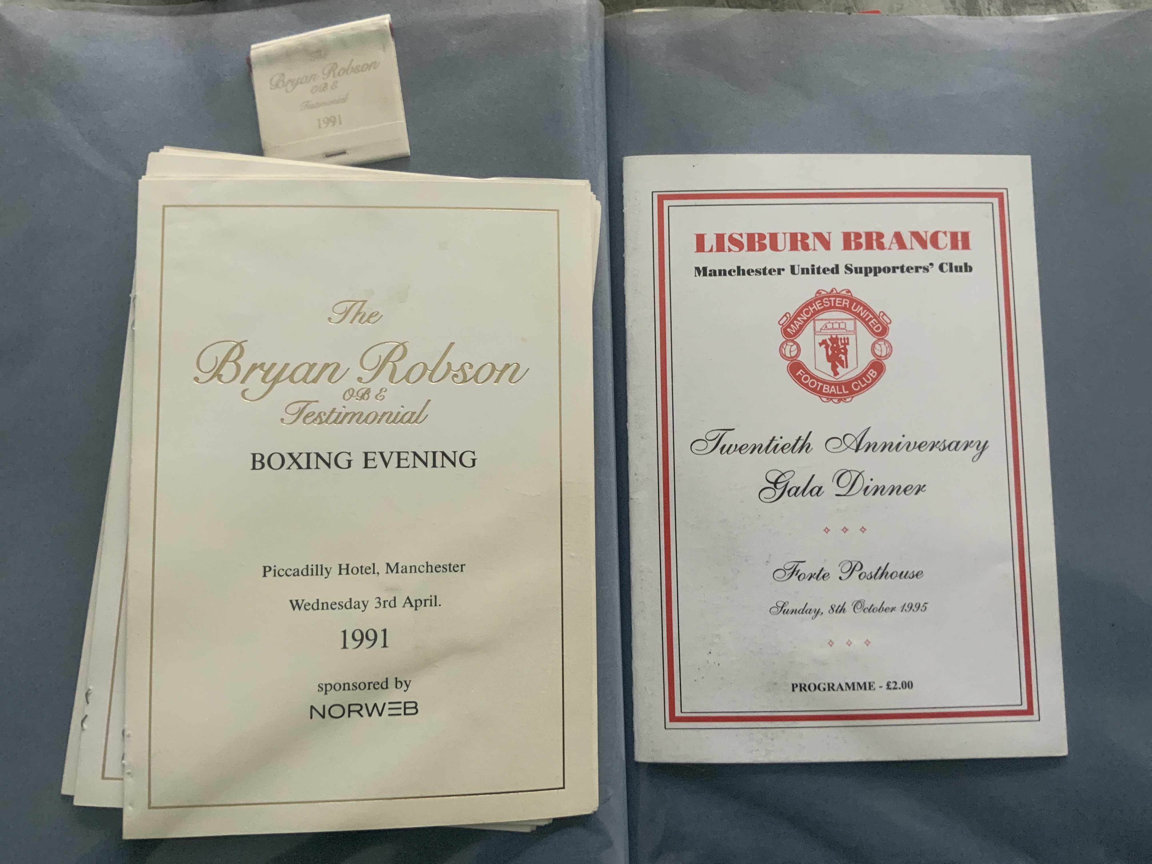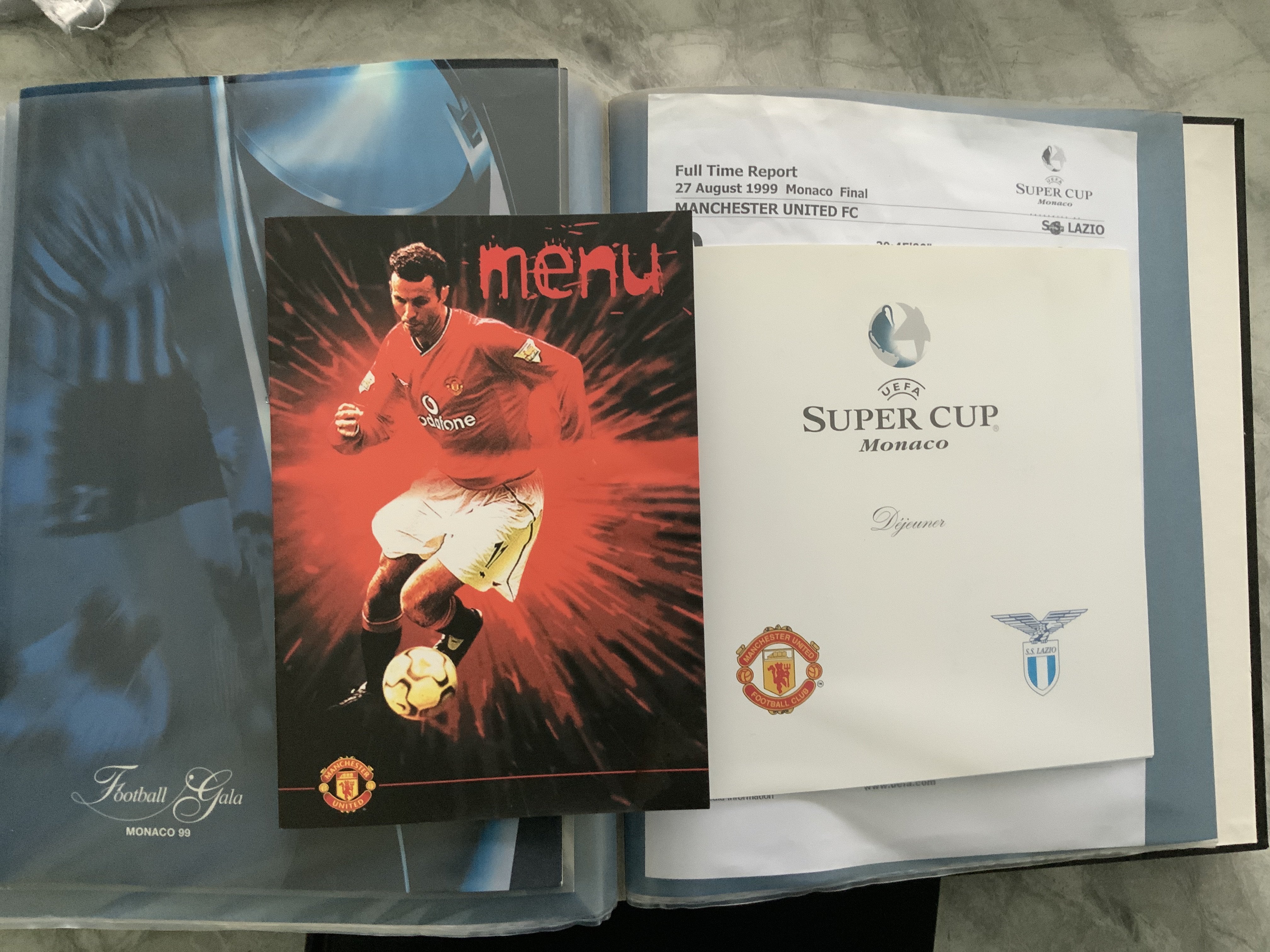 Manchester United Football Menu Collection: Superb collection from the 1990s kept in two purpose made binders embossed Manchester United Menus. Covering players such as B Robson Ray Wood Alex Stepney and Ryan Giggs. Good menus from the 1999 Super Cup Final plus the odd one signed including Best and Law. 32 menus with slight duplication.