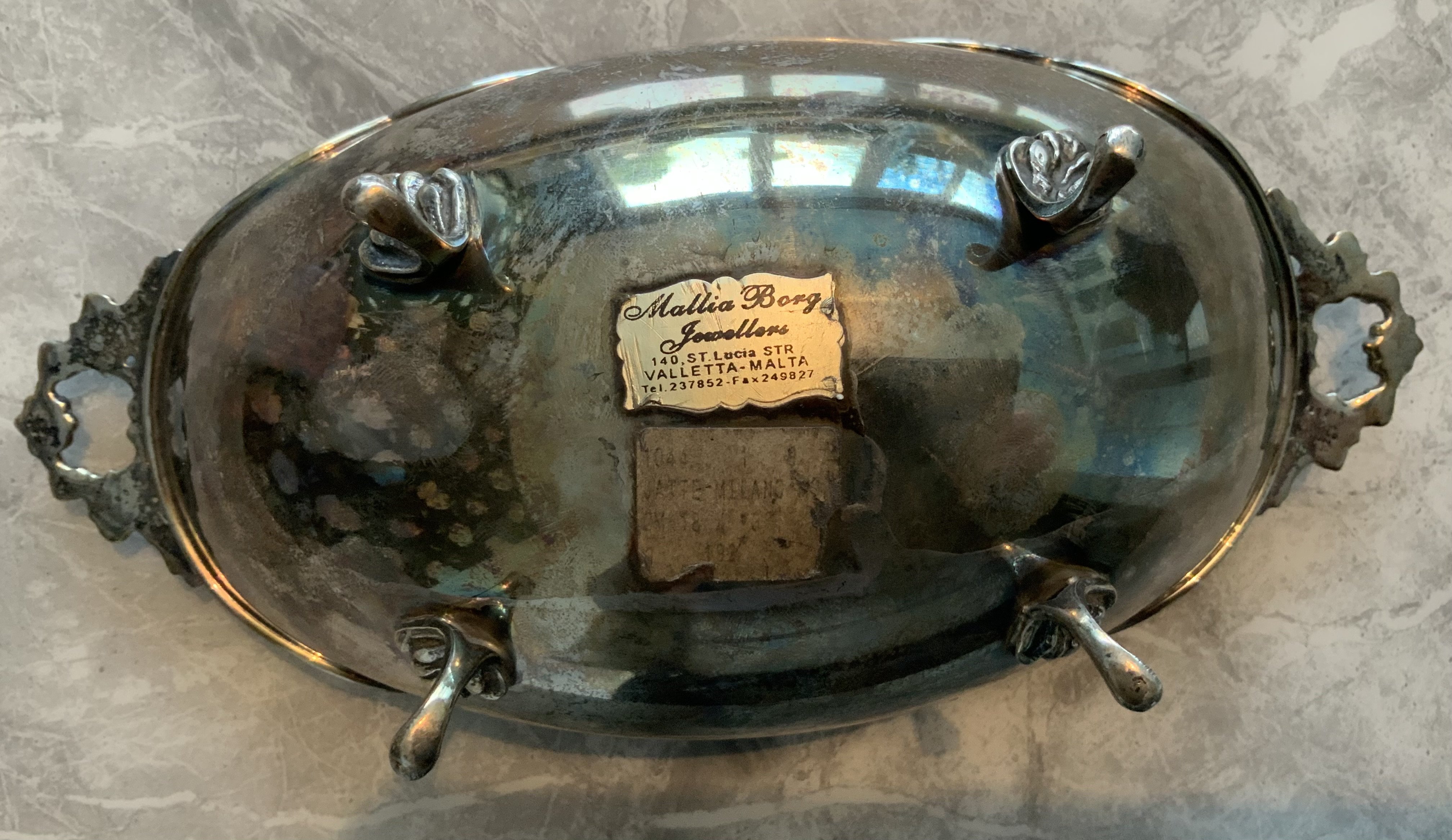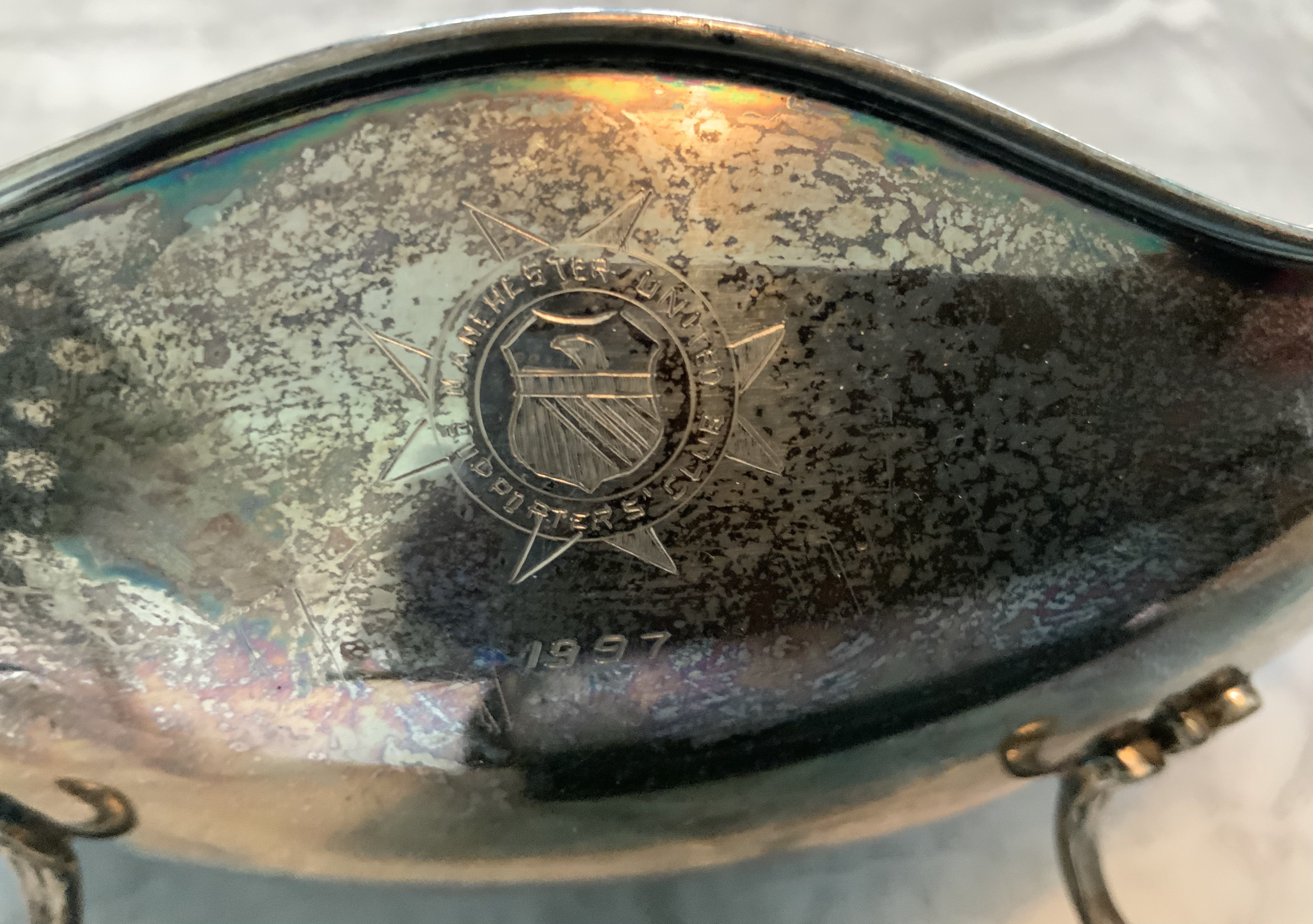 Manchester United Football Supporters Club Players Gift: Silver coloured dish issued by the Malta Supporters Club in 1997. Silver is tarnished but you can just make out the Manchester United Supporters Club logo. Believed to be former property of Gary Neville.