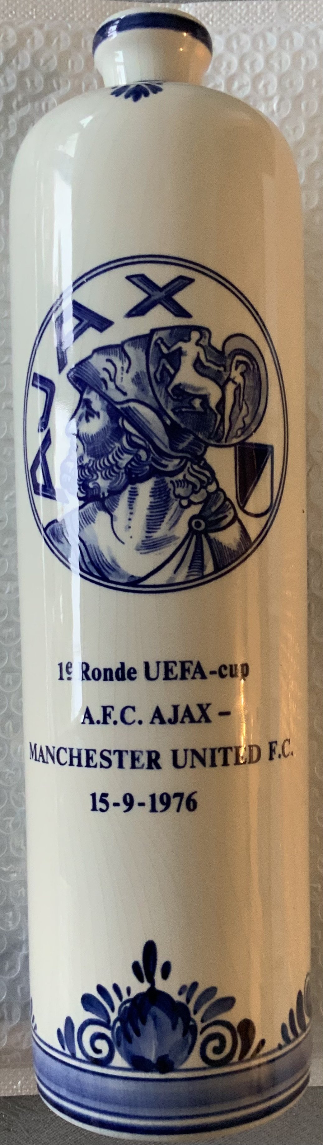 Manchester United 1976 Delft Football Players Gift: Rare very limited edition ceramic large bottle. Made by famous maker Delft for Manchester United touring party for the UEFA Cup match Ajax v Manchester United on 15 9 1976. Match details and date to item with the Ajax logo and Jonge Bols sticker. Ltd edition pieces are rare from this maker. Cork is stuck in the neck which may have had a different top. Beautiful piece measuring just over a foot high.