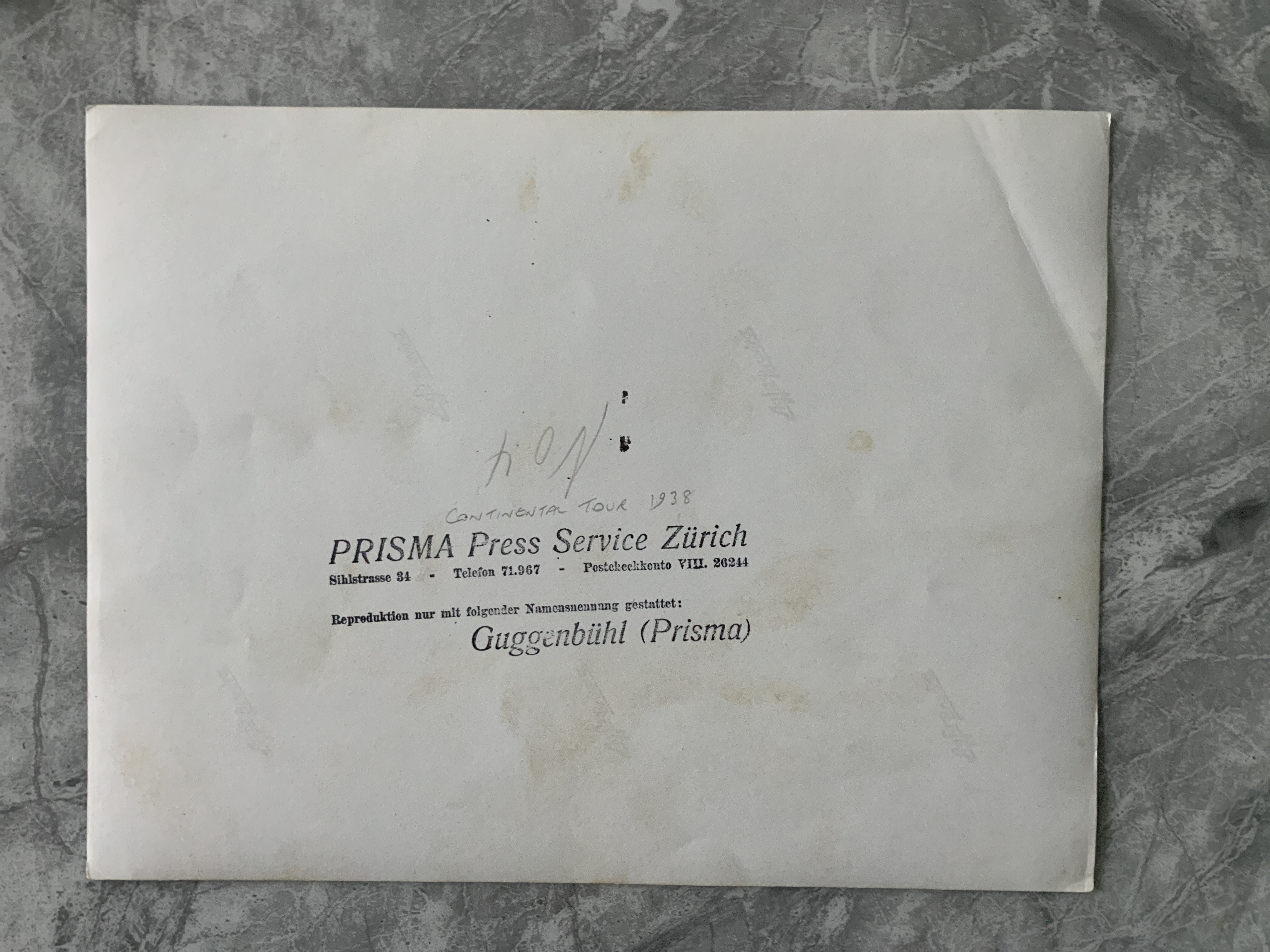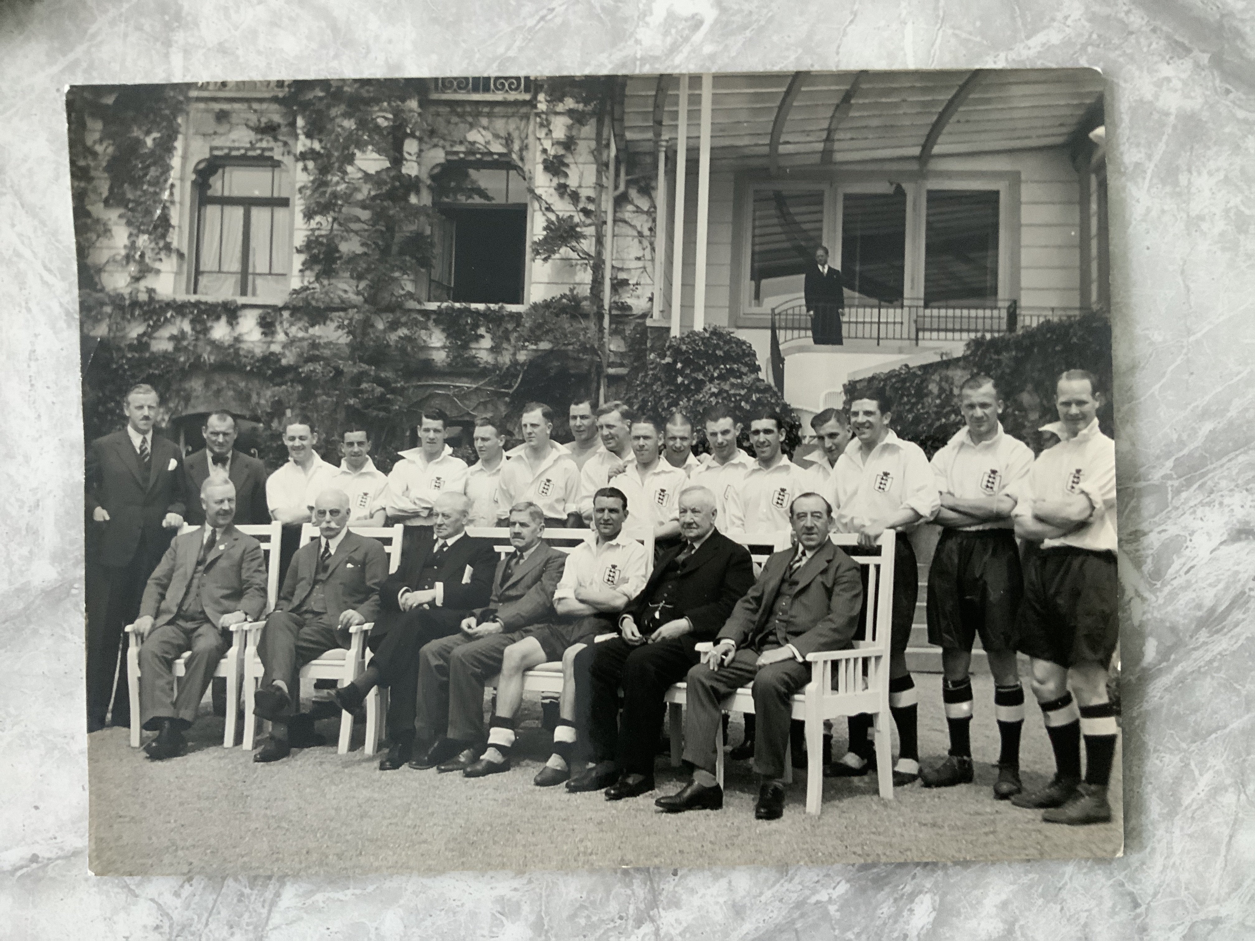 1938 England Football Squad Press Photo: Superb original black and white team group with Zurich press stamp. Squad in back row with management sitting in front. Excellent condition 10 x 8 inch photo taken in May 1938 on the tour to Switzerland.