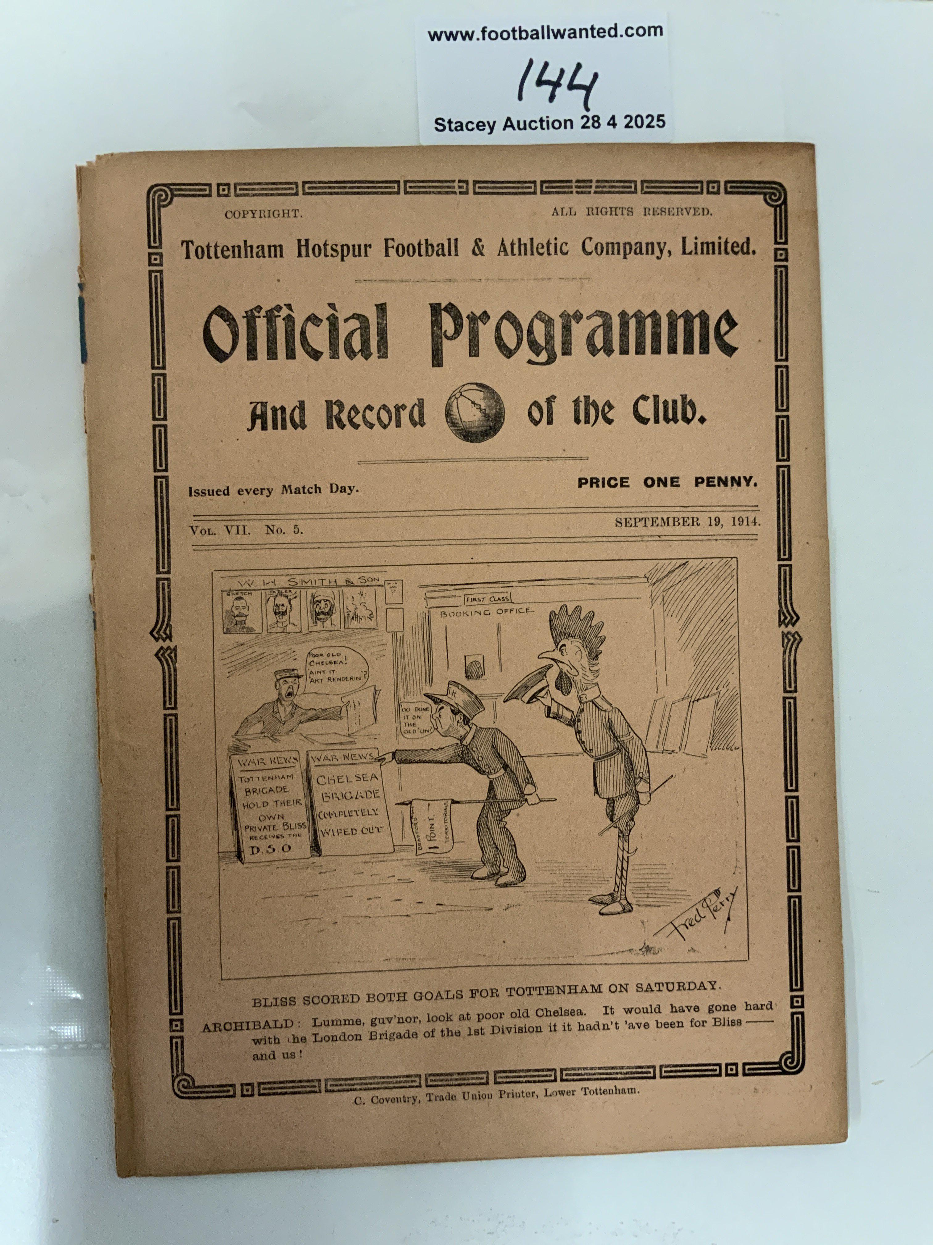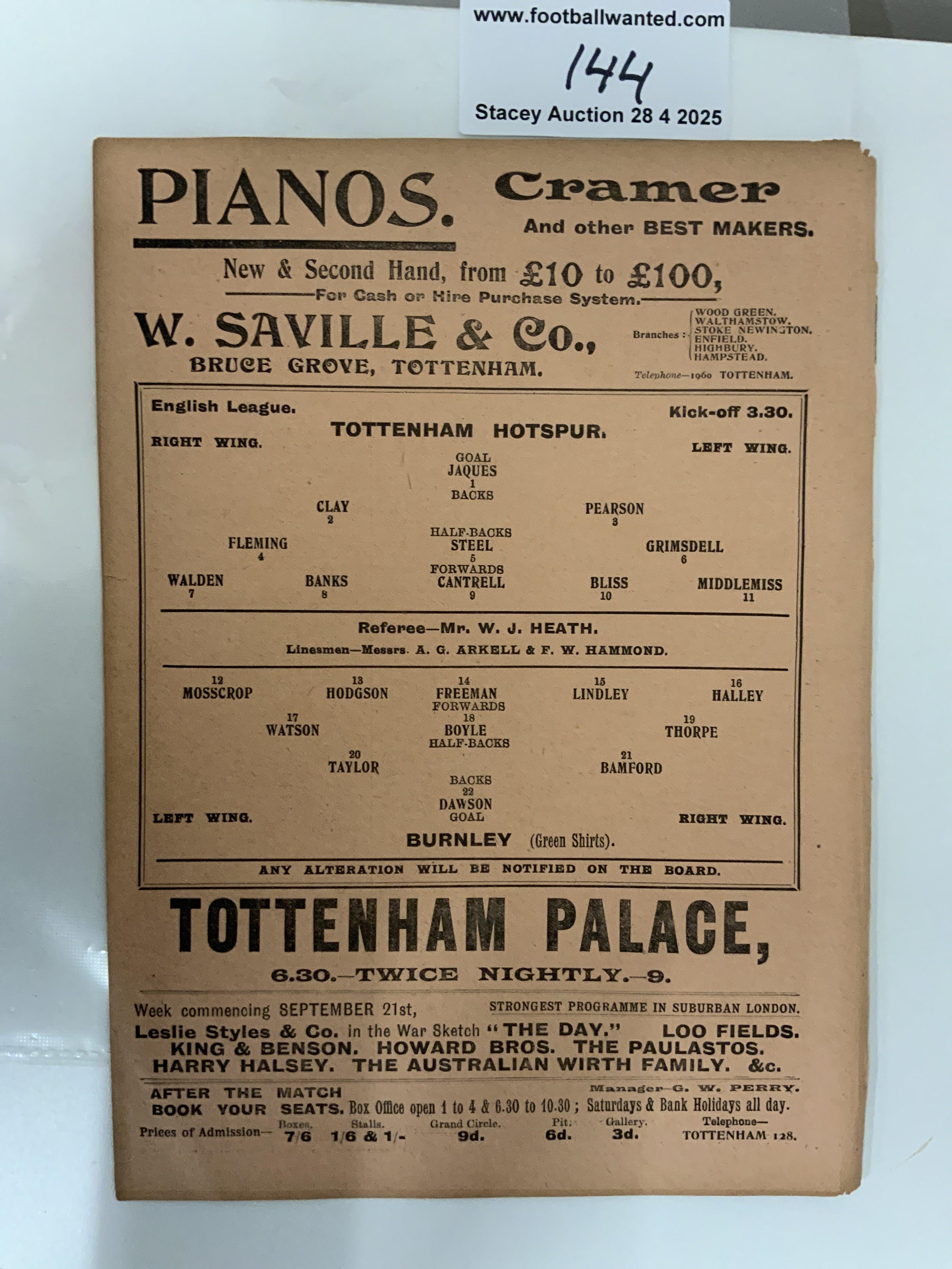 1914 - 1915 Tottenham v Burnley Football Programme: First division match dated 19 9 1914 which was just after the start of World War One. Excellent condition ex bound with covers. No writing. Spurs were relegated.
