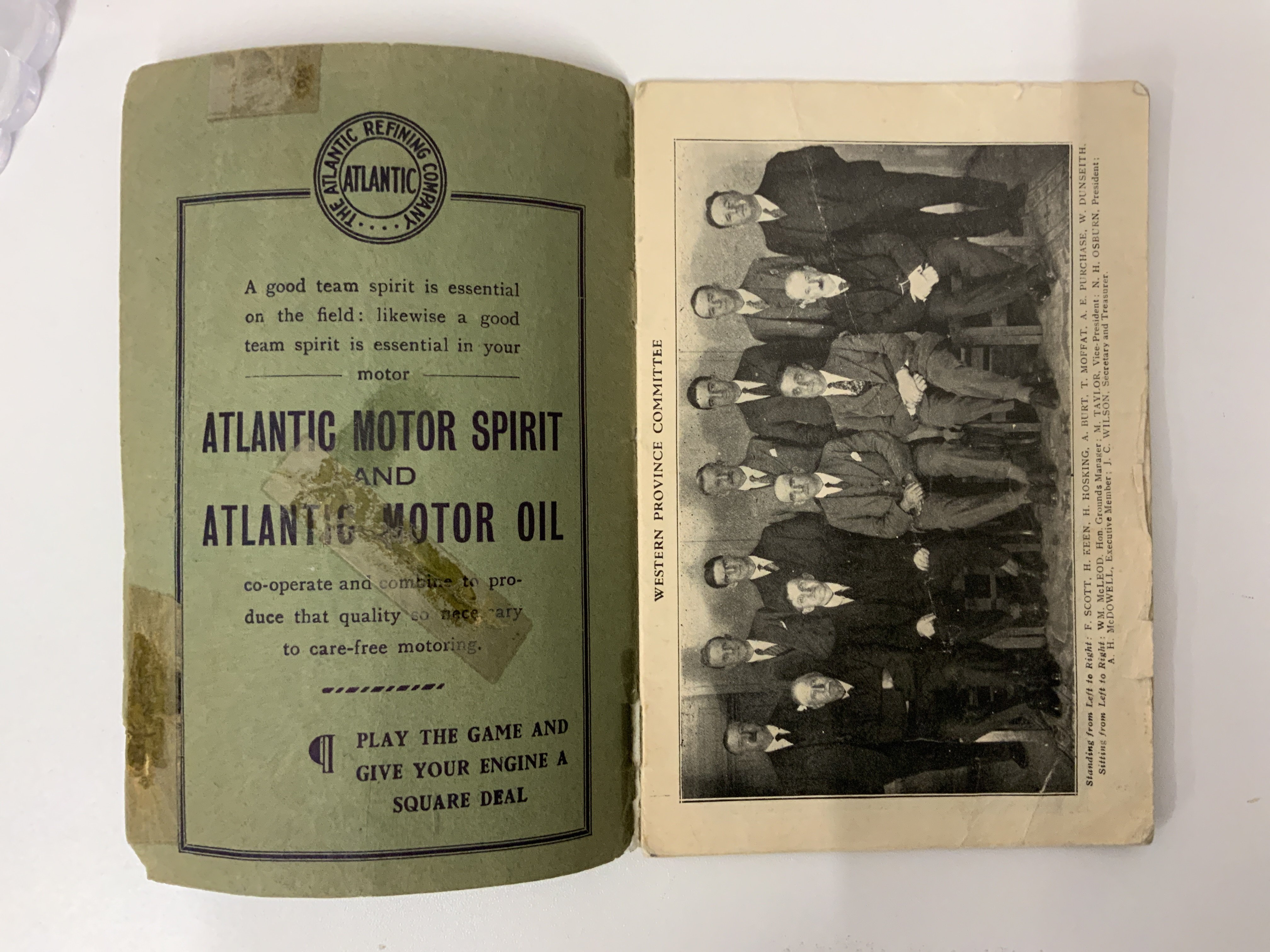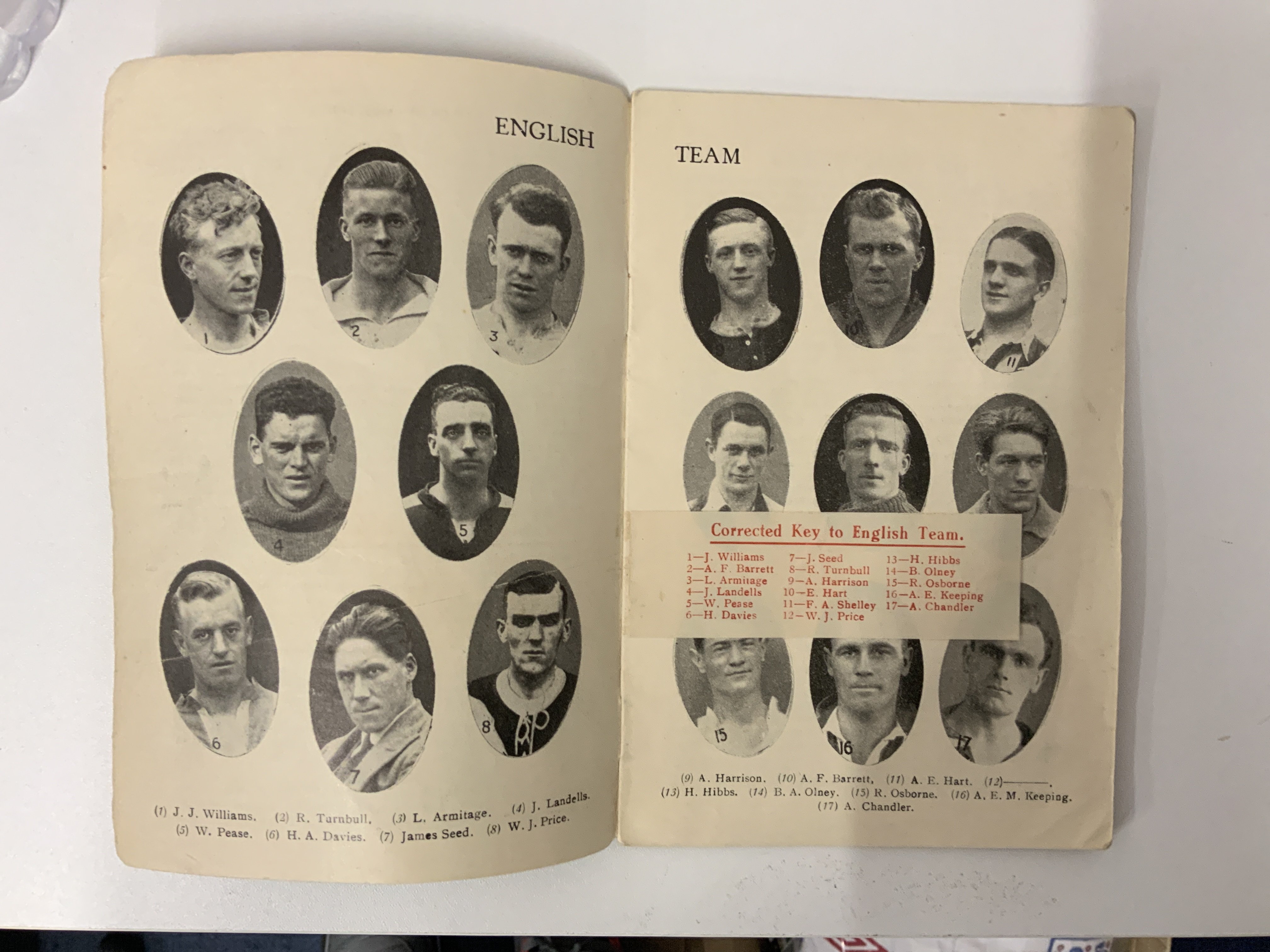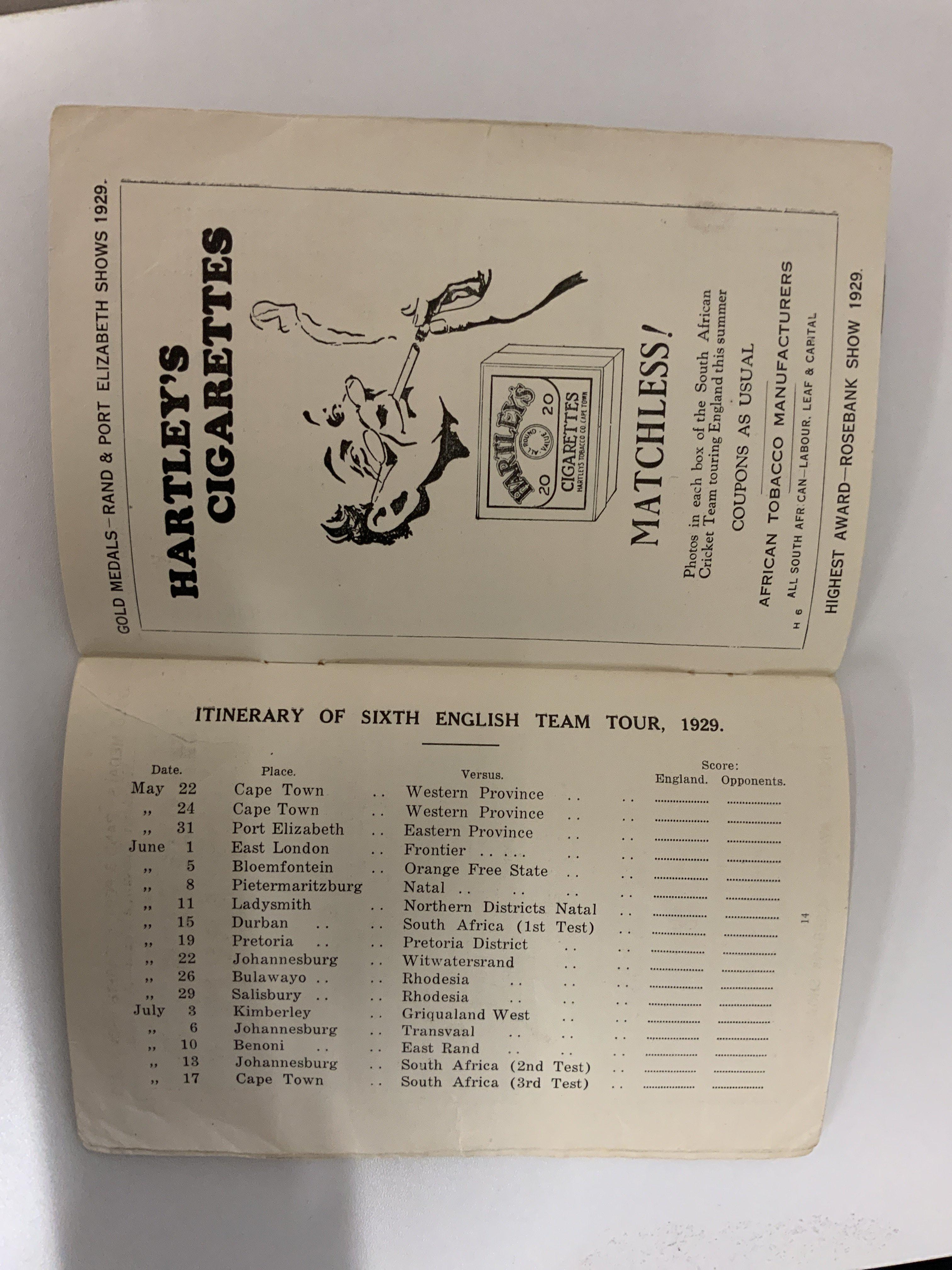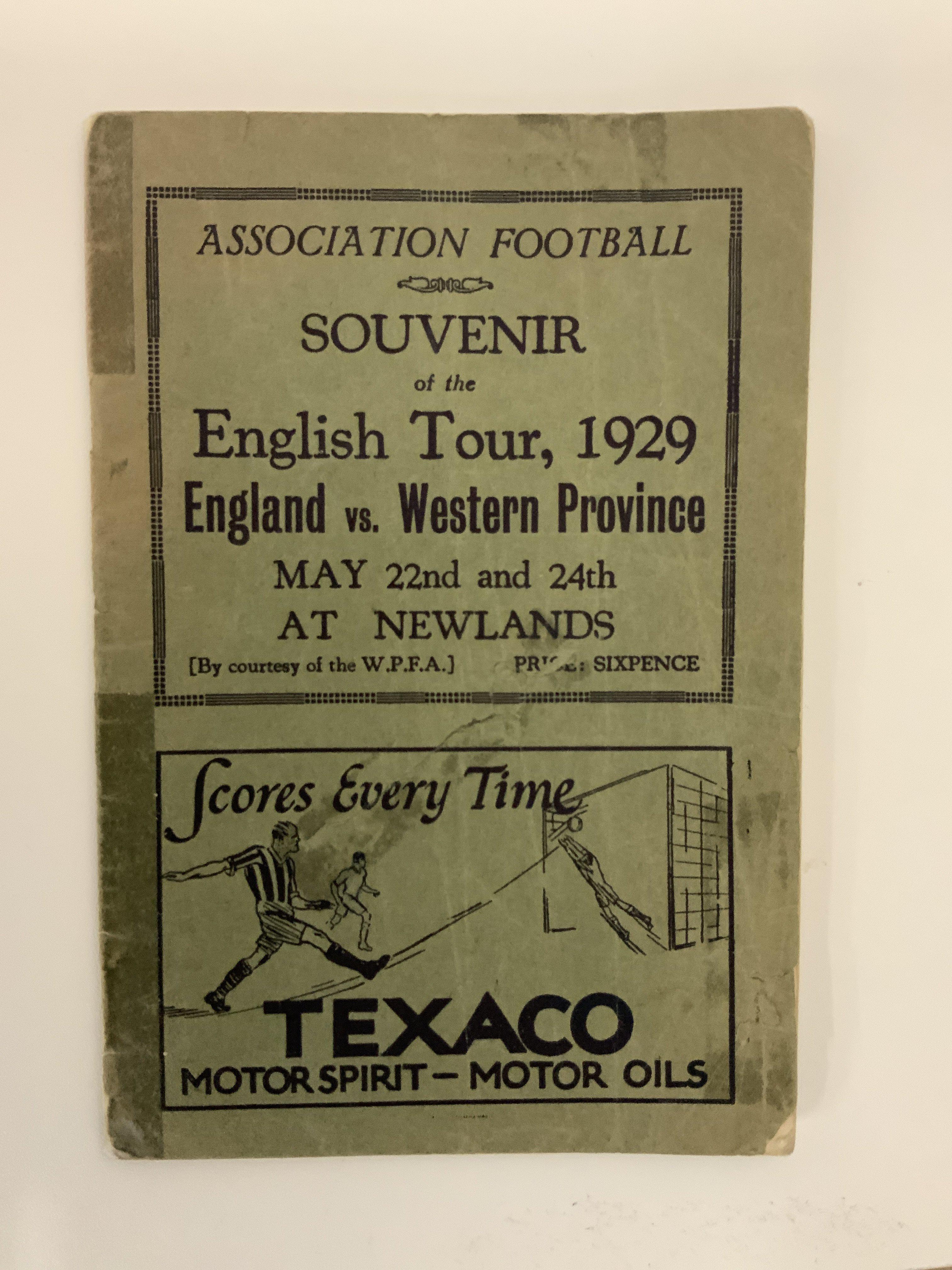 1929 English FA Tour To South Africa Guide Book: 22 page guide listing fixtures and English players touring etc. Back page has strip missing not affecting any text. There is tape also. Unusual item.