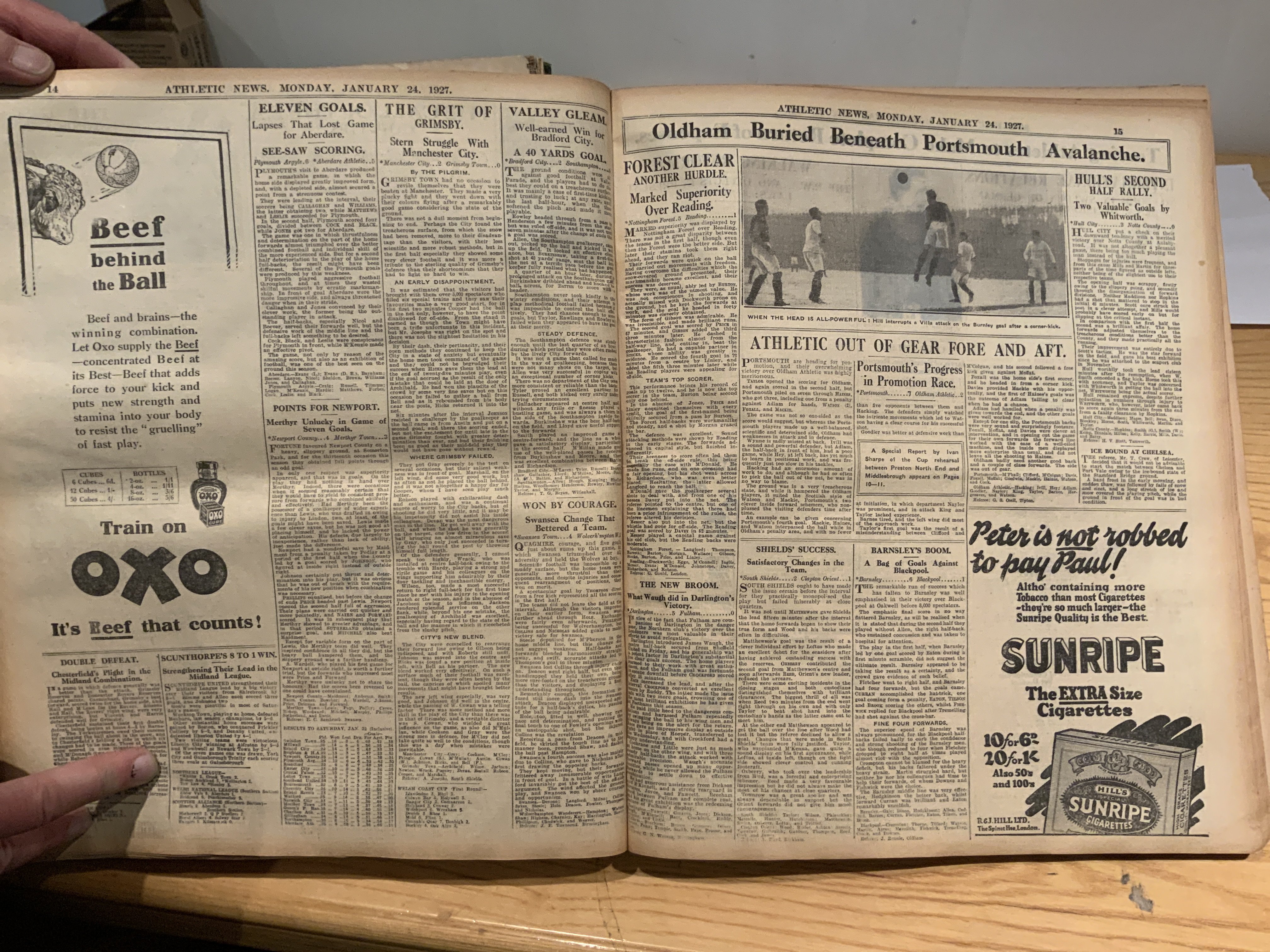 1926 - 1927 Athletic News Bound Volume Of Sport Magazines: From August 2nd 1926 to May 9th 1927 and we believe this is a complete run of the weekly newspaper. Every volume covers football including the Cardiff v Arsenal FA Cup final. Big feature on Portsmouth promotion back to division one. Other sports include Ashes Cricket Rugby Union + League Athletics Running and more. Small format heavy bound volume of which outer board has become detached.