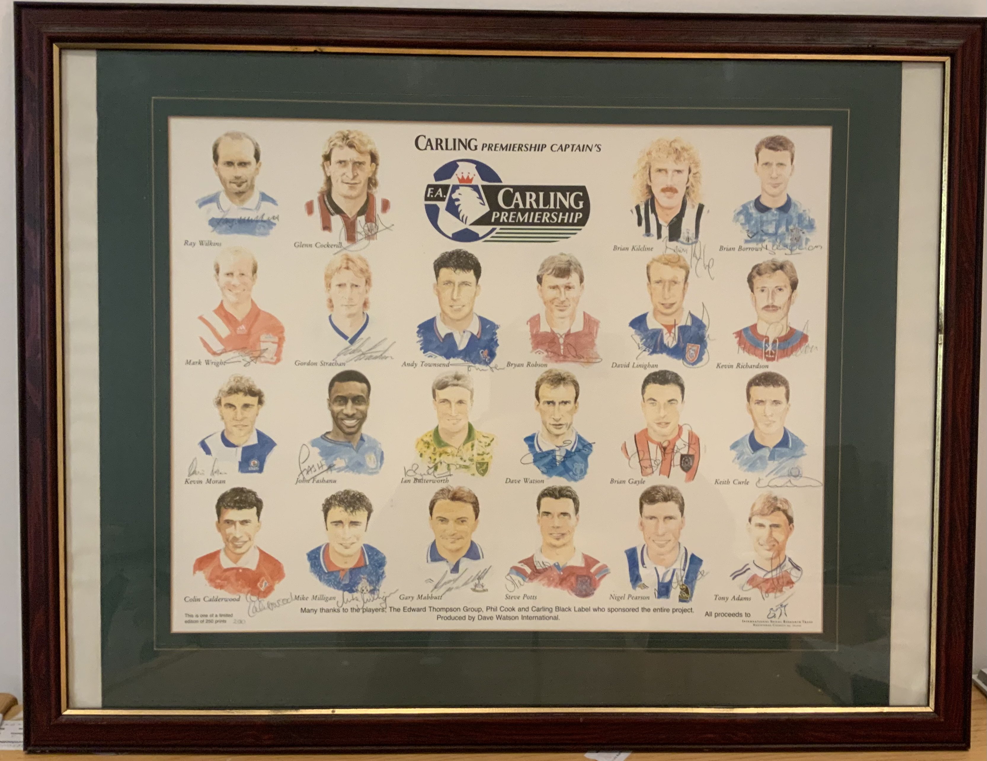 Premier League 92/93 Signed Framed Team Captains Football Print: Rare chance to obtain a limited edition number 200/250 of a caricature of all 22 captains in the first Premier League season each one hand signed. Manchester United were champions this season and are represented by Bryan Robson. Other captains include Ray Wilkins QPR, Tony Adams, Gary Mabbutt, John Fashanu and Dave Watson who organised this signing on behalf of spinal research. Frame measures 34 x 27 inches and is not for posting unless removed from frame.