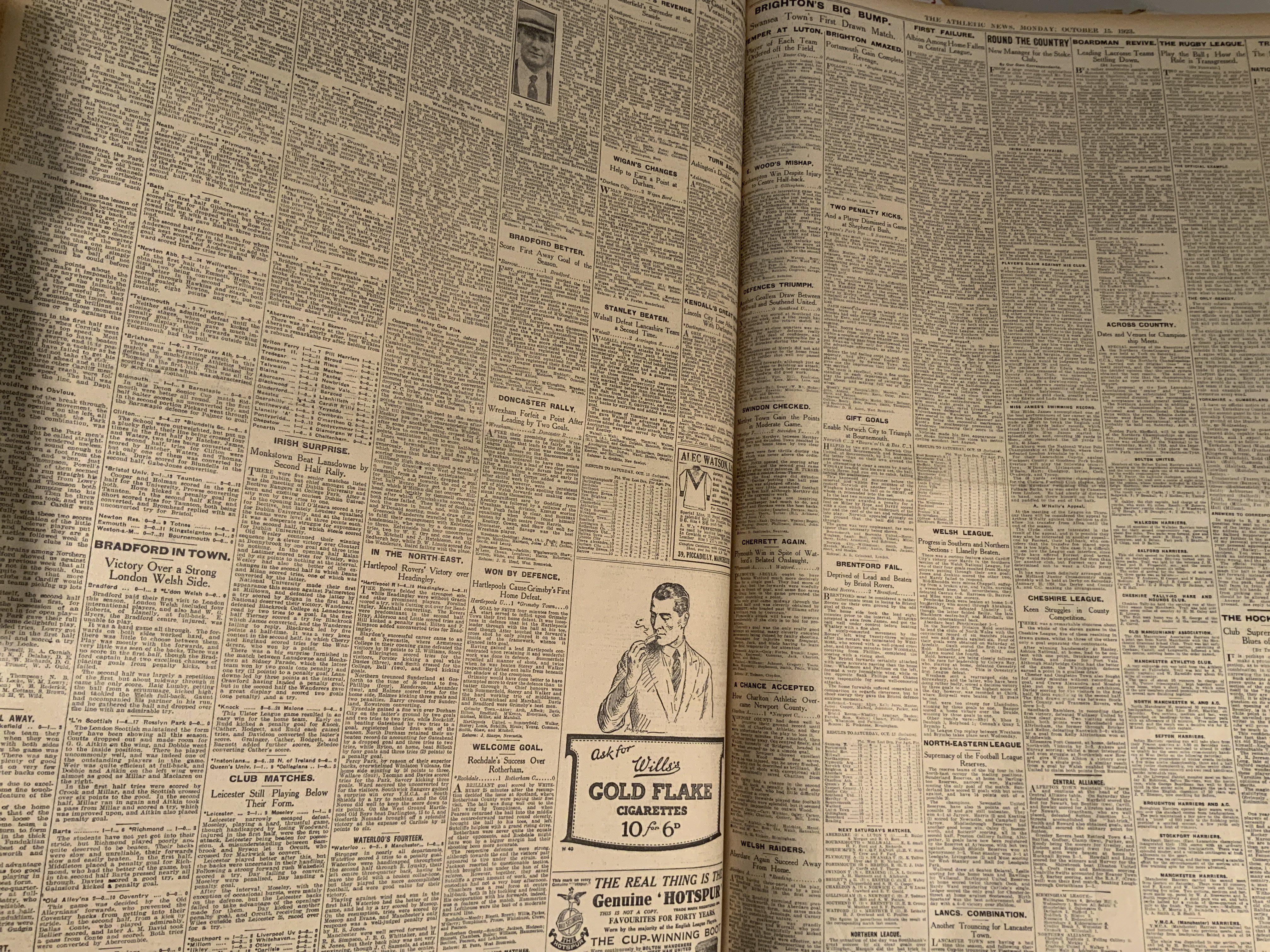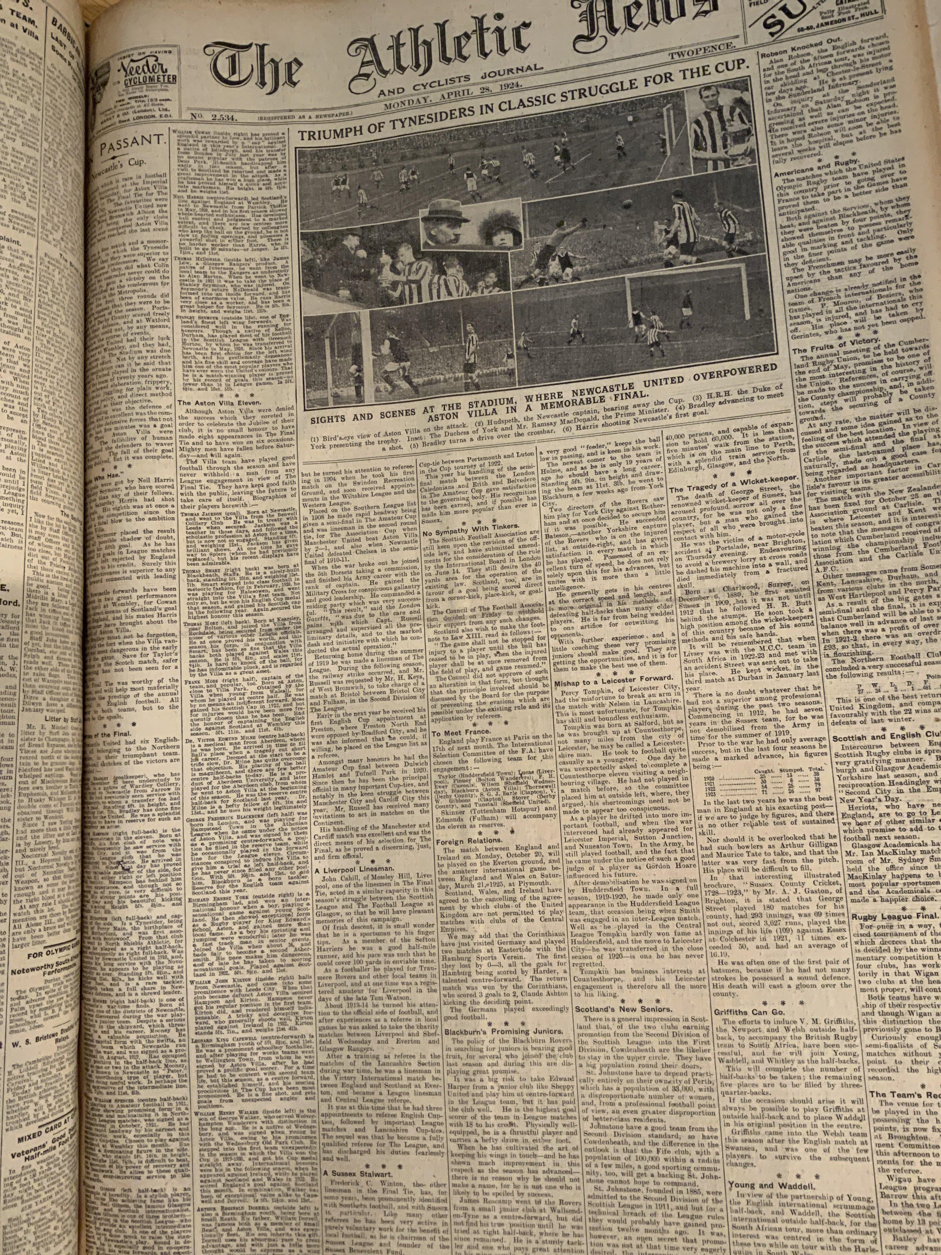 1923 -1924 Athletic News Bound Volume Of Sport Magazines: From May 14th 1923 to May 12th 1924 and we believe this is a complete run of the weekly newspaper. Every volume covers football including the Newcastle v Aston Villa FA Cup final. Great features on Notts County and Leeds. Other sports included. Large format heavy bound volume. Condition is not as good as others in this run.