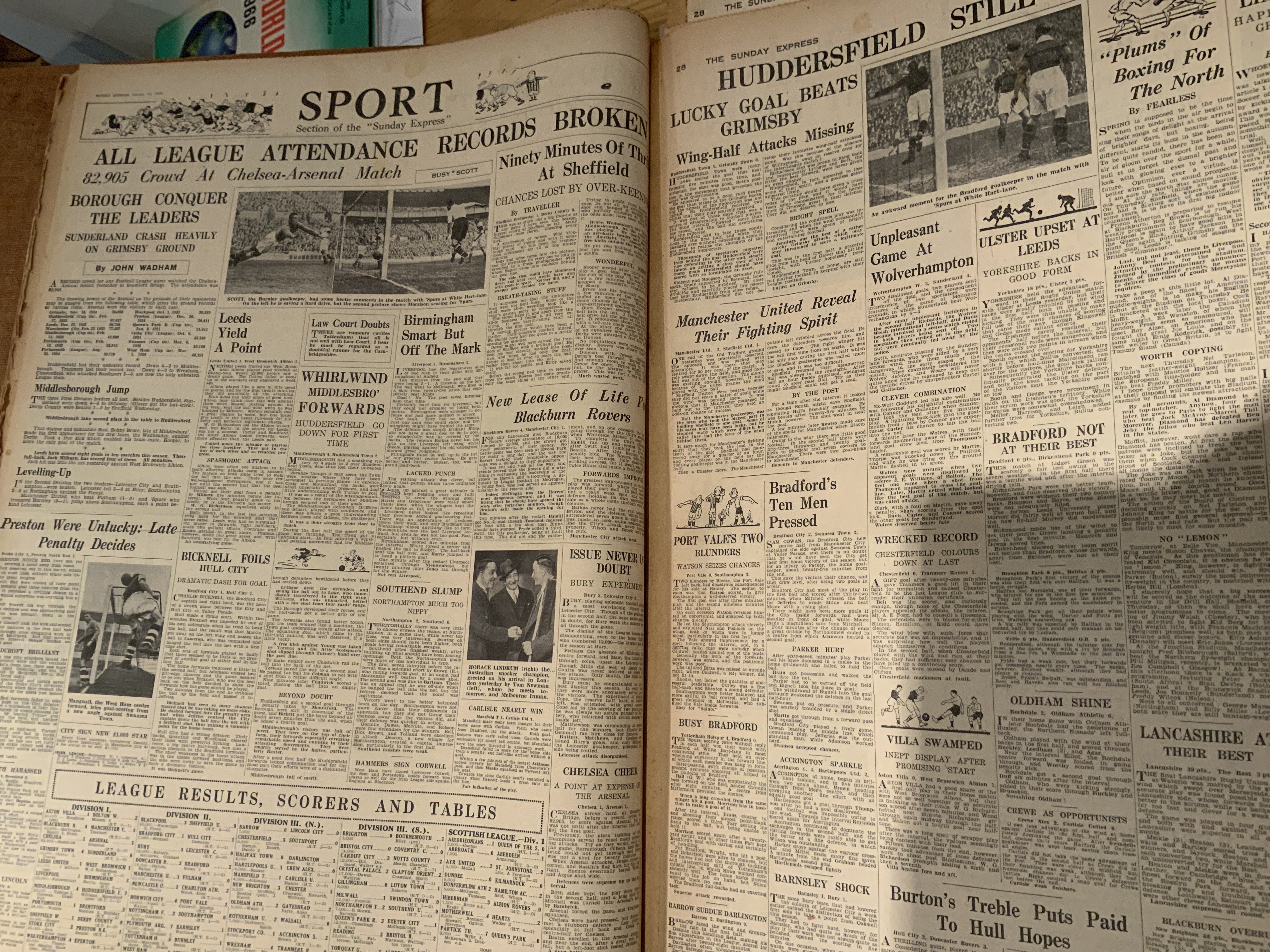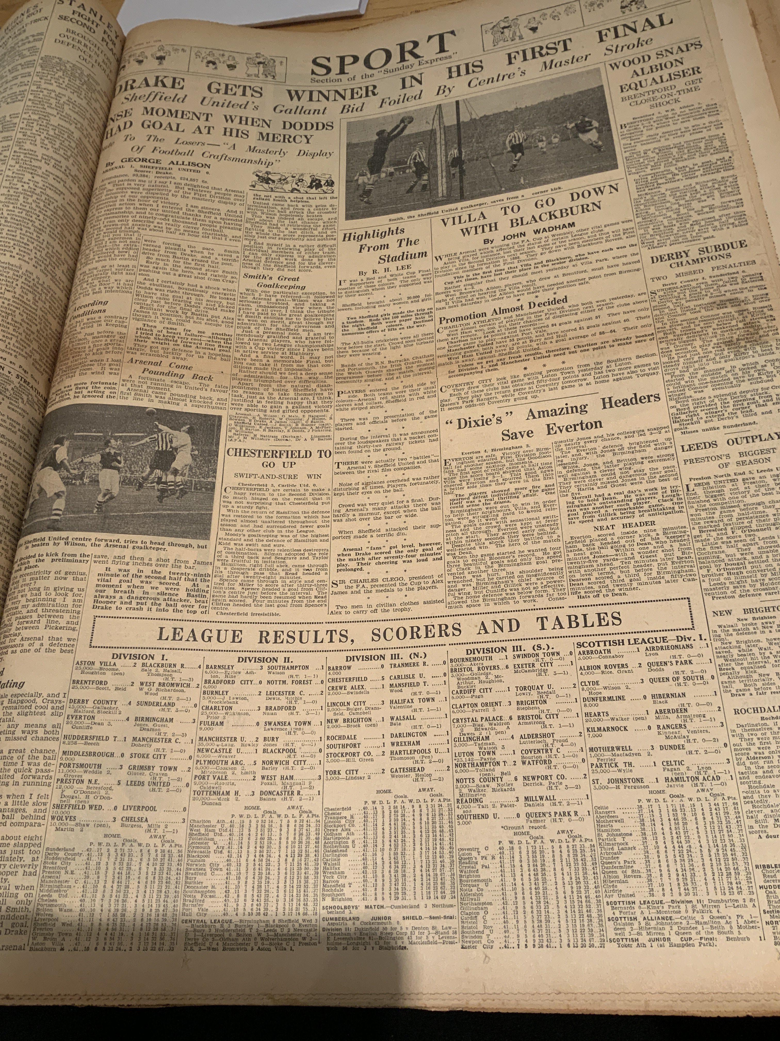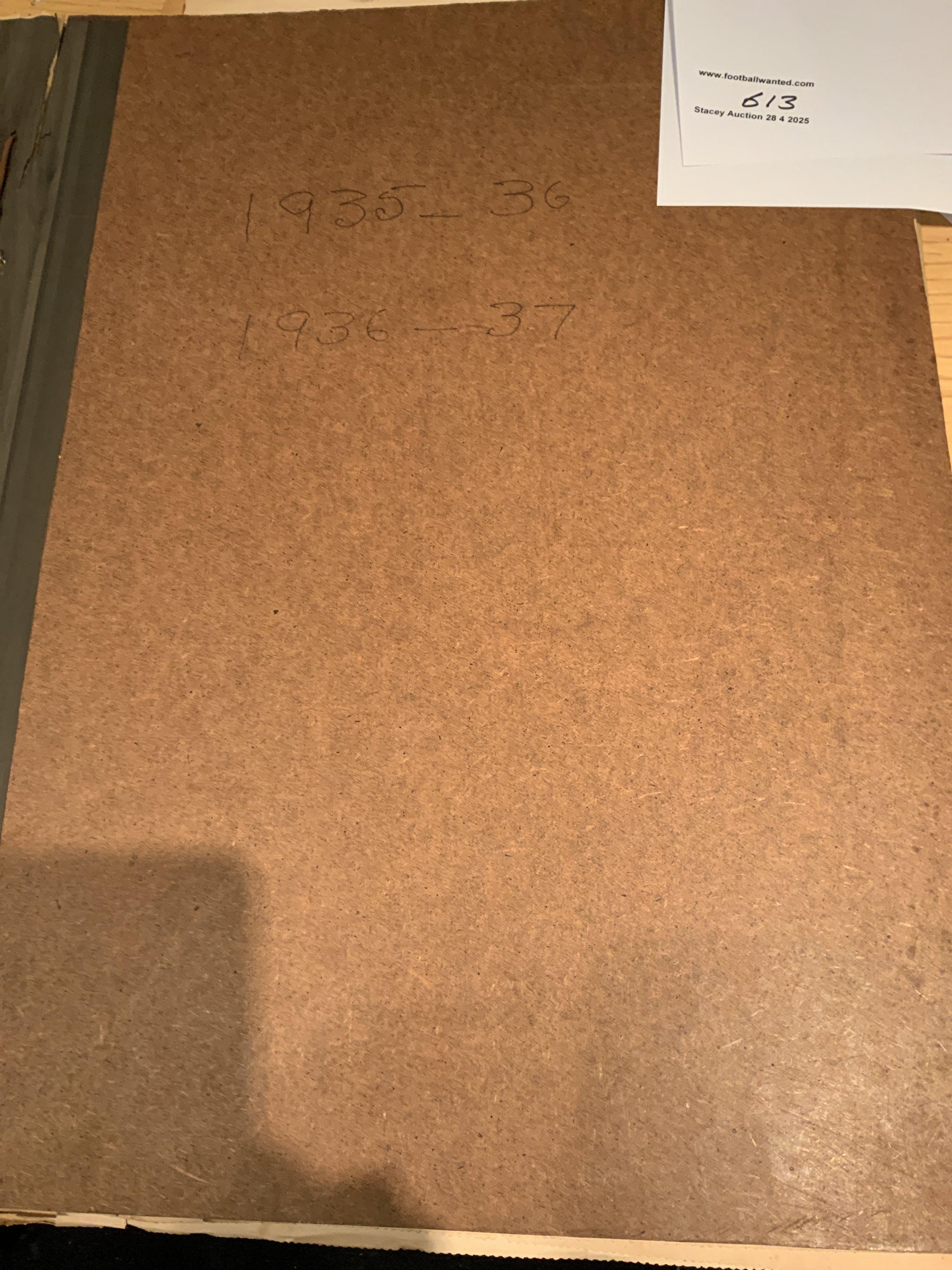 1935 - 1937 Bound Volume Of Sport Magazines: From September 1935 to April 1937 of various newspapers including Sunday Express Sport and Liverpool Echo. Great features on Arsenals 1936 FA Cup semi and final, 1935 Ireland v England, West Ham v Port Vale. Other sports included. Large format heavy bound volume with some clippings cut out. Some pages are loose from the spine.