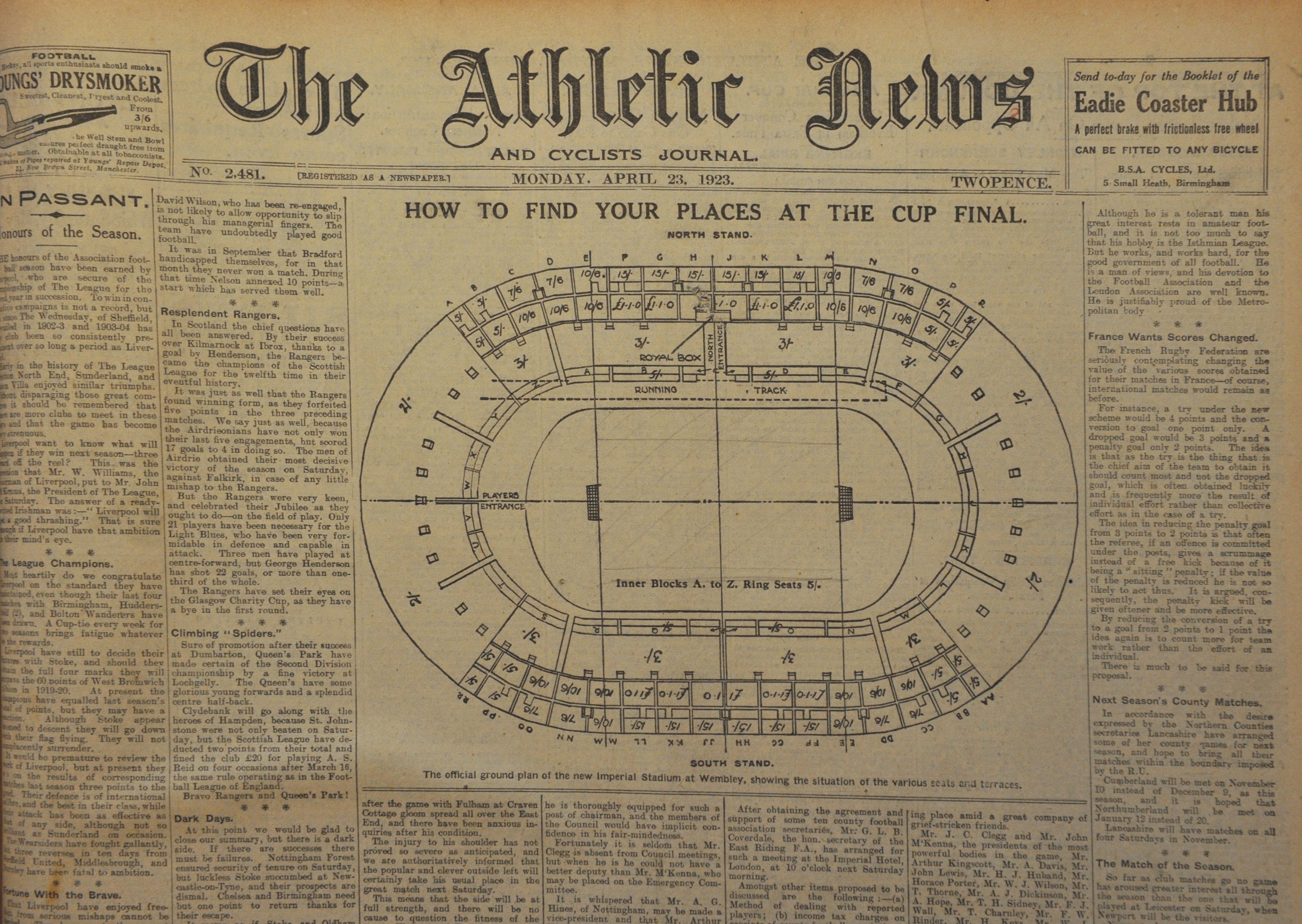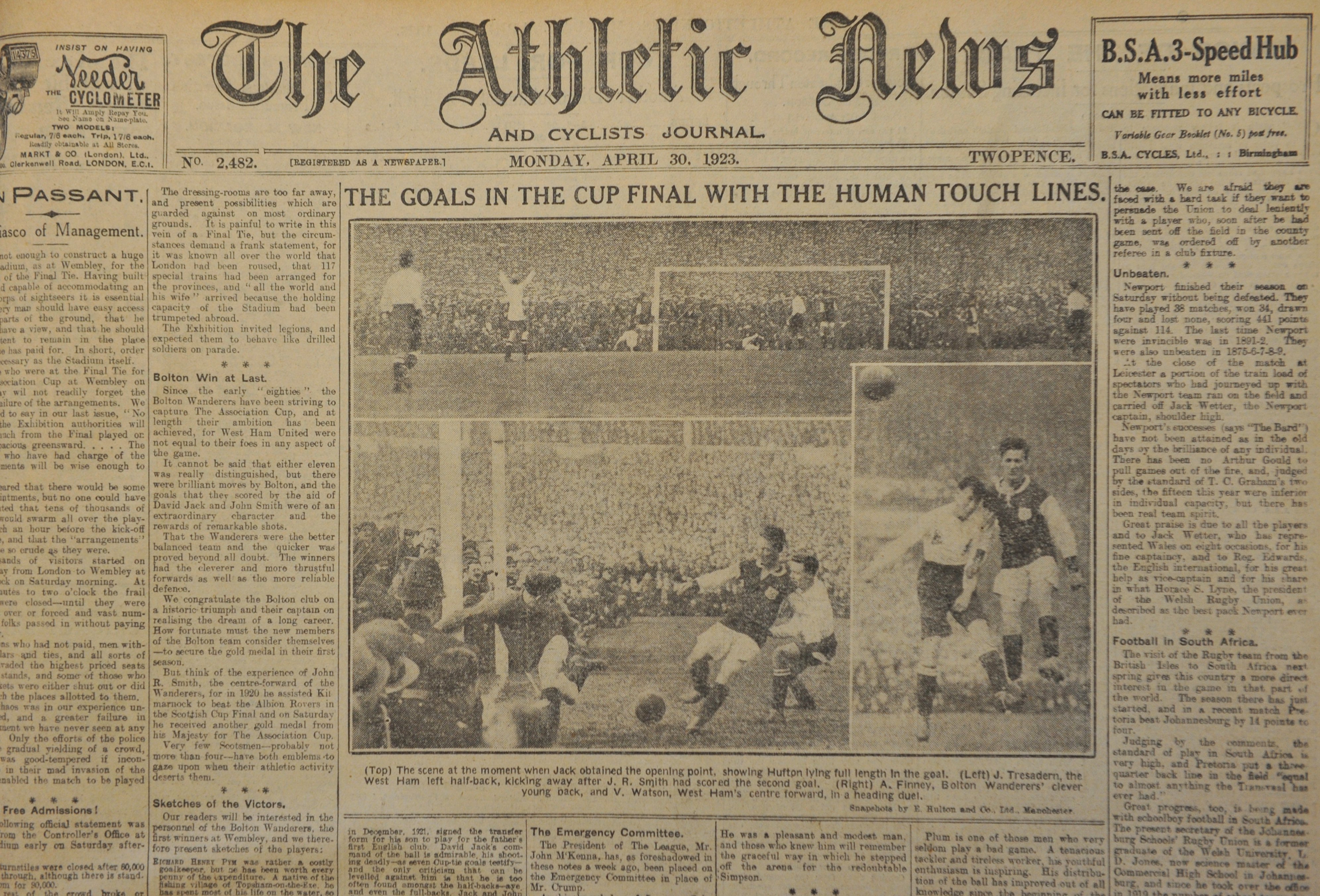 1922 - 1923 Athletic News Bound Volume Of Sport Magazines: From May 22nd 1922 to May 1st 1923 and we believe this is a complete run of the weekly newspaper. Every volume covers football including the first FA Cup final at Wembley Bolton v West Ham both before and after match plus both semi finals. Great features on Stoke City. Other sports include 1922 National Cycling Championships and Lancs v Yorkshire cricket. Large format heavy bound volume. Additionally there are several copies of the Sporting Chronicle.