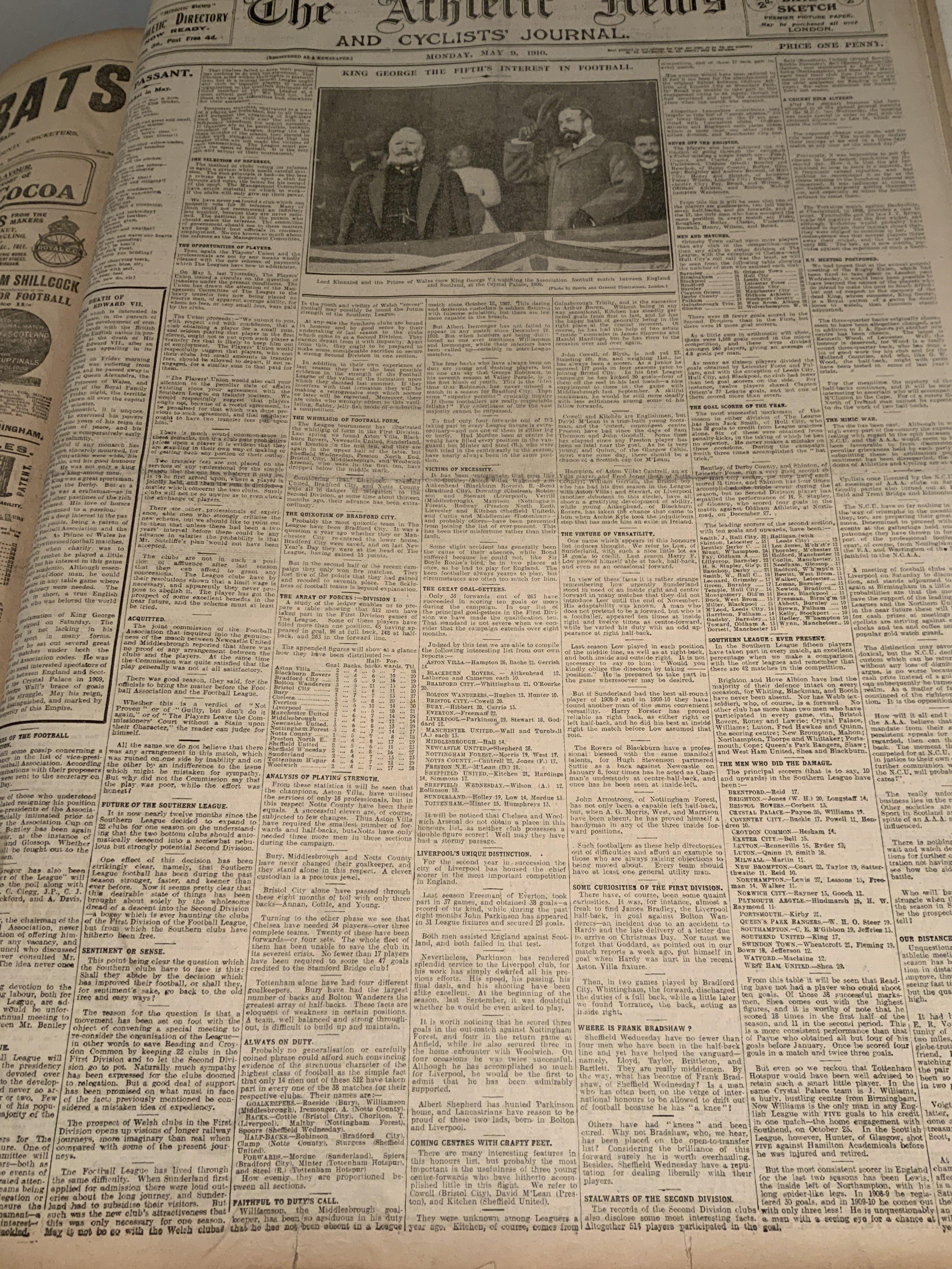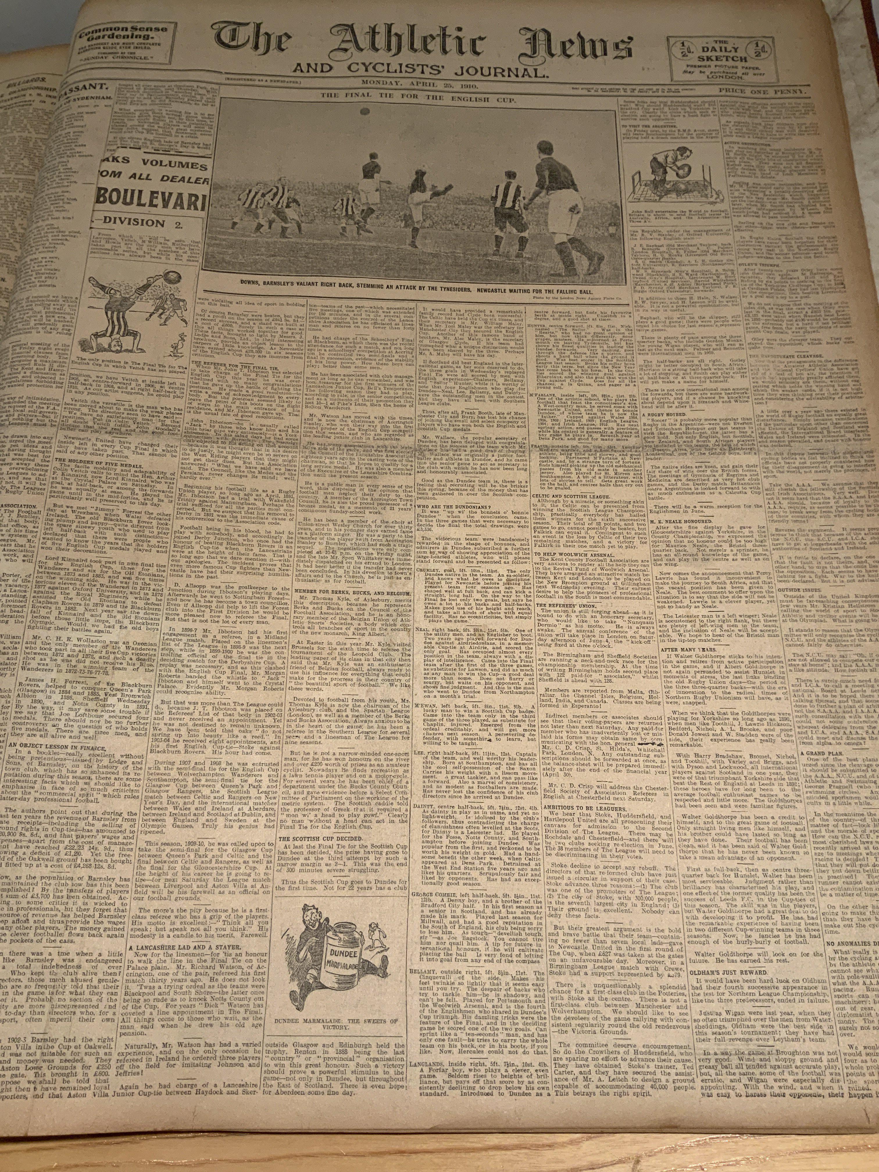 1909 - 1910 Athletic News Bound Volume Of Sport Magazines: From May 1st 1909 to June 27th 1910 and we believe this is a complete run of the weekly newspaper. Every volume covers football including the king at the Newcastle v Barnsley FA Cup final. Great features on 1st round of the FA Cup and semi finals. Other sports include 1909 Ashes. Large format heavy bound volume. Some cuttings have been taken from a few pages.