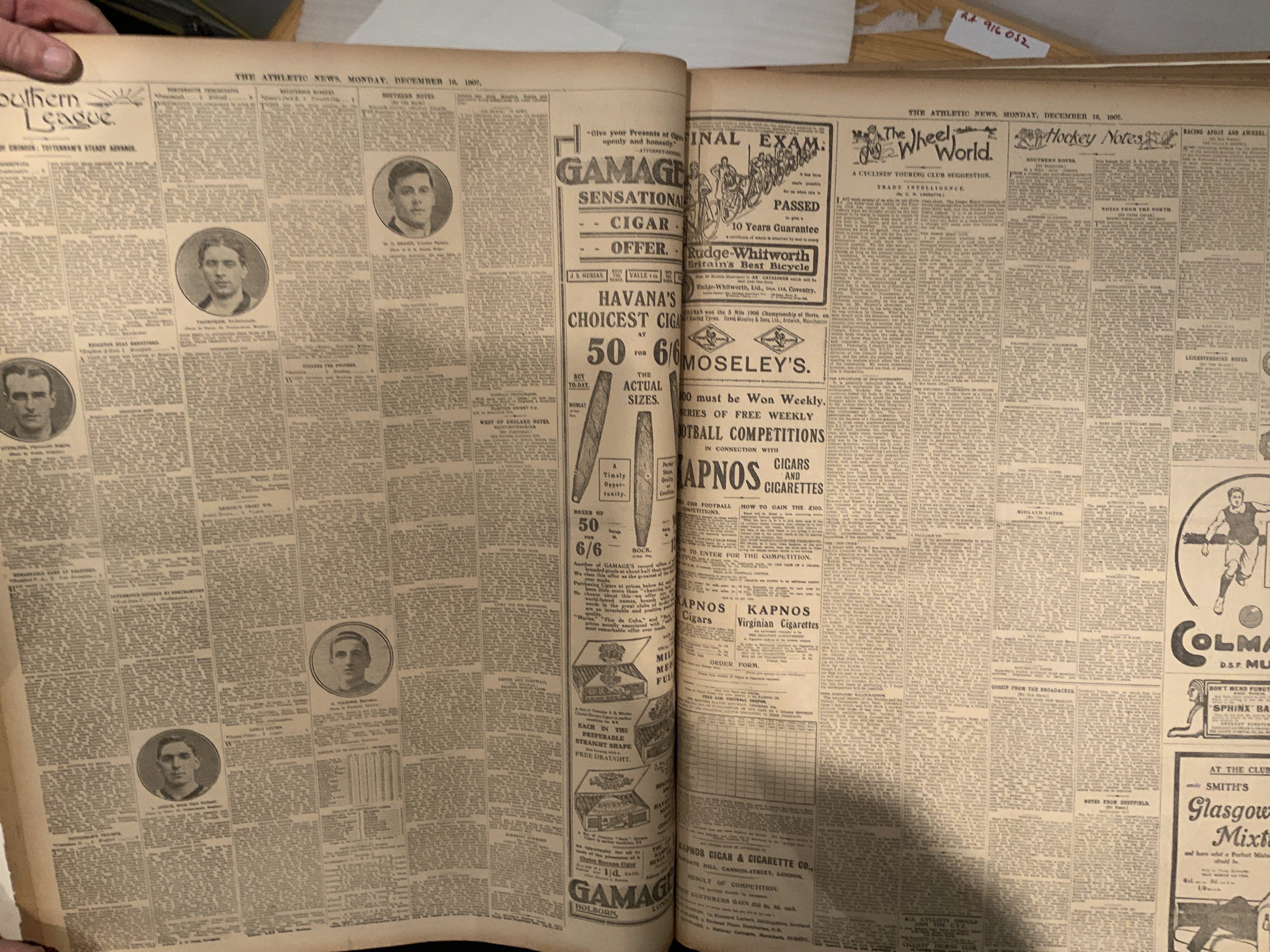 1907 - 1908 Athletic News Bound Volume Of Sport Magazines: From August 1907 to June 1908 and we believe this is a complete run of the weekly newspaper. Most volumes cover football including the Newcastle v Wolves FA Cup final. Other sports included. Large format heavy bound volume with some clippings cut out.