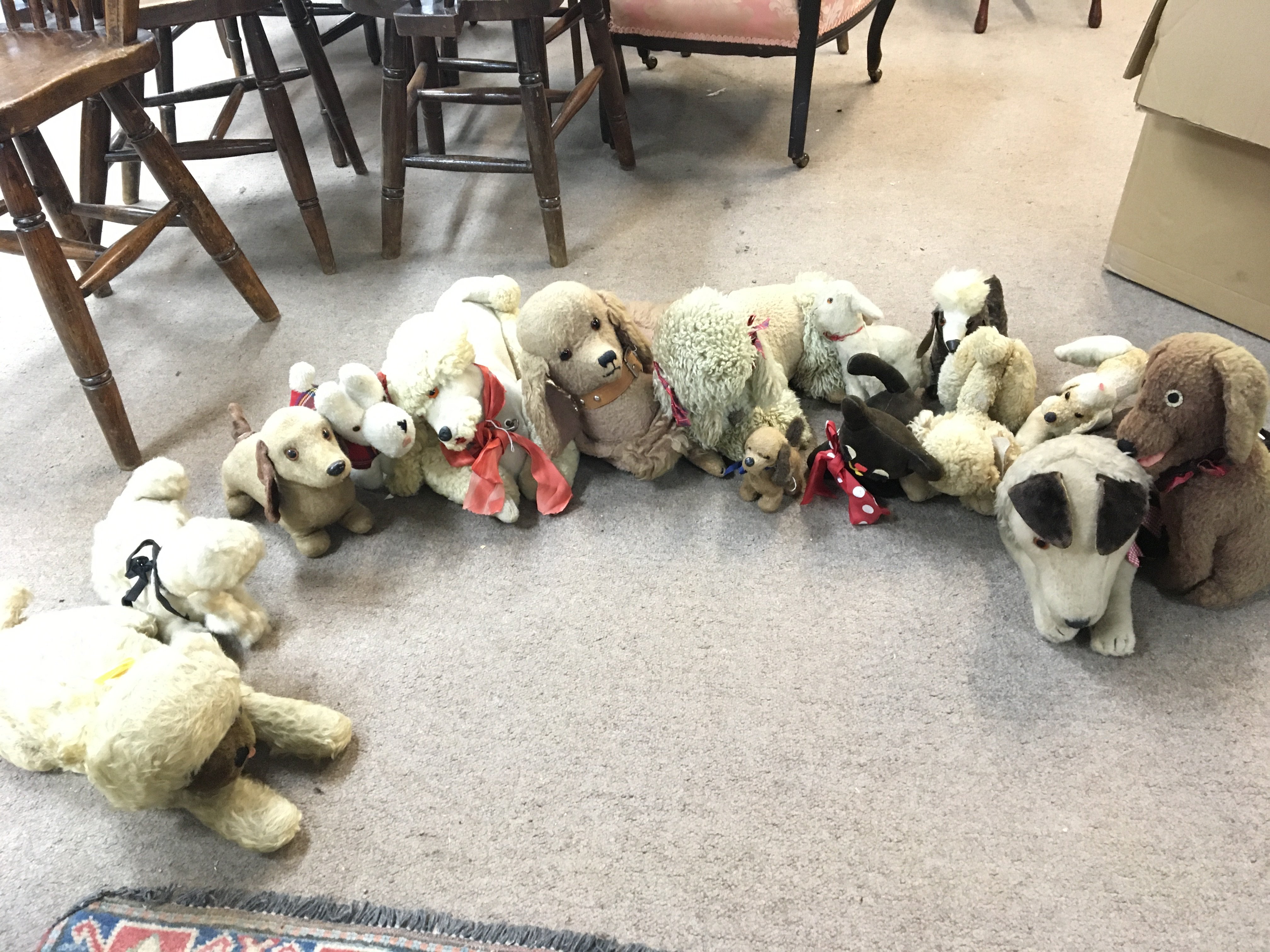 A large collection of various vintage dog toys , mostly with zipper storage compartments