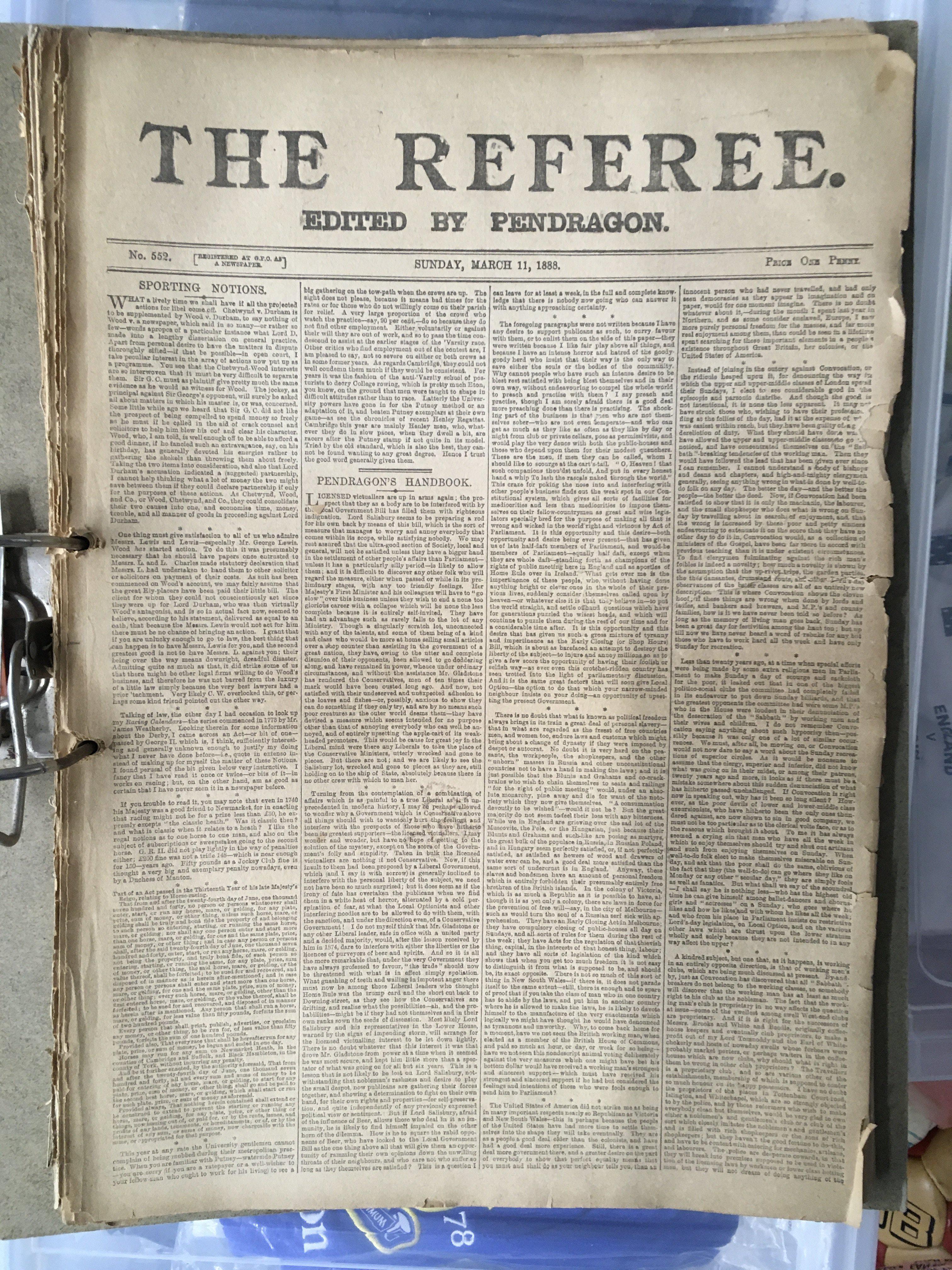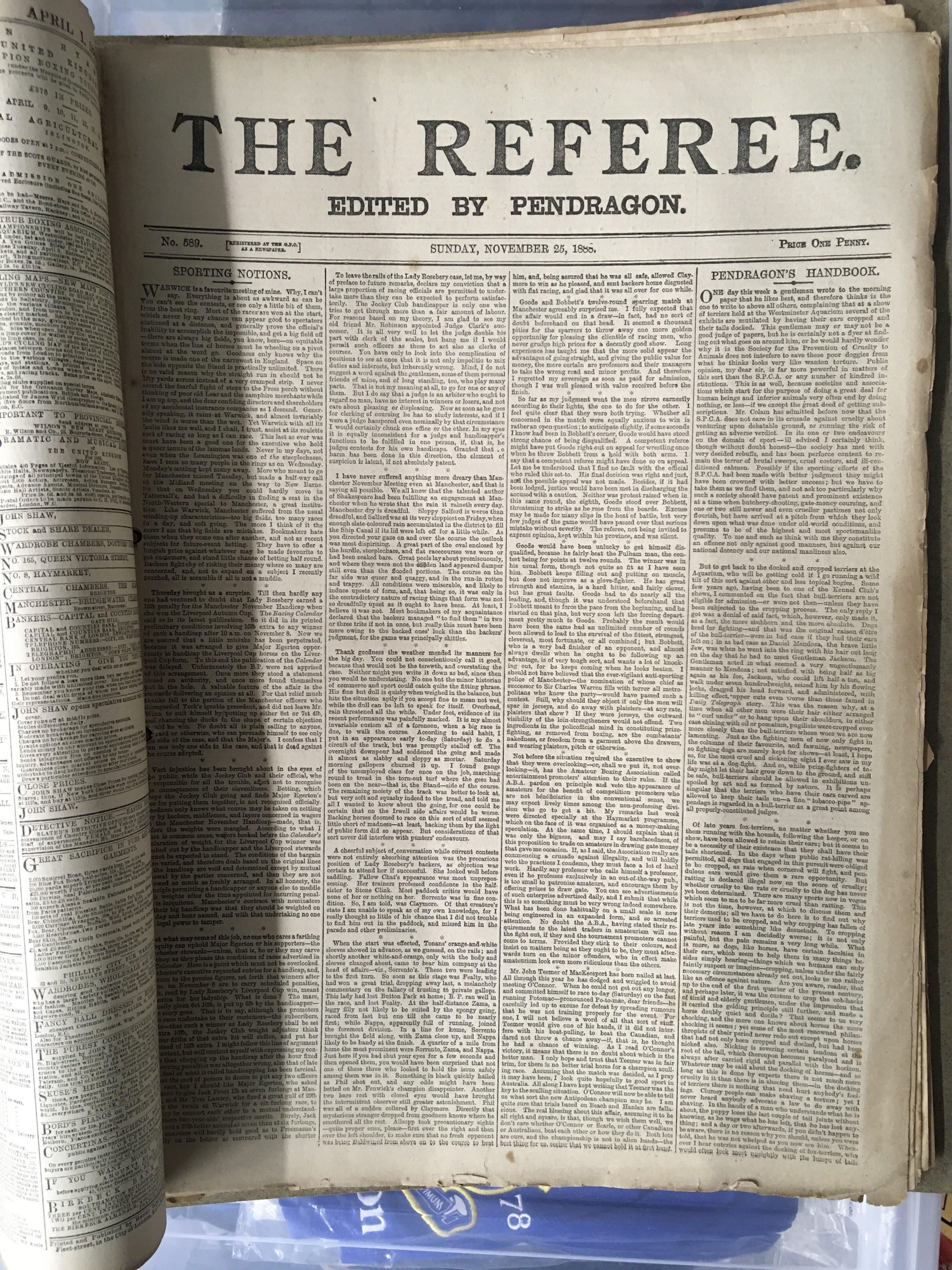 1888 - 1891 The Referee Sporting Magazine Collection: Incomplete run of full 8 page newspapers named The Referee which was a sports newspaper edited by Pendragon covering a very wide range of sports. Hole punched to border and kept nicely with only top copy having tear. 24 editions from 1888 to 1891.