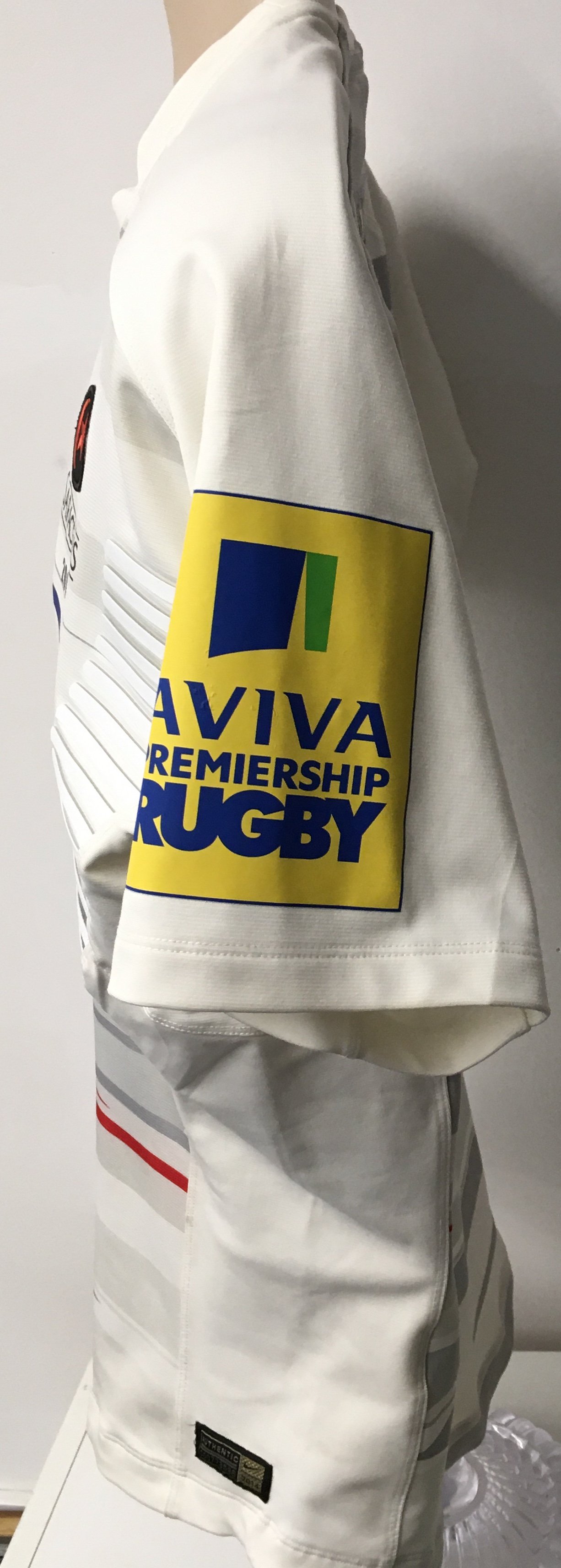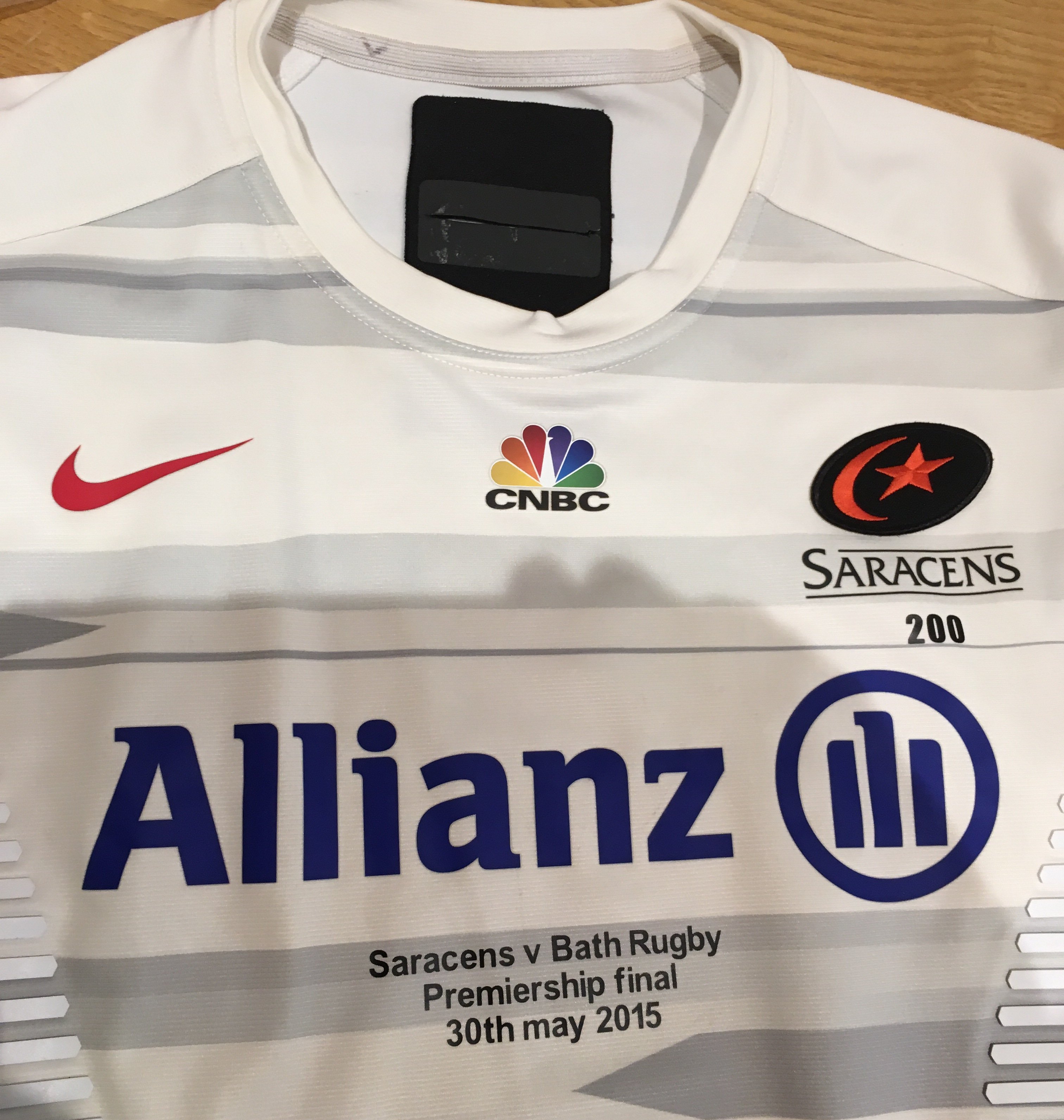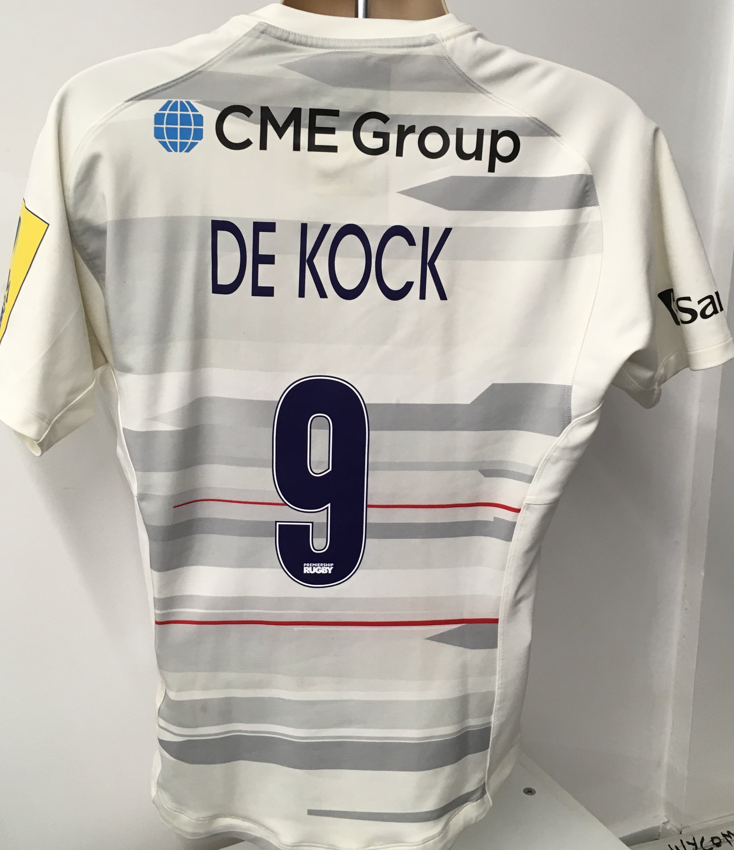 Saracens 2014 - 2015 Away Match Worn Rugby Union Football Shirt: White short sleeve Nike large excellent condition shirt worn by Neil DeKock. Aviva Premiership badging. Worn v Bath on 30 May 2015 in the Premiership final. Player was a second half substitute in the match that Saracens won 28-16. GPS tracking pocket present on the shirt neck.