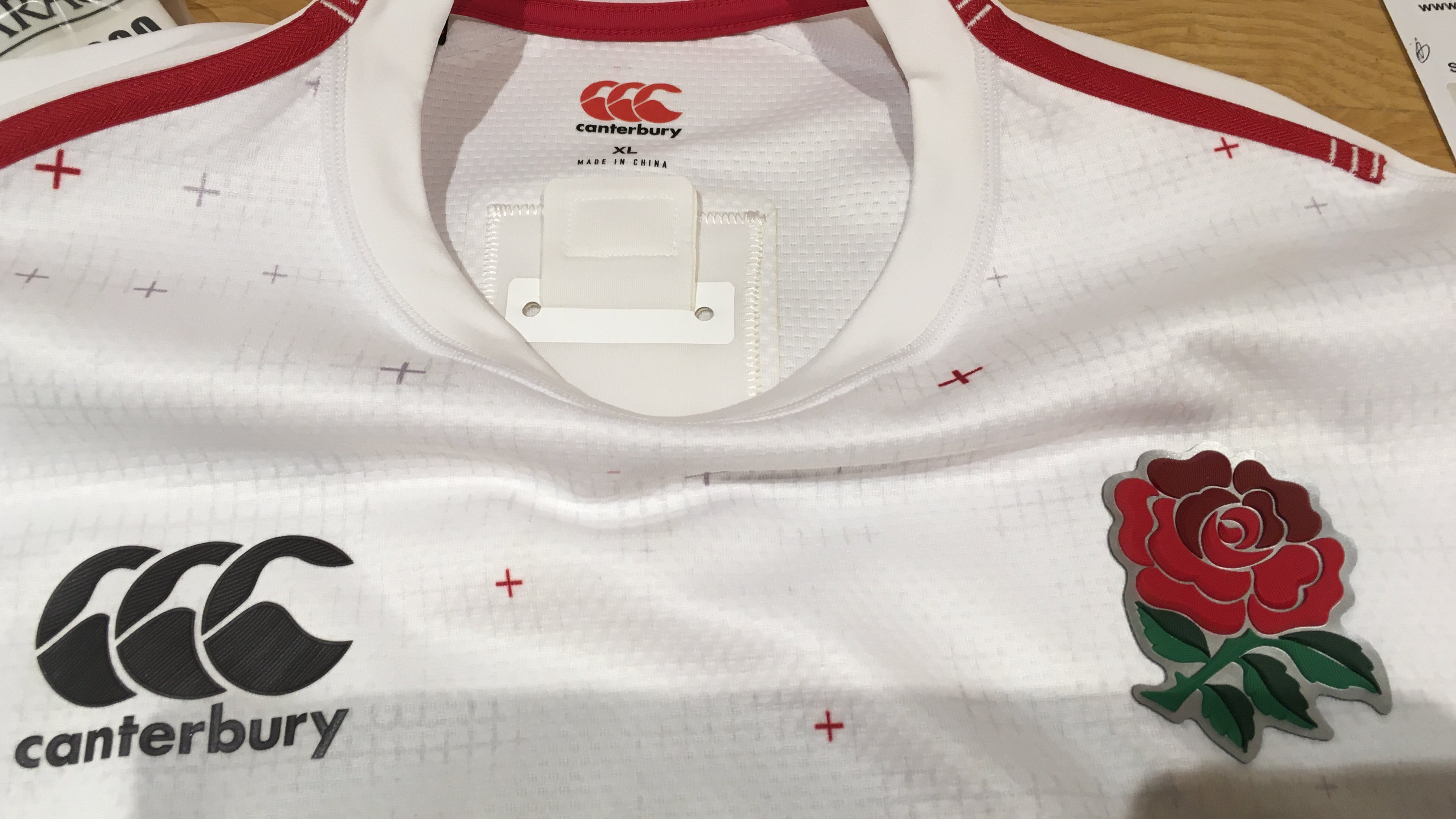England Under 20 Home Match Worn Rugby Union Football Shirt: White short sleeve Canterbury XL unwashed signed with long dedication number 7 shirt. GPS tracking pocket present at neck.