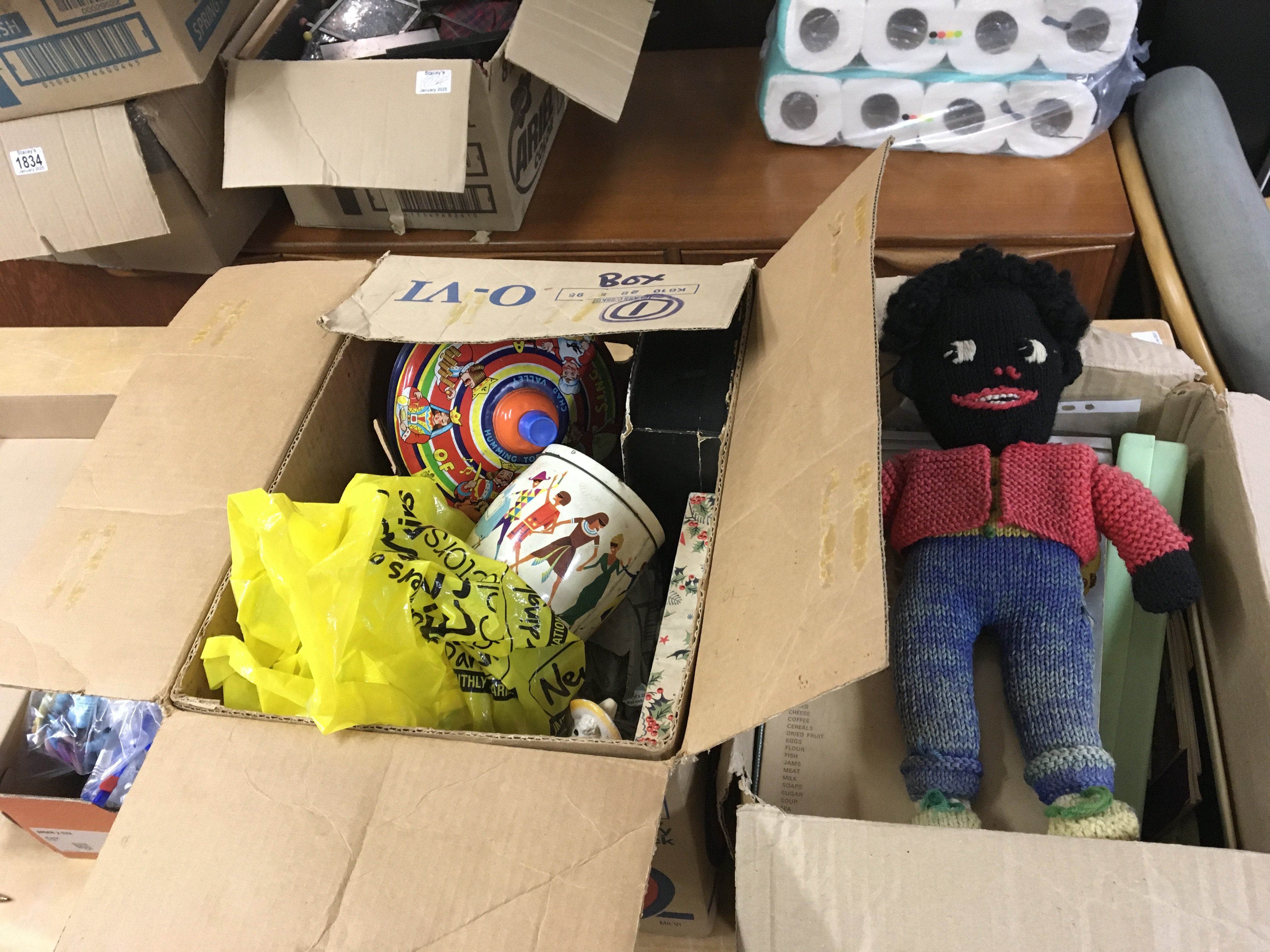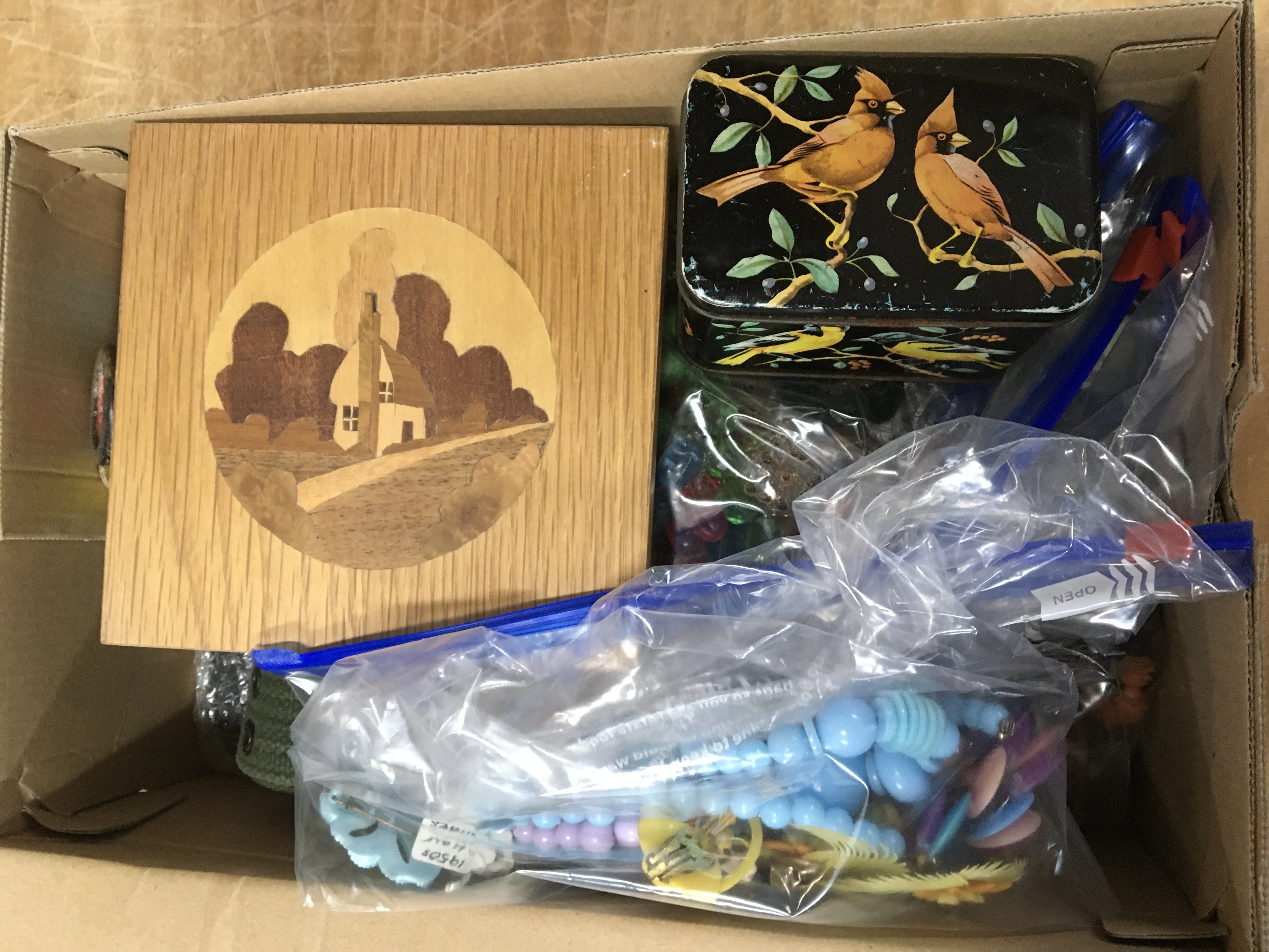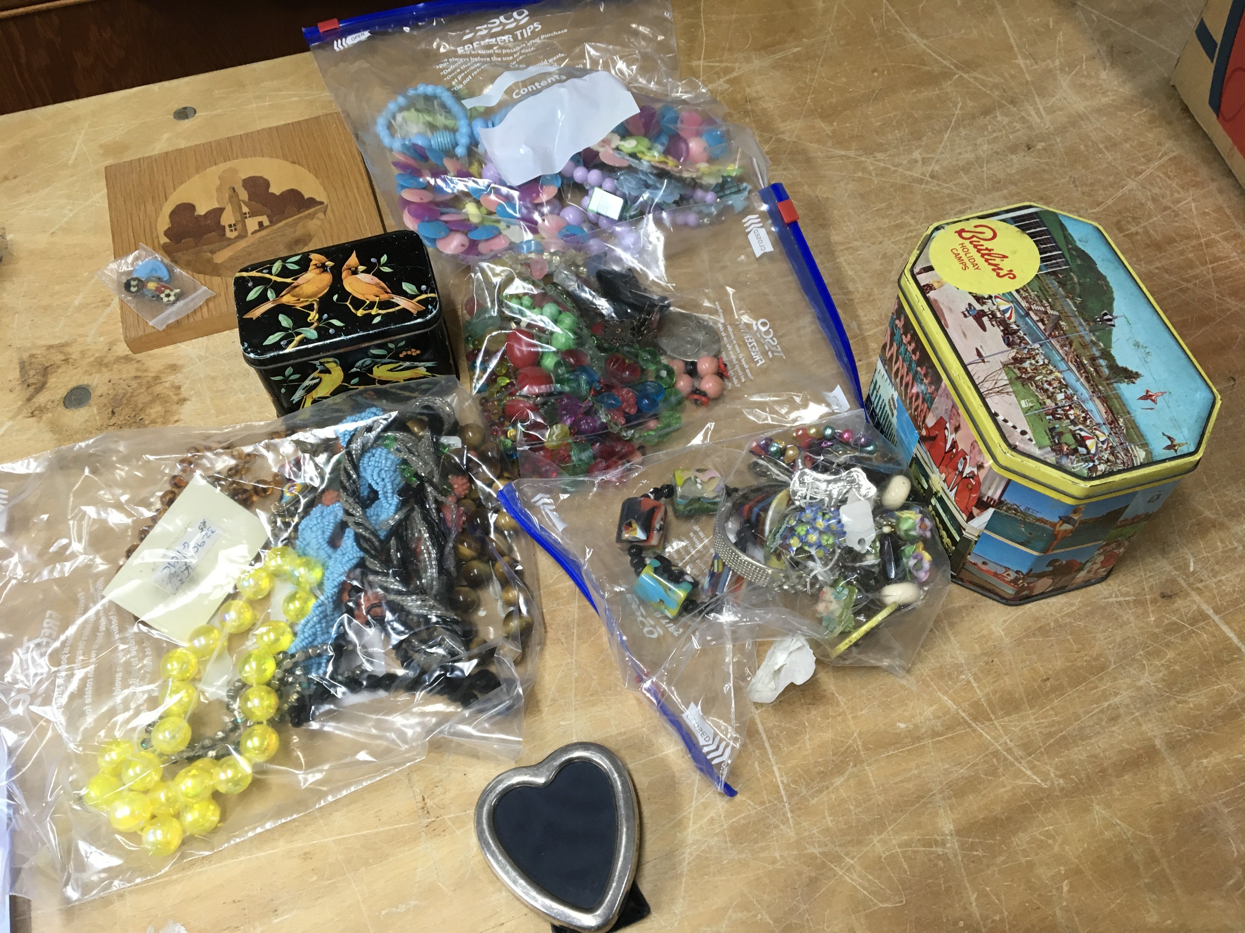 A collection of vintage items including costume jewellery, small heart shaped silver hallmarked picture frame, Chad Valley spinner,