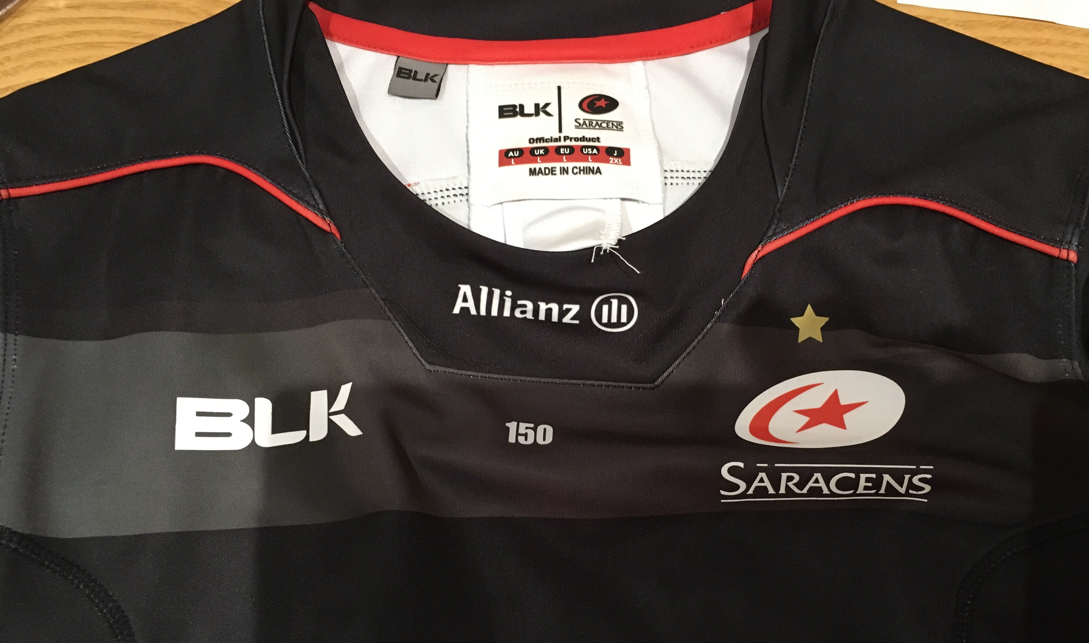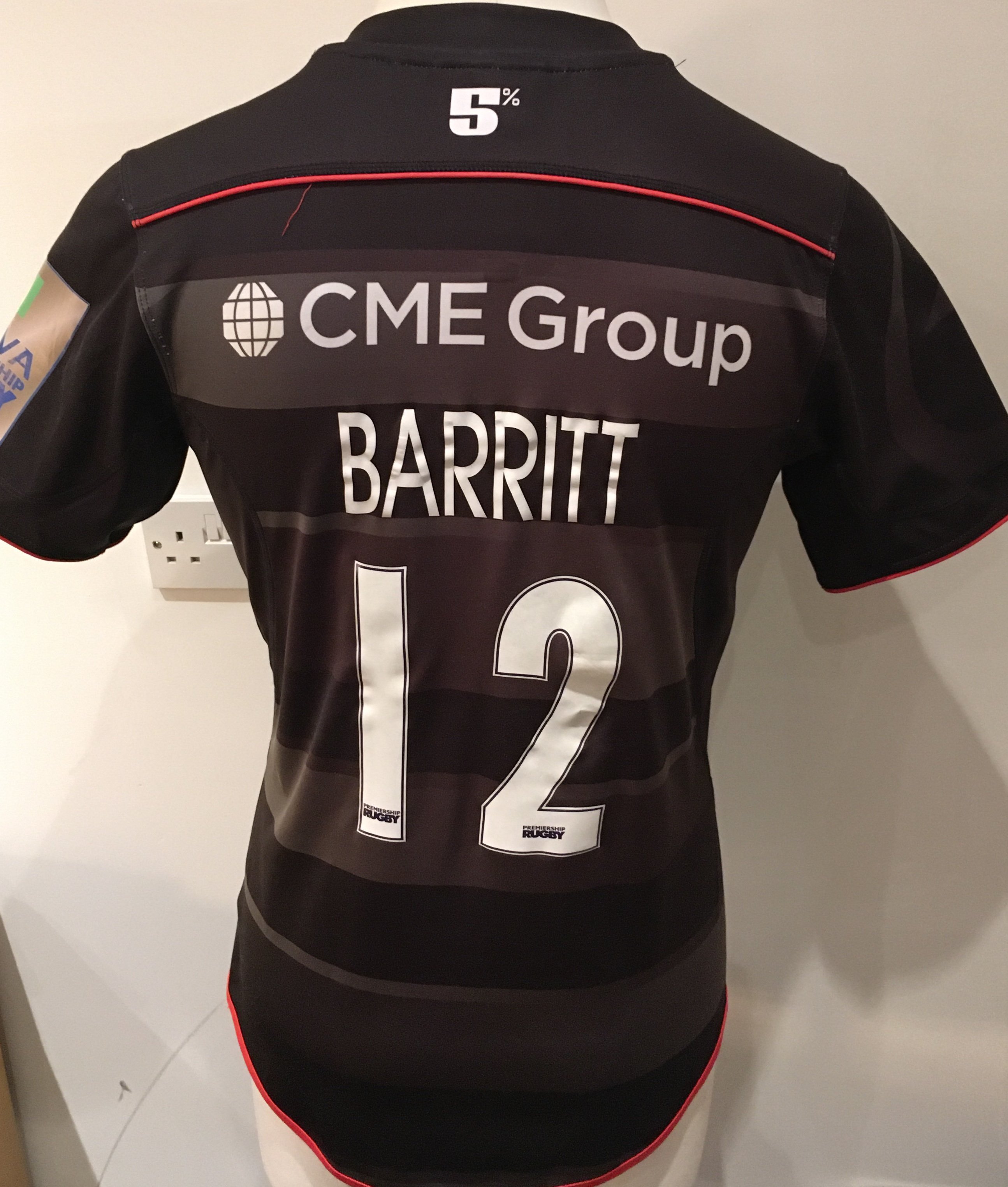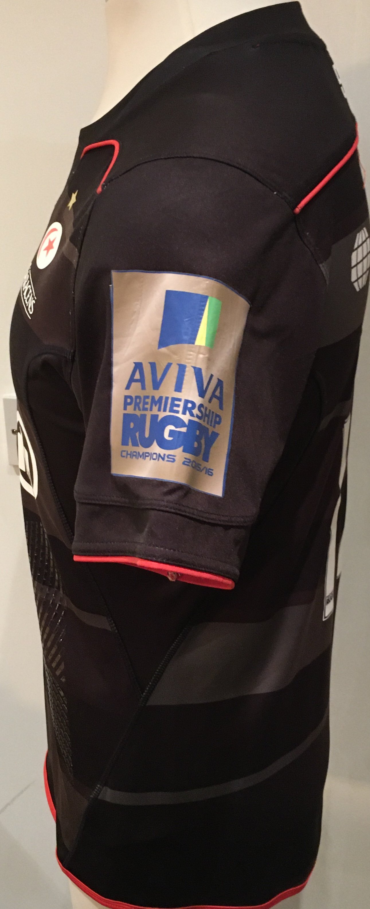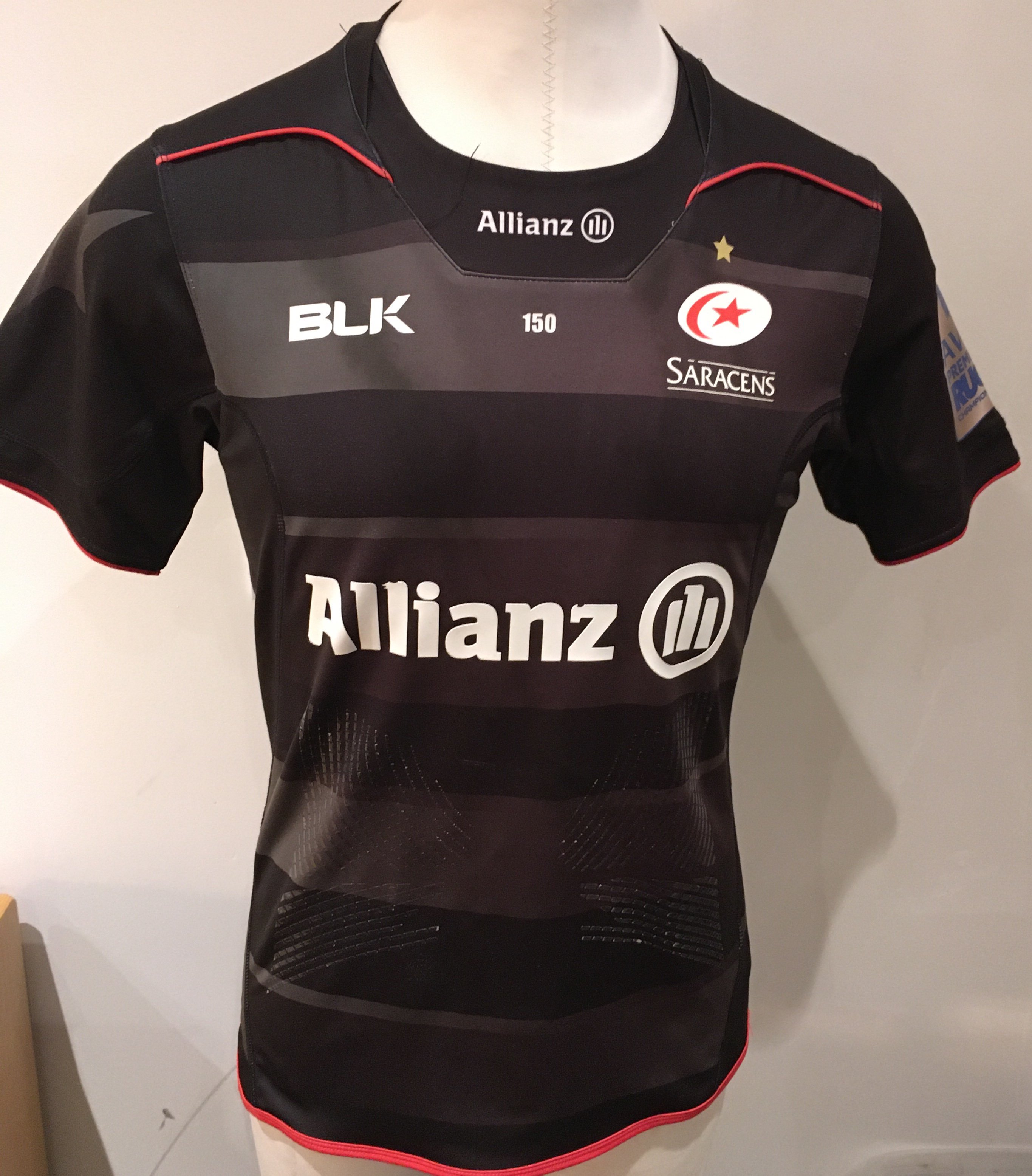 Saracens 2016 - 2017 Home Match Worn Rugby Union Football Shirt: Black short sleeve BLK large excellent condition shirt worn by Brad Barritt. Aviva Champions 2015/16 badging. GPS tracking pocket present at neck.