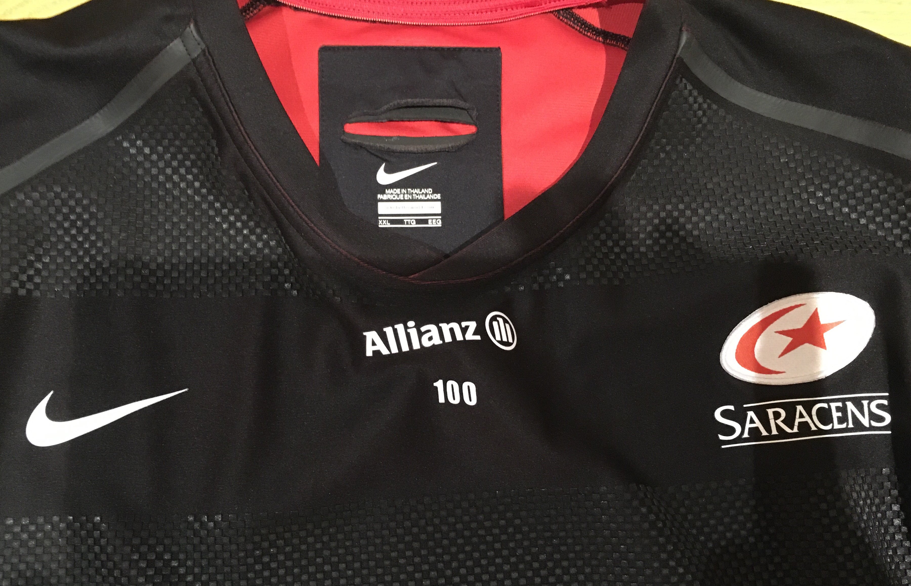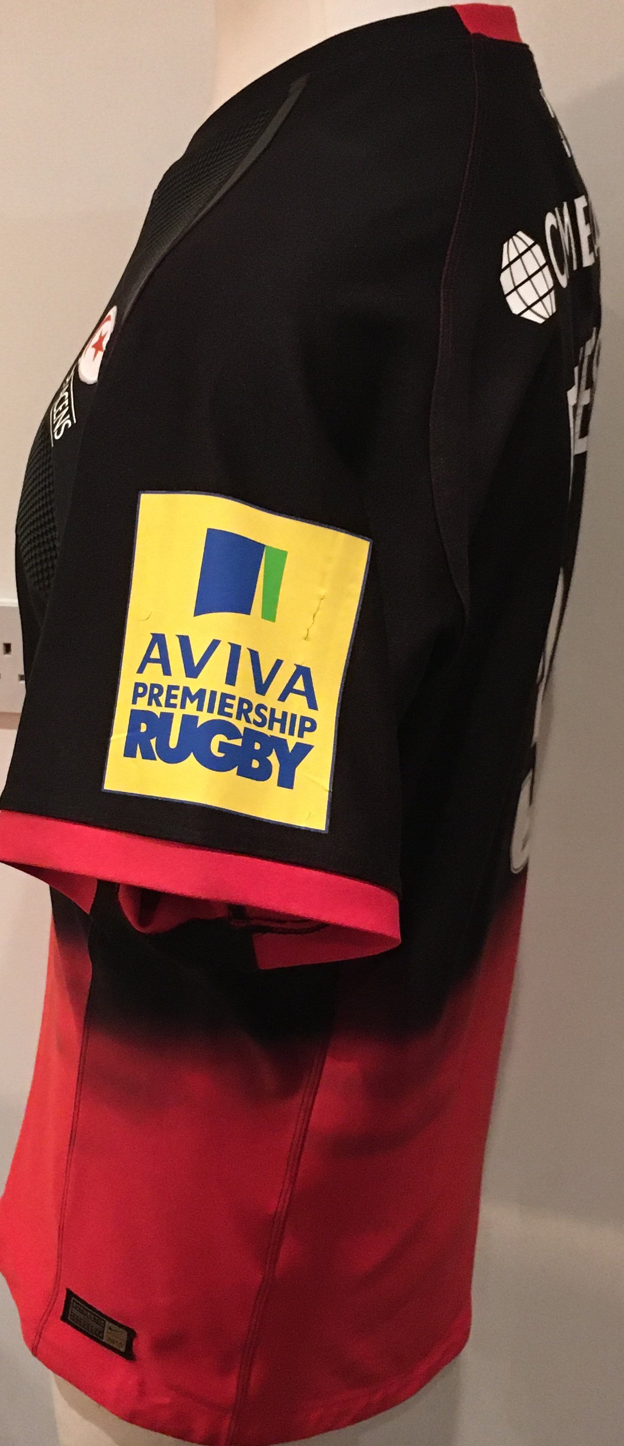 Saracens 2013 - 2014 Home Match Worn Rugby Union Football Shirt: Black short sleeve Nike XXL excellent condition shirt worn by Petrus Du Plessis . Aviva Premiership badging. GPS tracking pocket present at neck.
