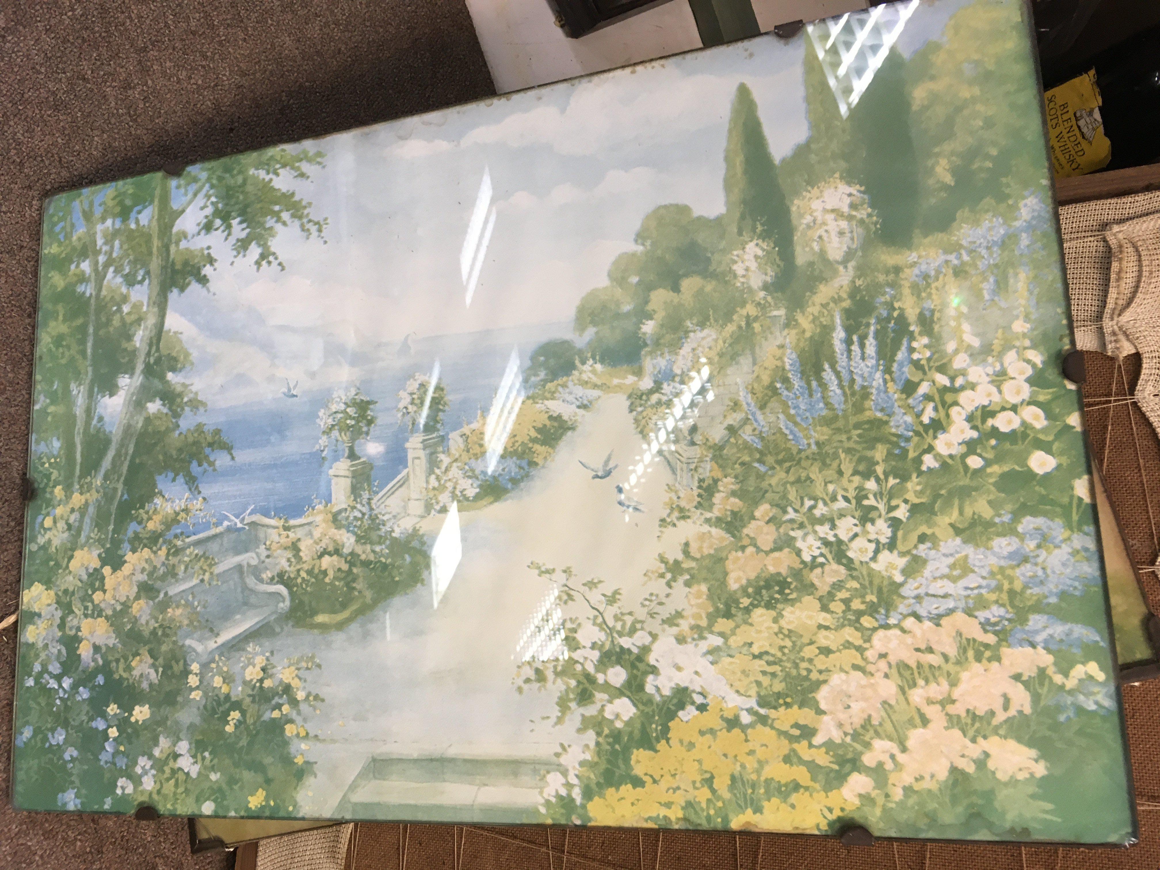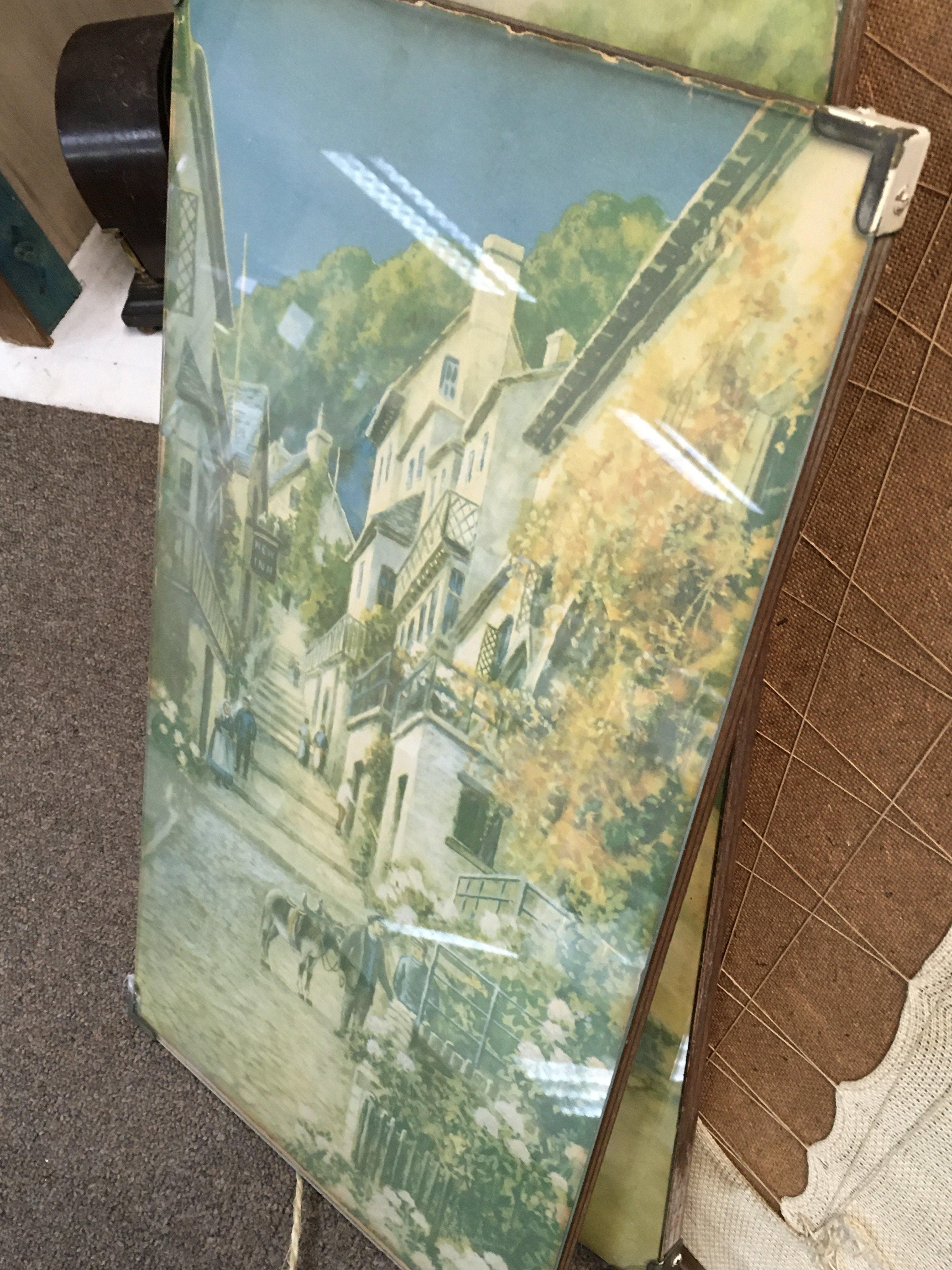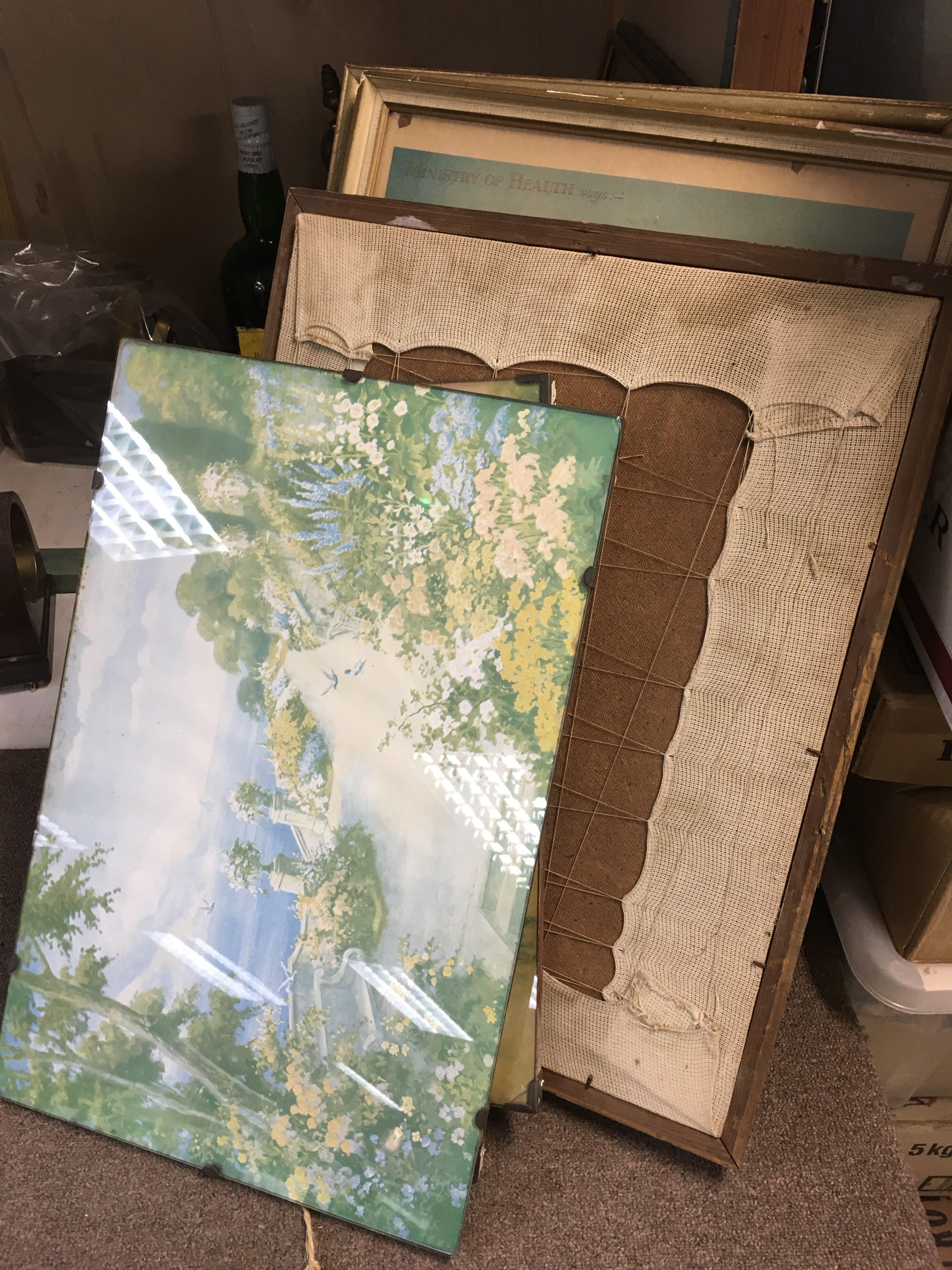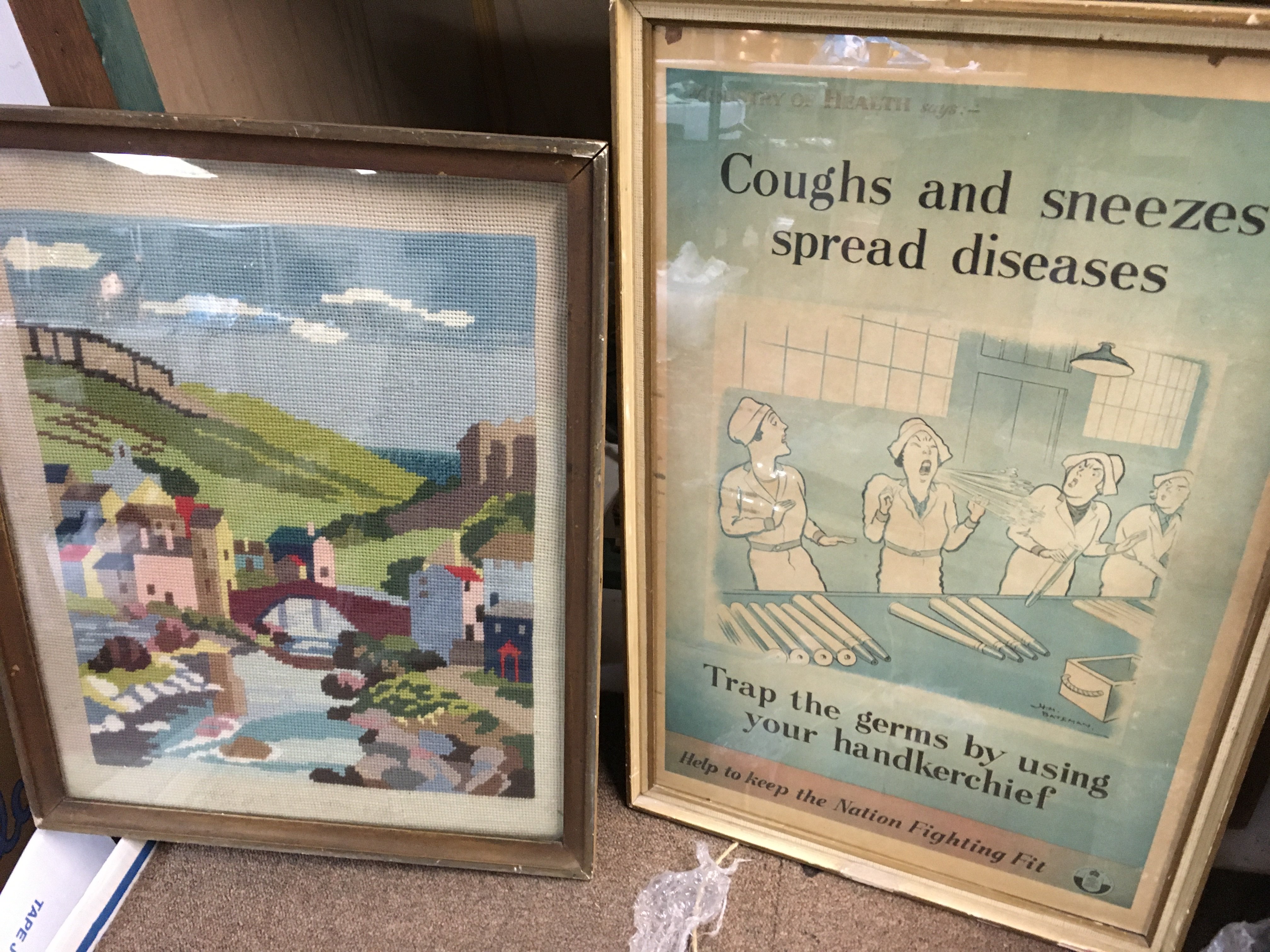A collection of pictures including framed tapestry art of a rural town, vintage ministry of health print etc