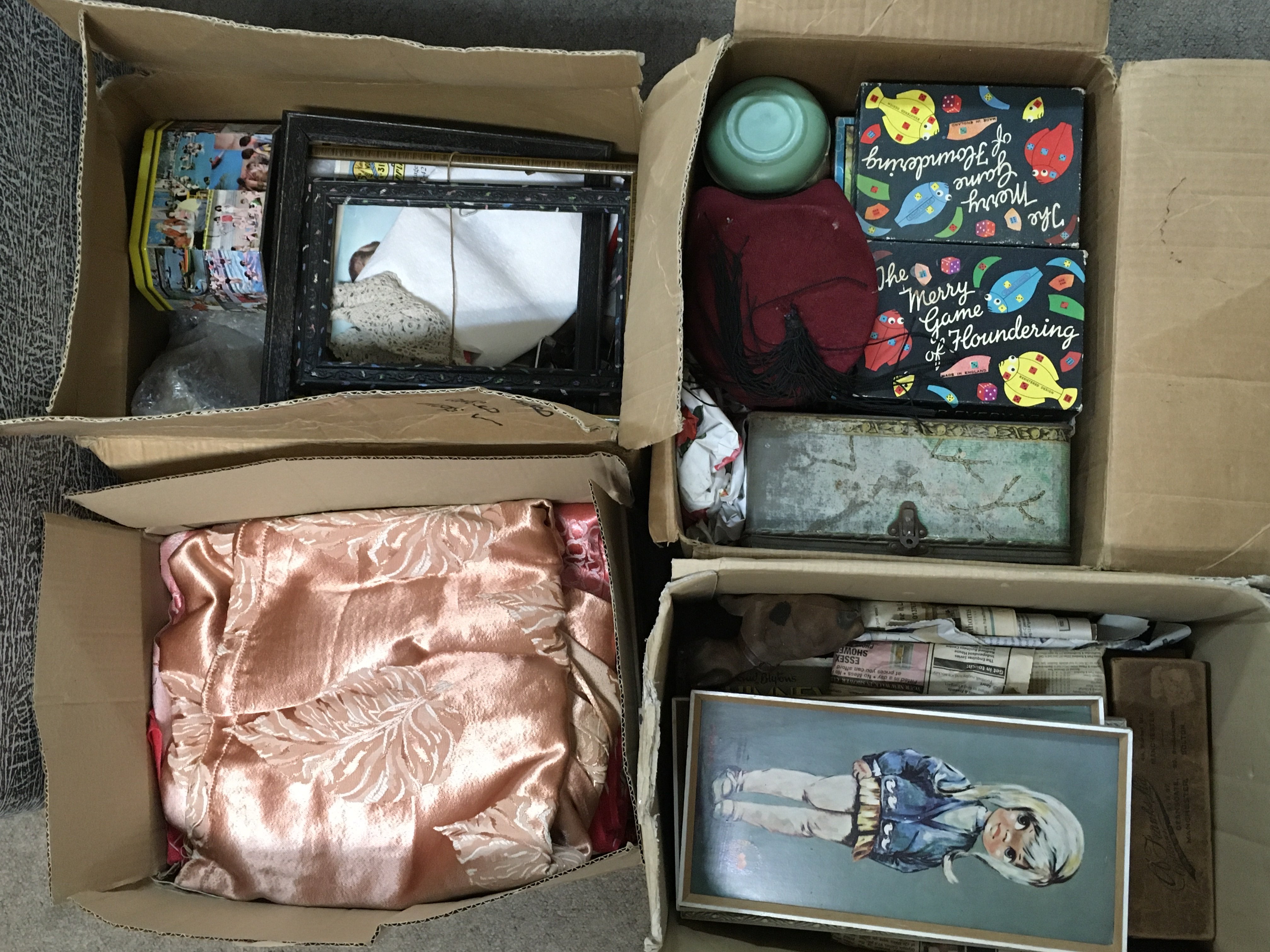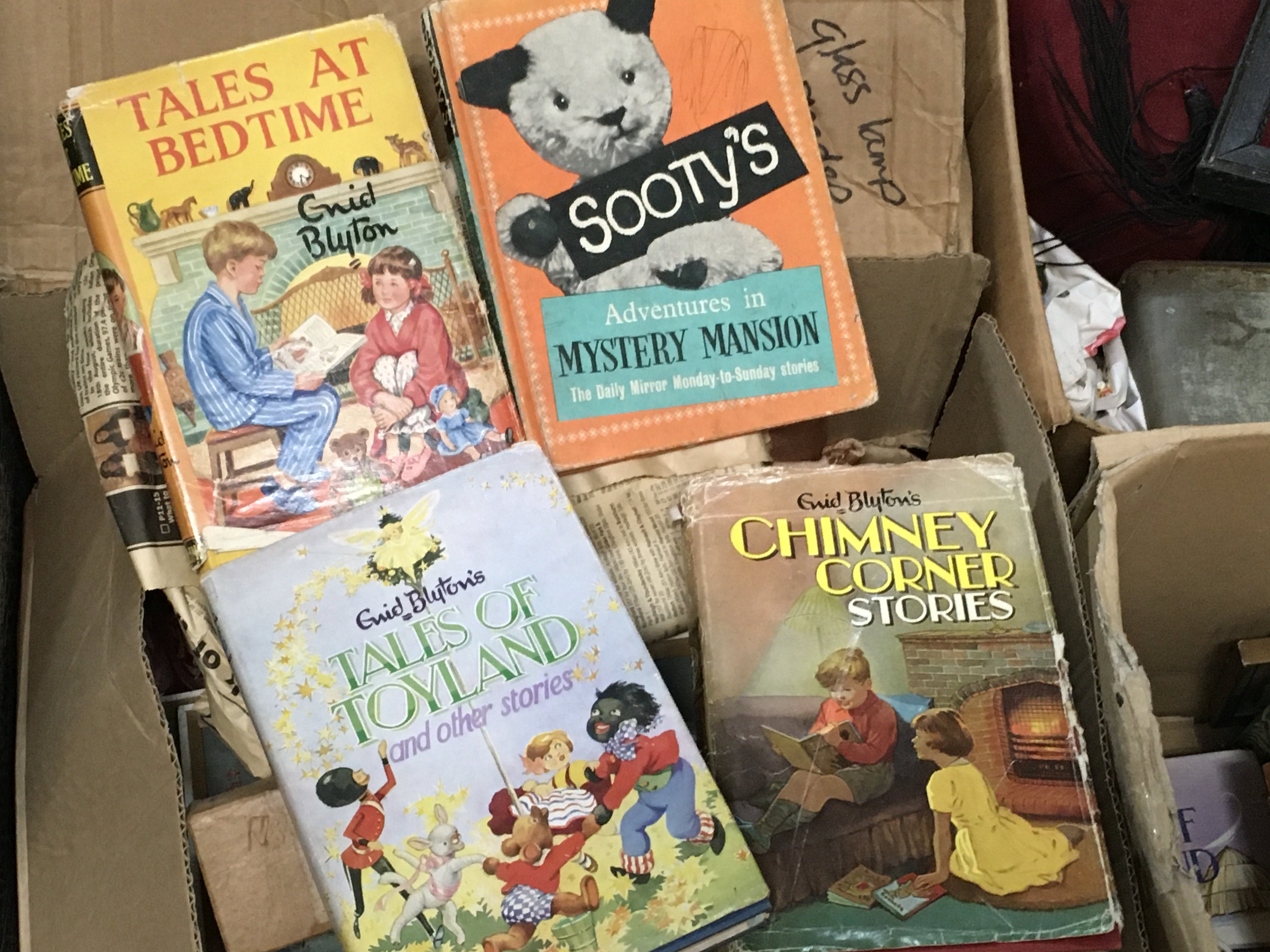 A Collection of vintage items including the merry game of floundering, a fez, cloth, childrens books including Enid Blyton books