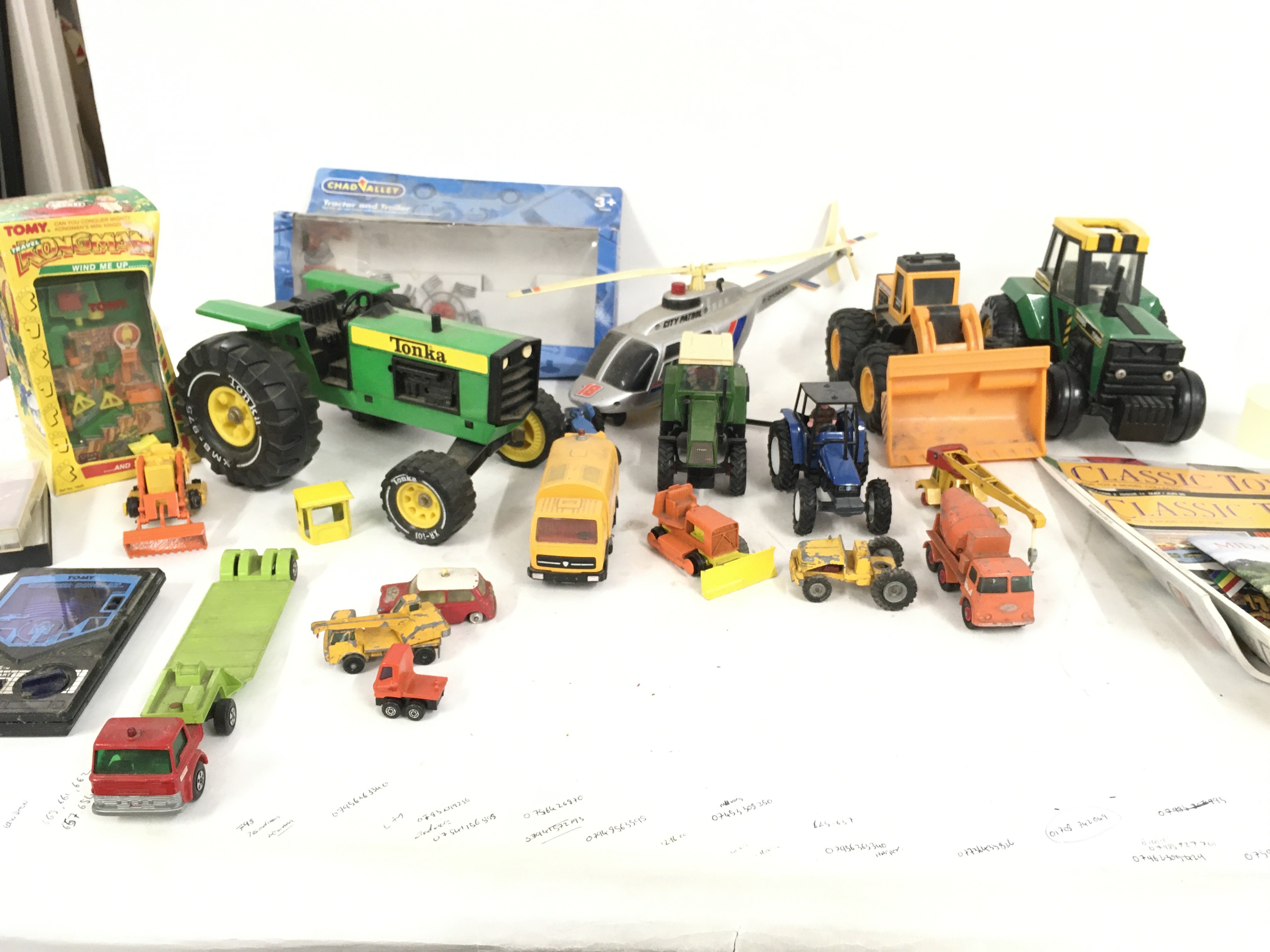 A box containing a mixed collection of Playworn diecast and plastic model vehicles by Tonka ..Buddy L and others. Also includes 2 Tomy hand held games . Plus a pair of cassettes and toy magazines NO RESERVE