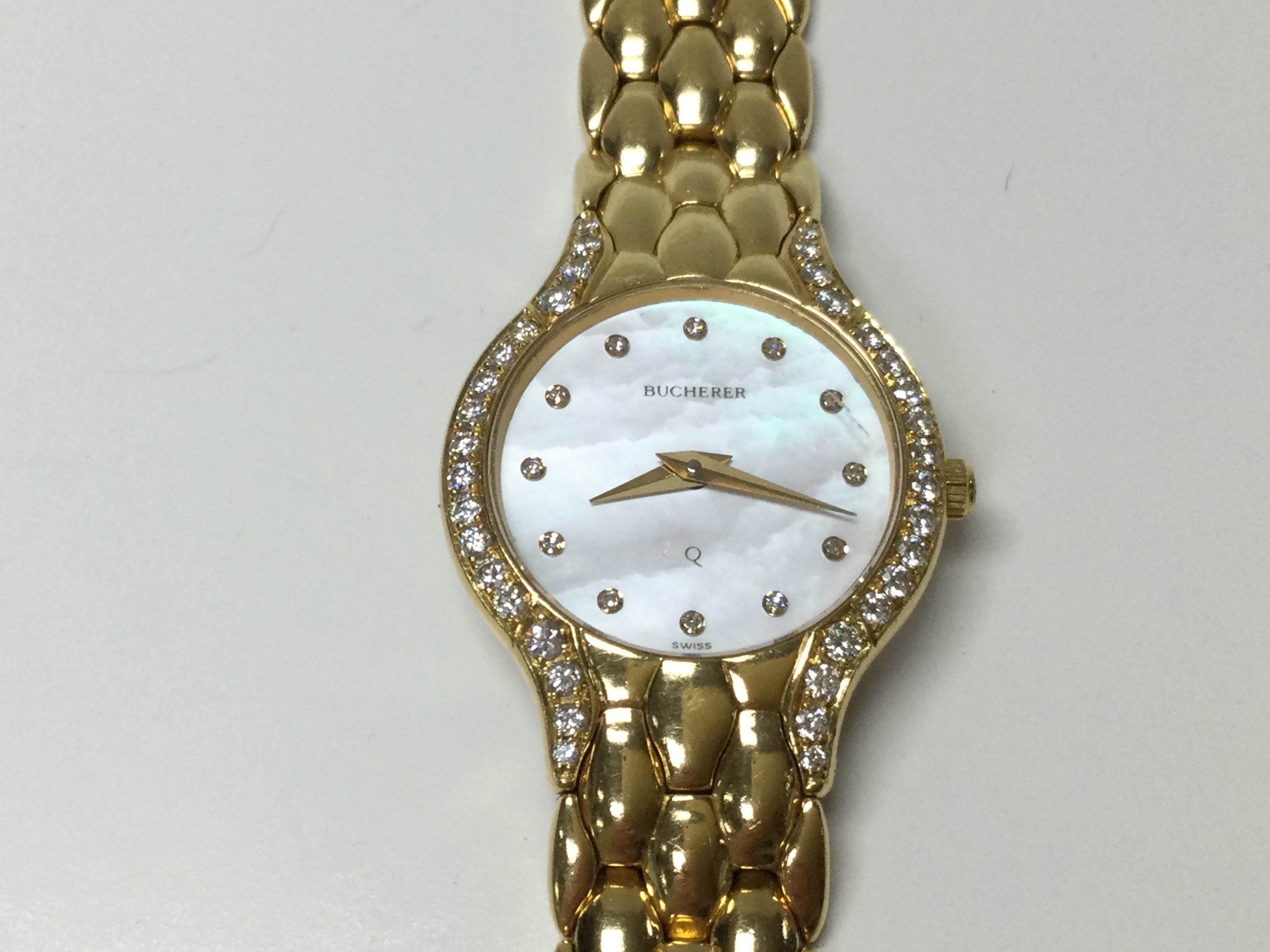 An 18ct gold Bucherer ladies watch. Mother of pearl dial with diamond markers and around case. Quartz movement. Seen running. 57.80g total weight. Postage B