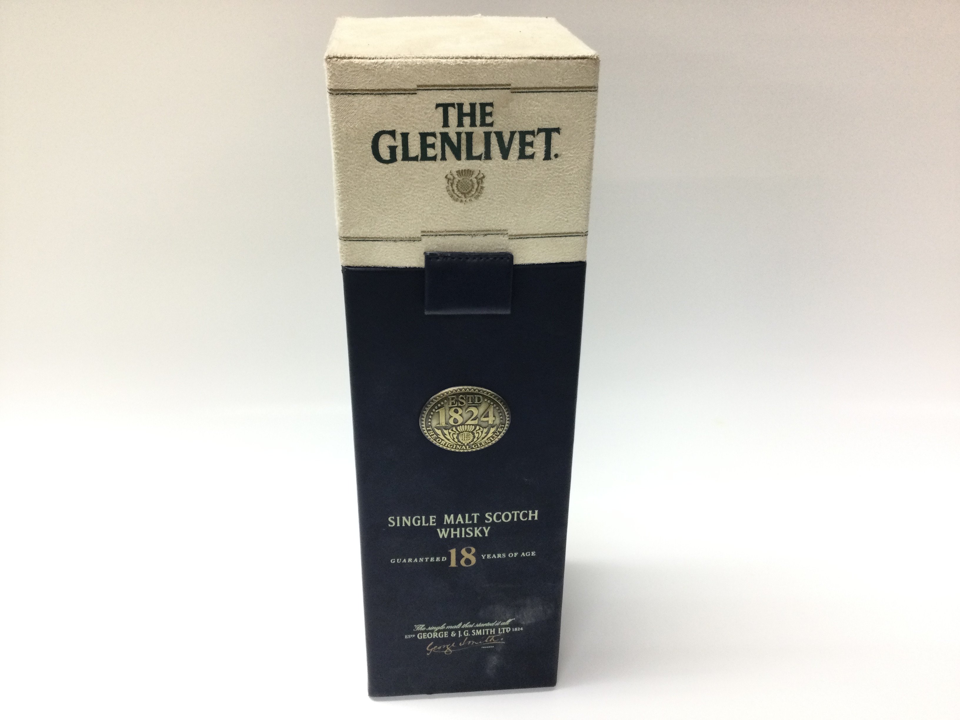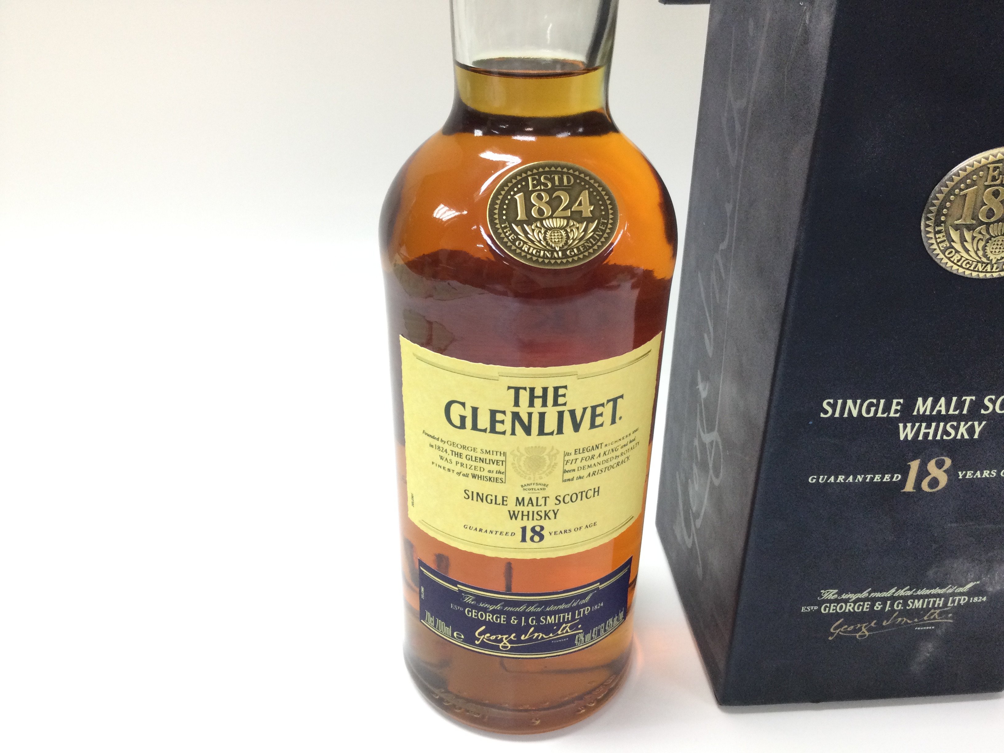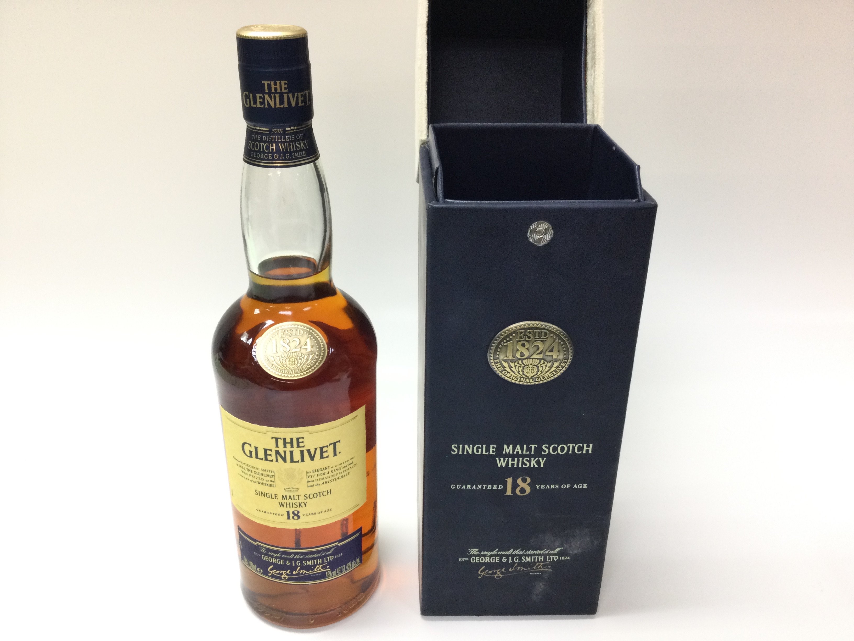 Bottle of Glenlivet 18 years single malt whisky. 700ml bottle sealed with box.