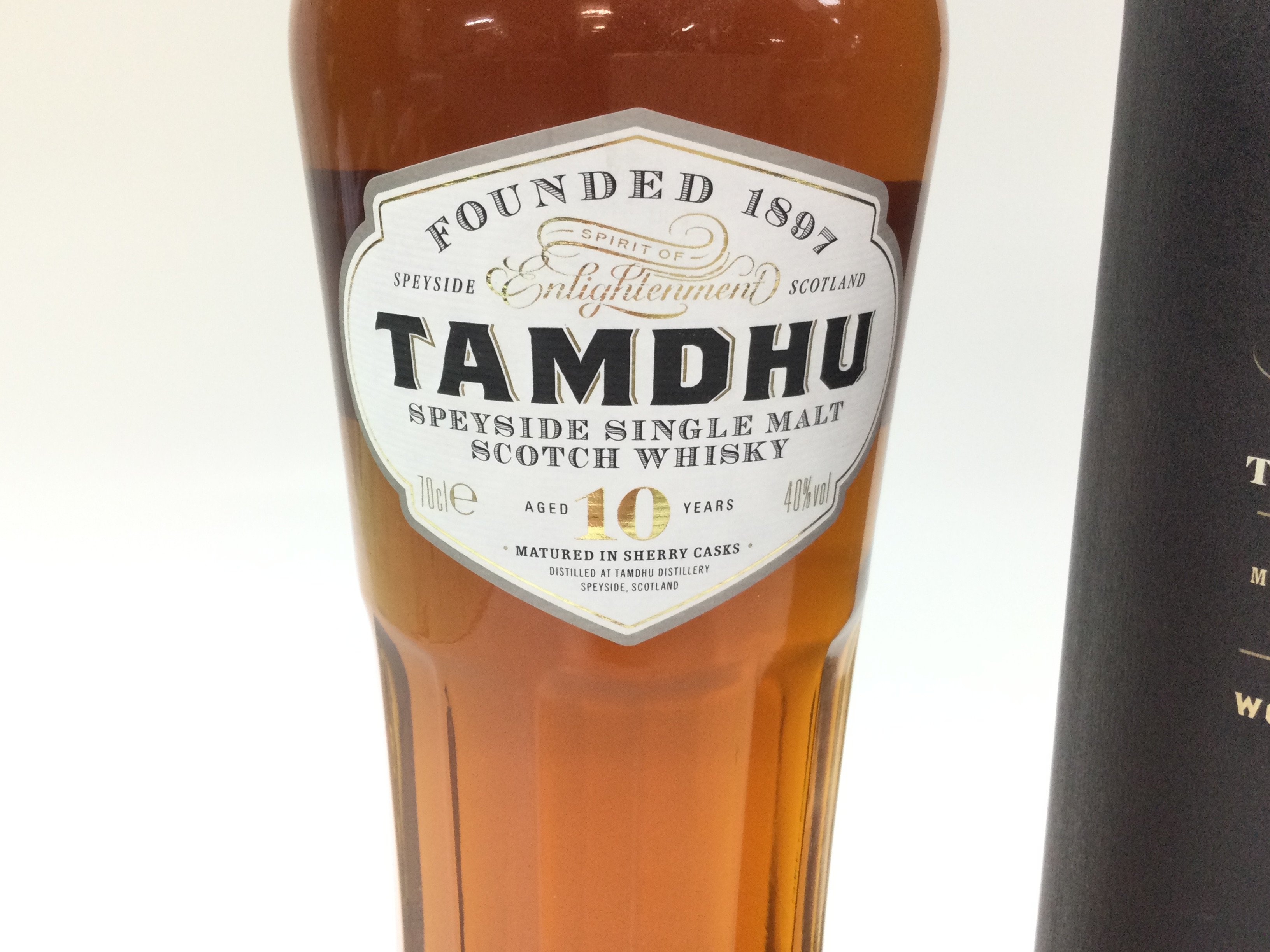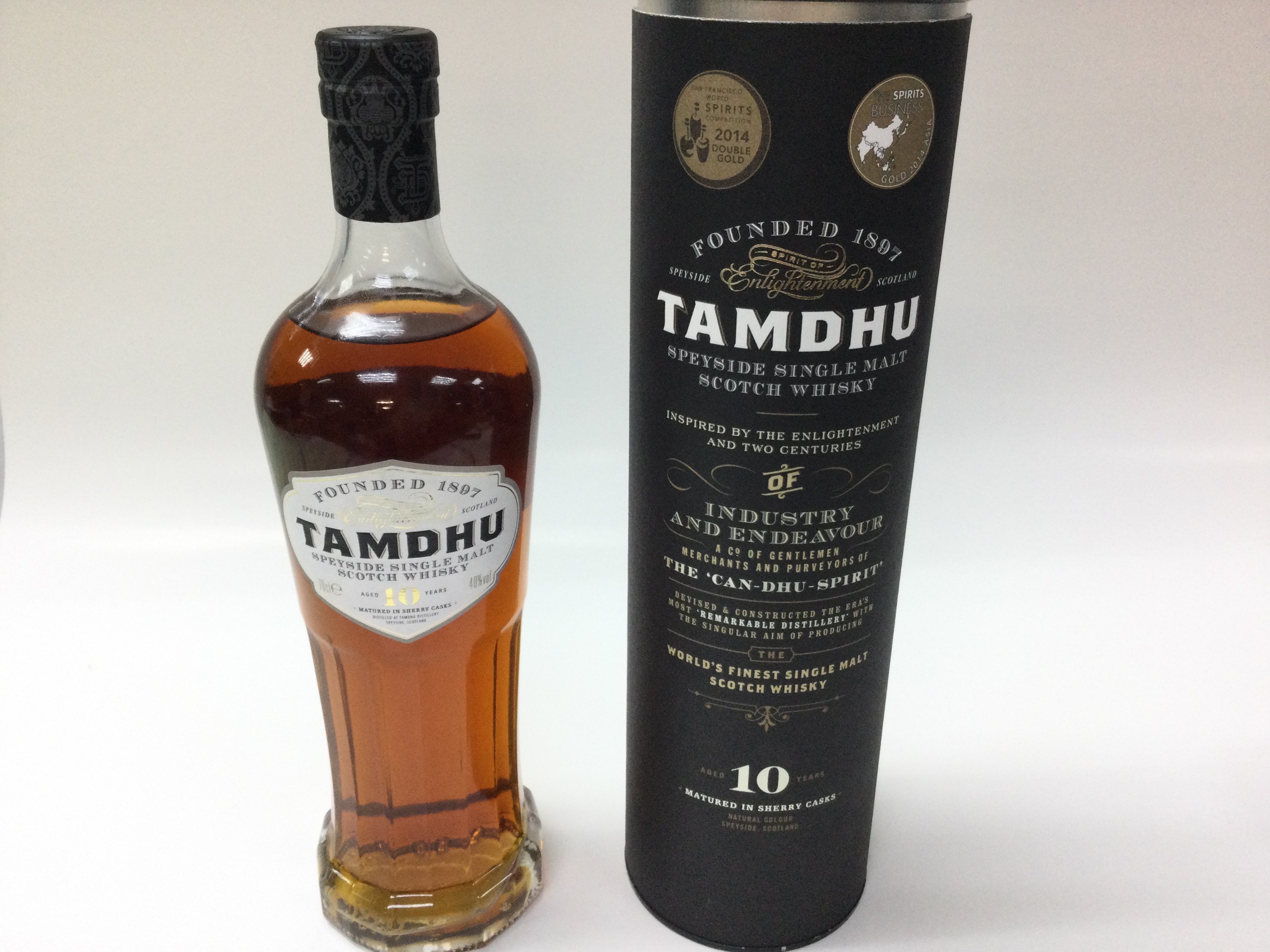 A bottle of Tamdhu 10 years single malt whisky. 70ml slewed bottle with box.