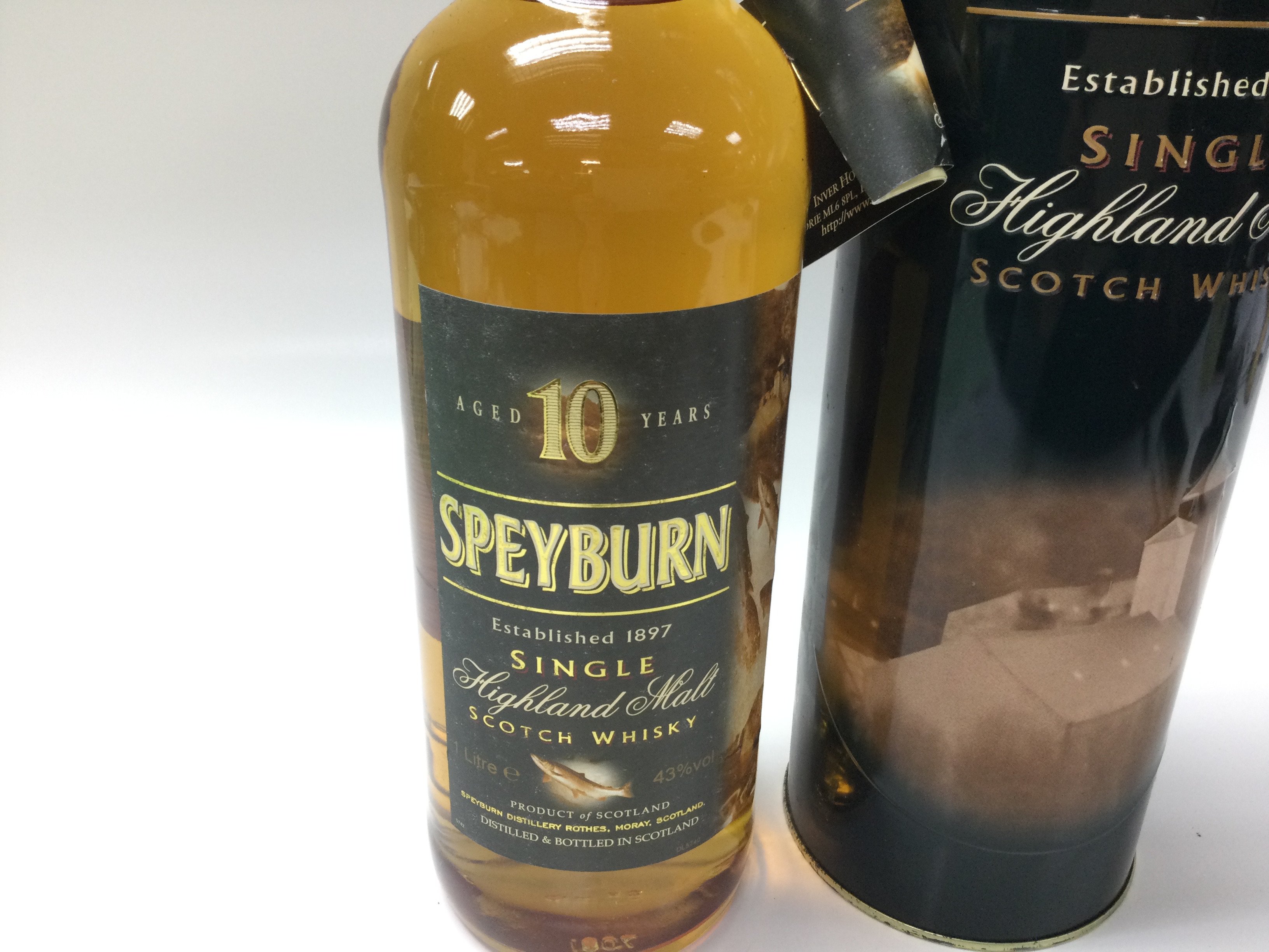 A bottle of Speyburn 10 years single malt. Sealed 1 litre bottle.