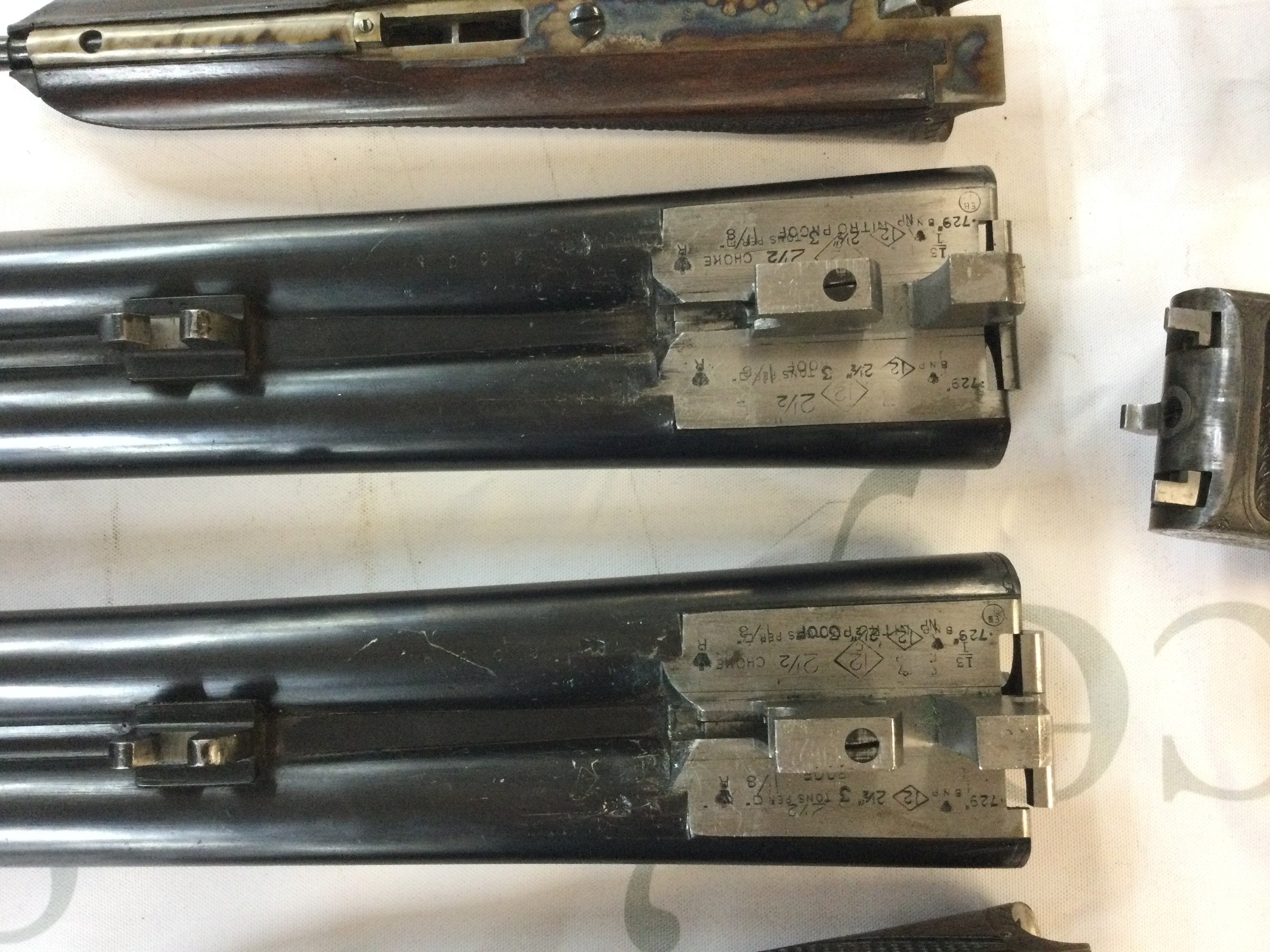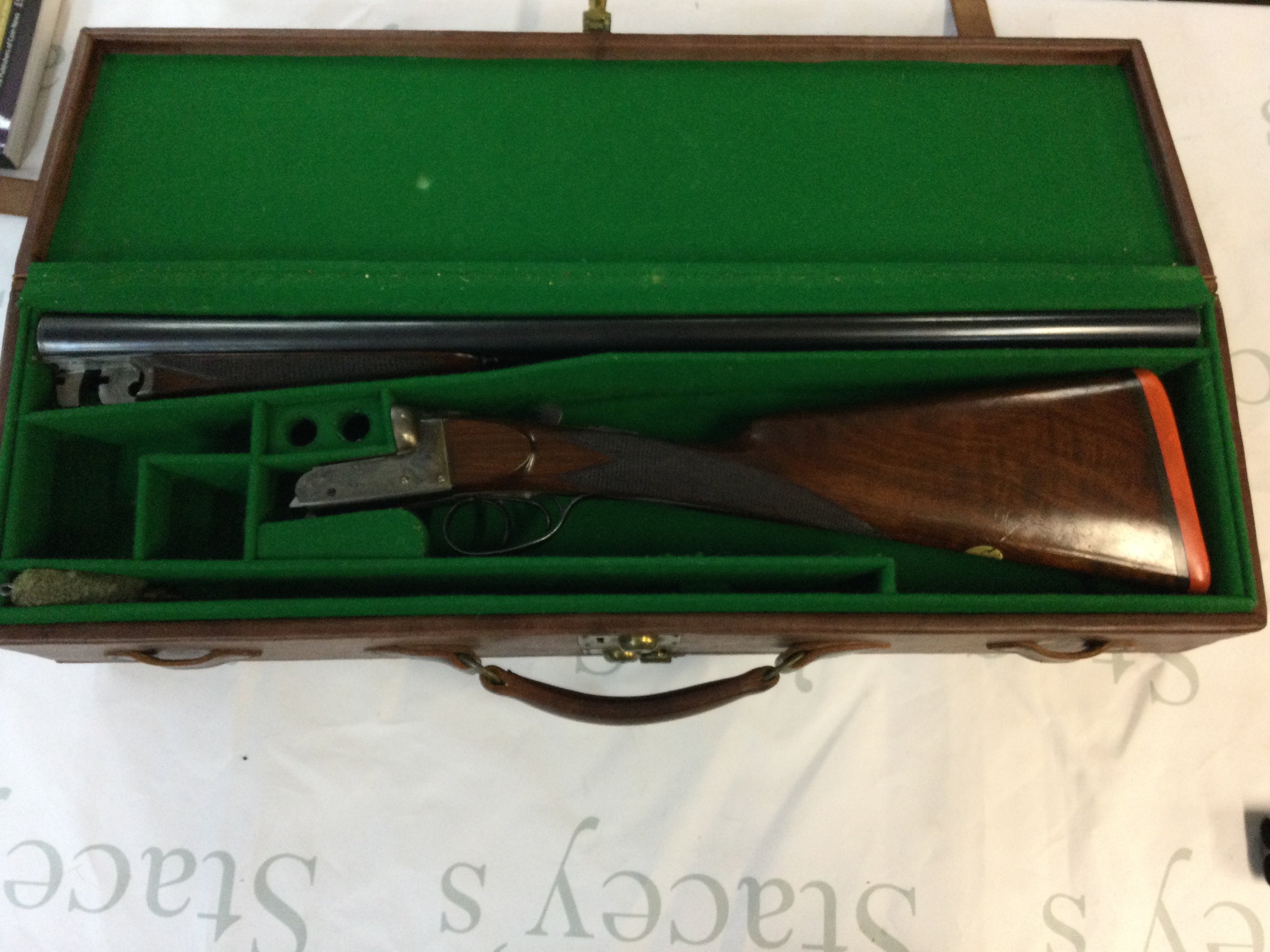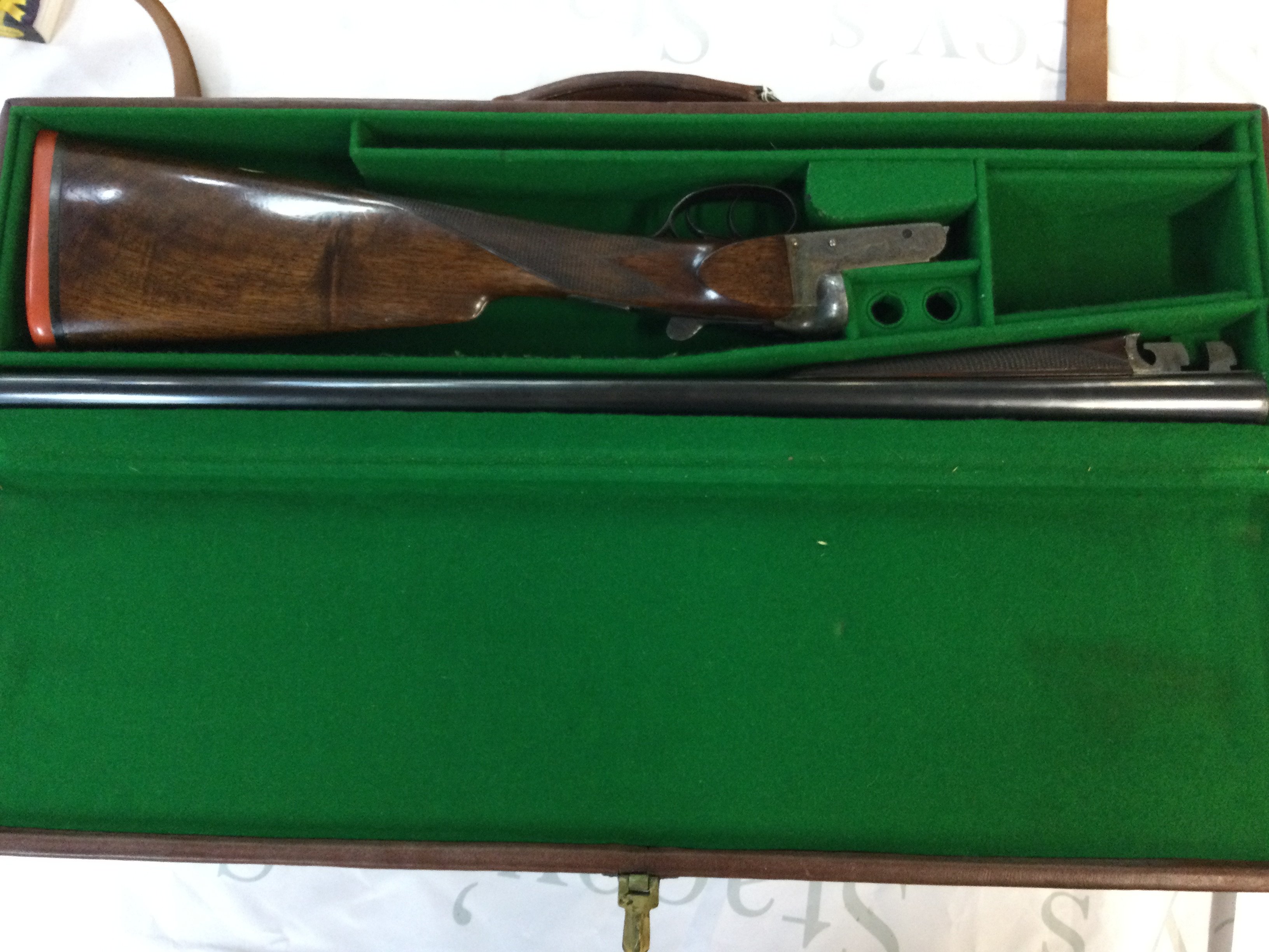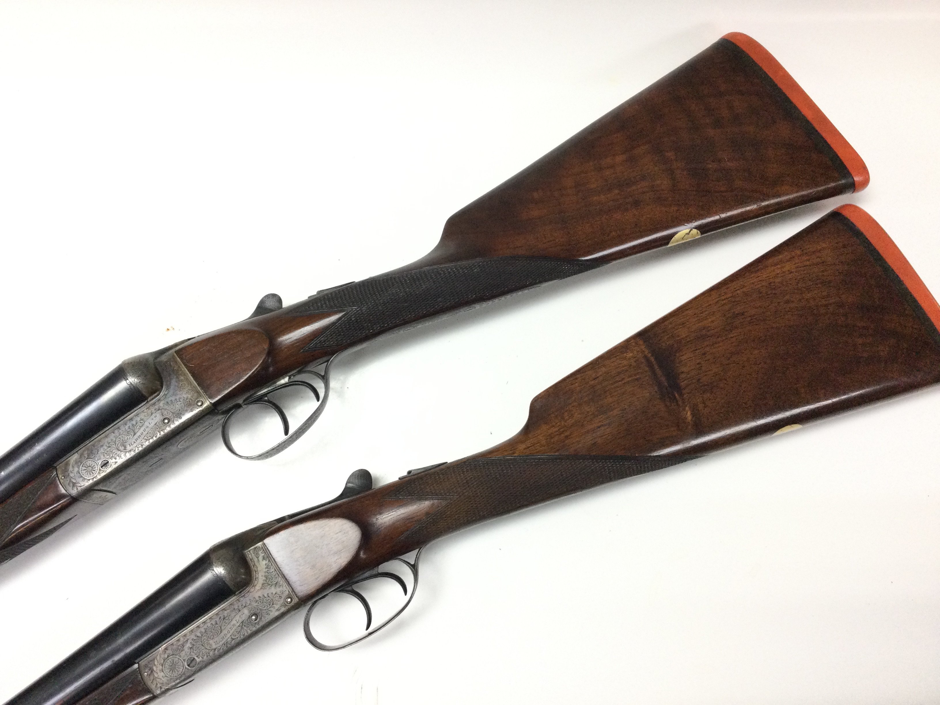 A pair of quality numbered 1 & 2 side by side shotguns attributed to churchill guns for Harrods Ltd in a fitted leather case. Walnut stock with chequered grip and twin triggers. 63cm barrels and 105cm overall length. PLEASE NOTE THAT A SHOGUN LICENSE IS REQUIRED TO PURCHASE THIS LOT. VIEWING AND COLLECTION IS BY APPOINTMENT ONLY.