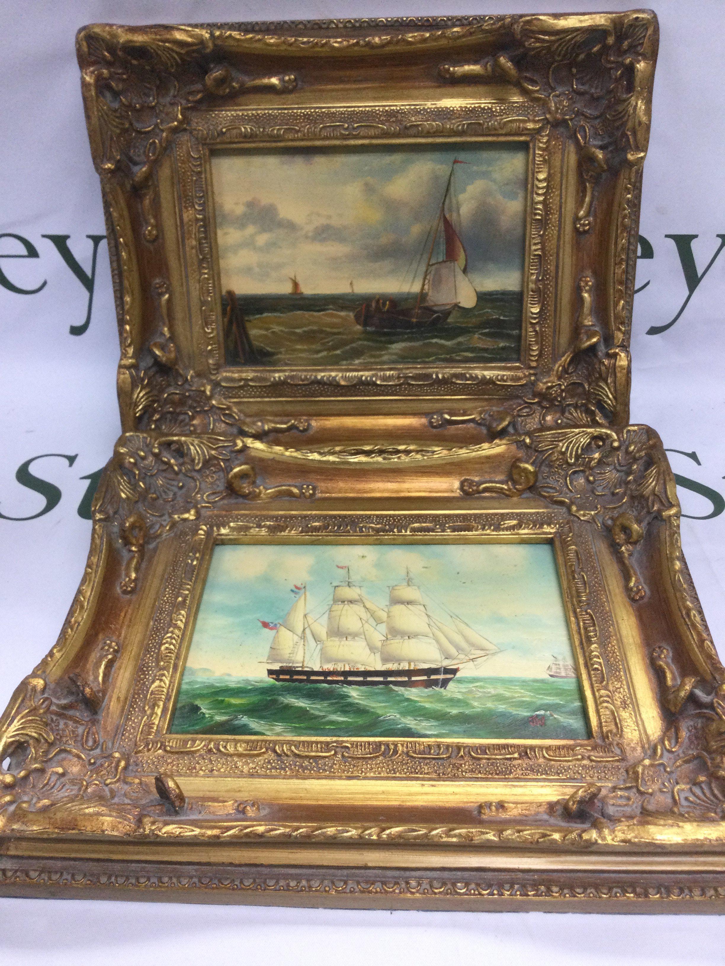 Two small gilt framed oil on board nautical paintings, one signed James Webb, the other monogrammed JW. Approx size 28.5cm x 23cm. Shipping category B.