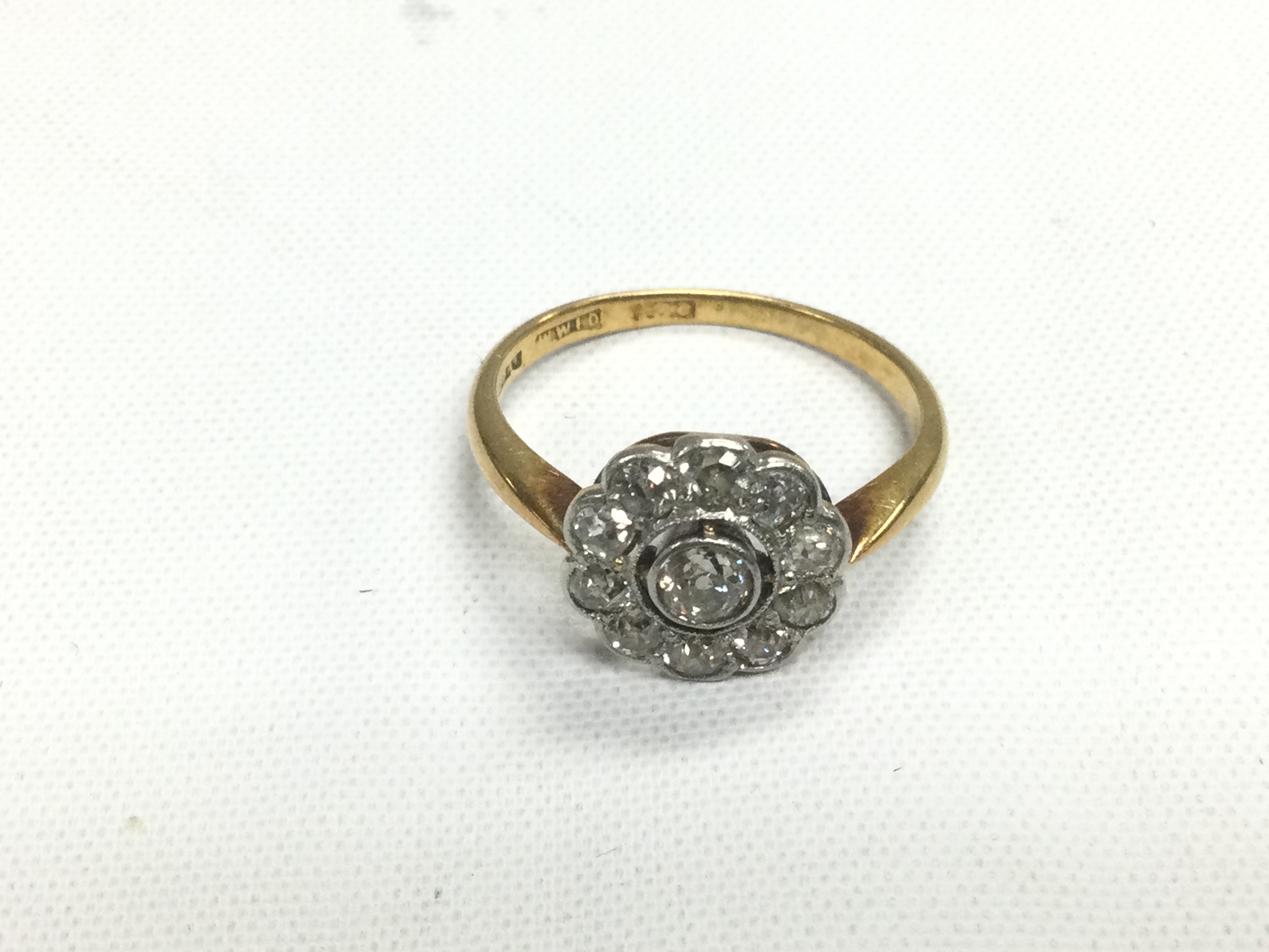 An 18ct gold and platinum diamond cluster ring, approx 3.6g and approx size O. Shipping category A.