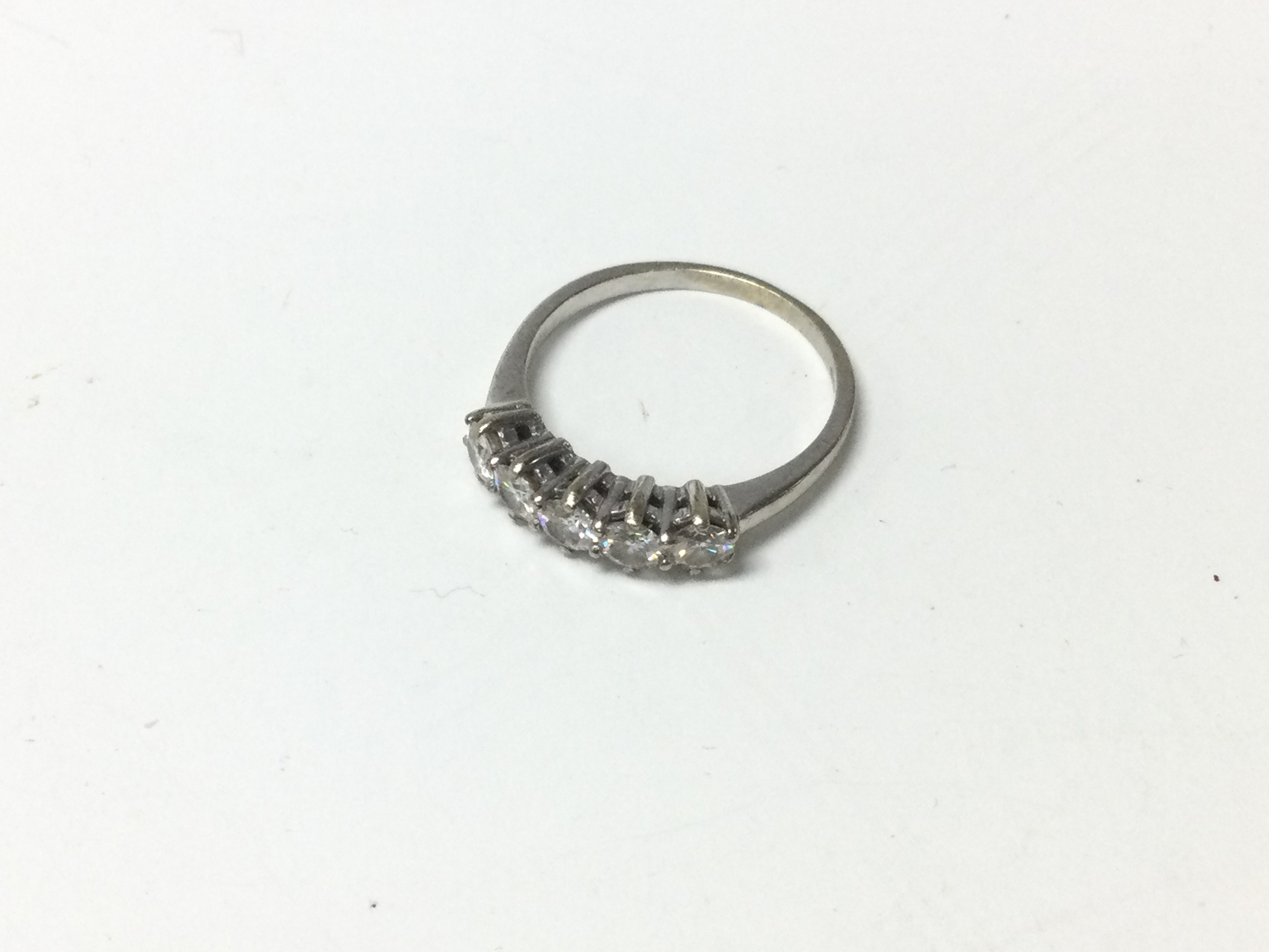 A 9ct white gold five stone diamond ring. Approx weight 2.3 grams, size M.