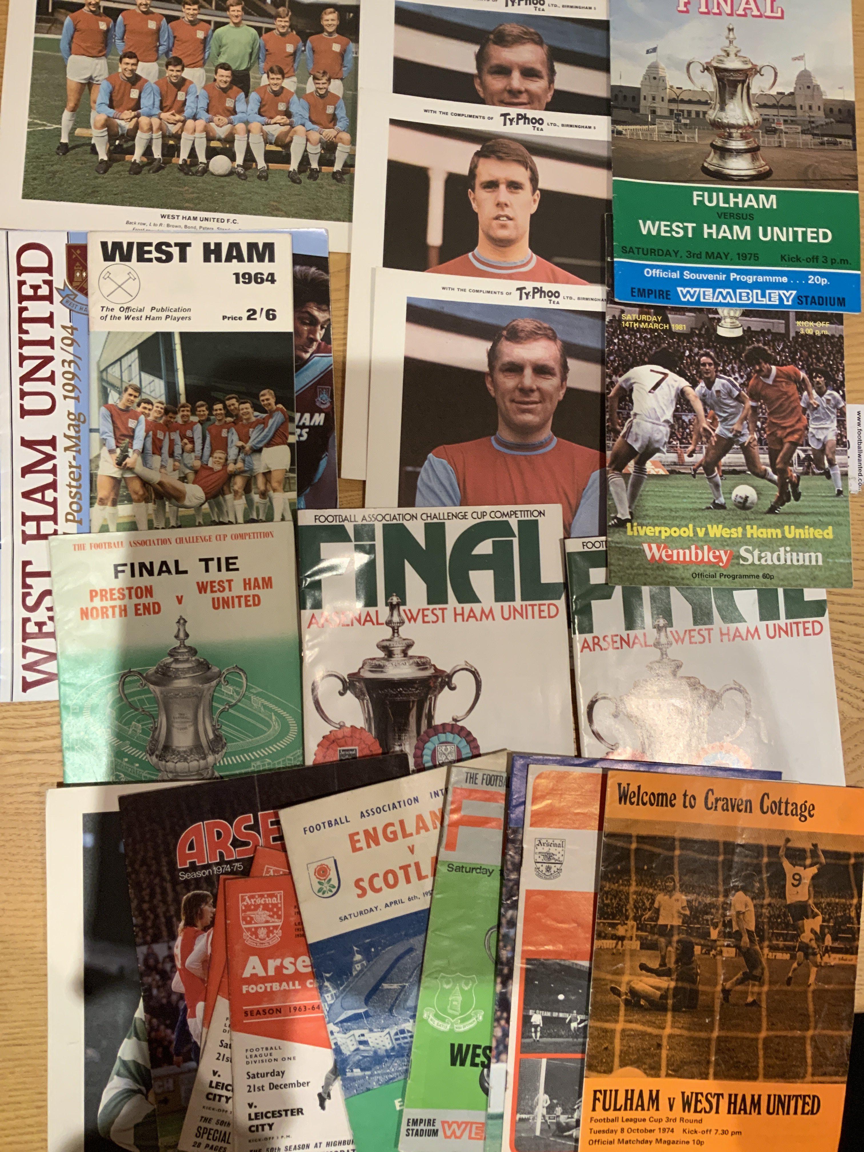 West Ham Football Memorabilia: Mint condition large Typhoo cards of a mid 60s team group plus 2 Bobby Moores and a Geoff Hurst. 1964 cup final handbook and programme, final programmes for 75 and 80 and more. Instructions to sell.