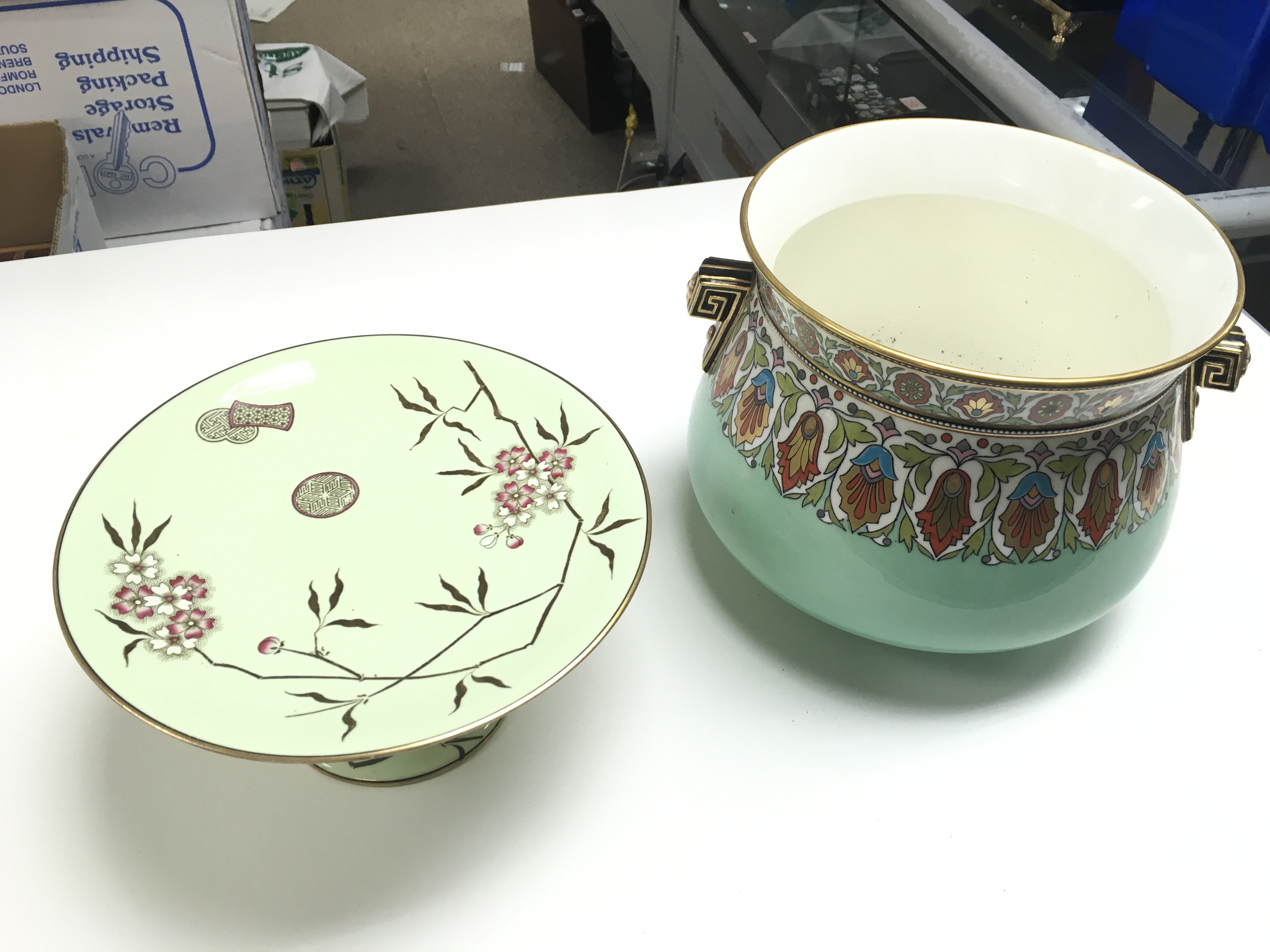 19th century ceramics, a porcelain cake stand stamped F.J Cullen Newcastle with floral decoration, two plates with the same design and a pot with hand painted gilt and floral patterned decoration. This lot cannot be posted