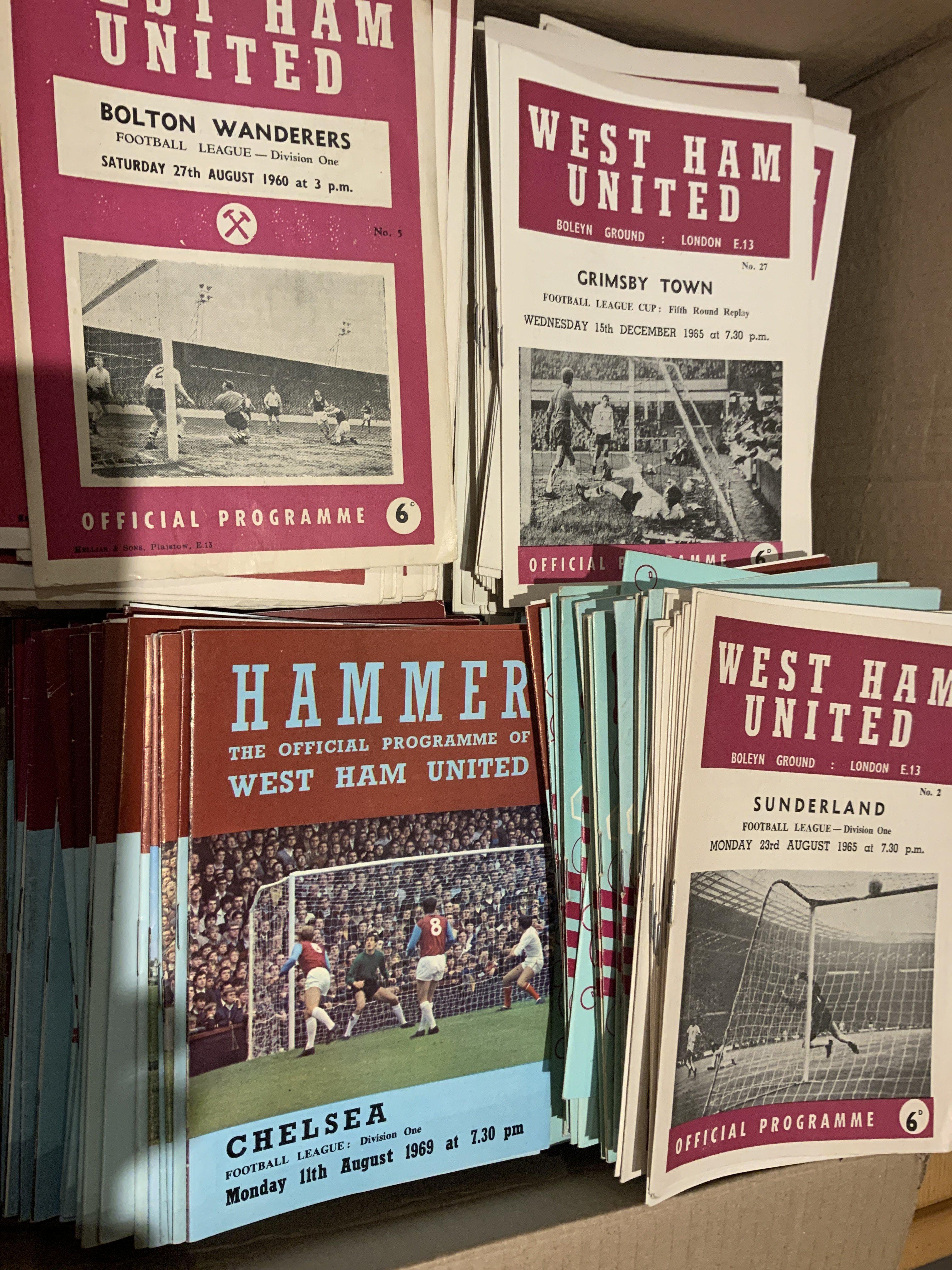 West Ham Home Football Programmes: All small style programmes from 60/61 to 82/83. Possibly some complete sets. 60/61 x 15, 61/62 x 21, 62/63 x 21, 63/64 x 26, 64/65 x 18, 65/66 x 21, 66/67 x 18, 67/68 x 14, 68/69 x 20, 69/70 x 18. Very good condition to include a few reserves and some early League Cup including 60/61 Charlton. (est 350)