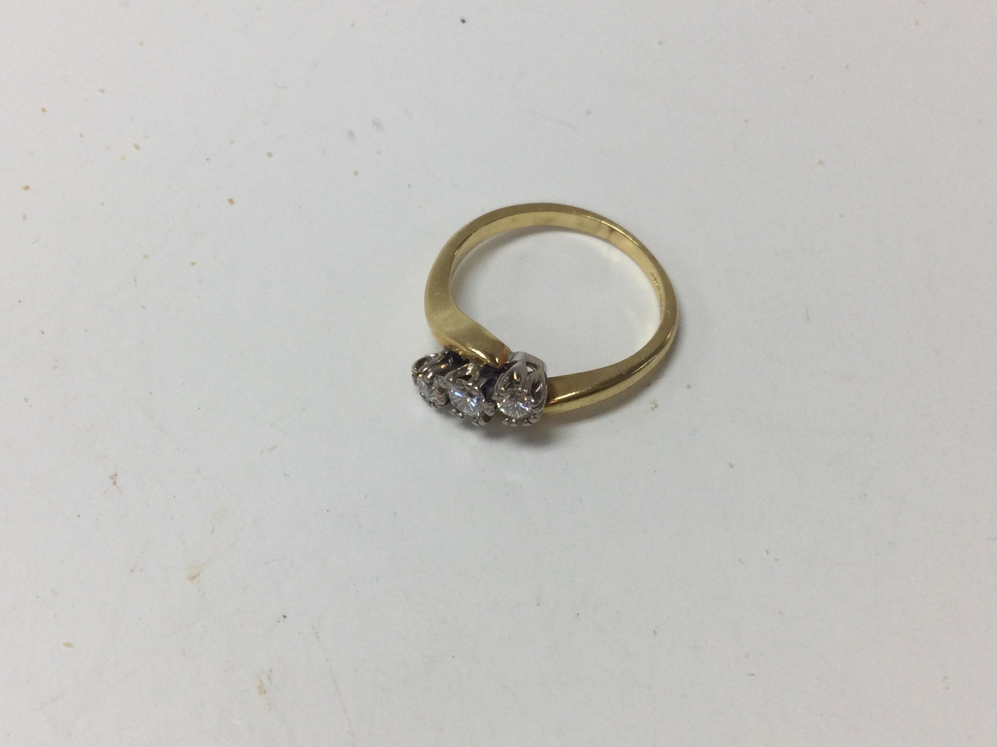 An 18ct gold three stone diamond twist ring. Approx weight 3.71grams, size L.