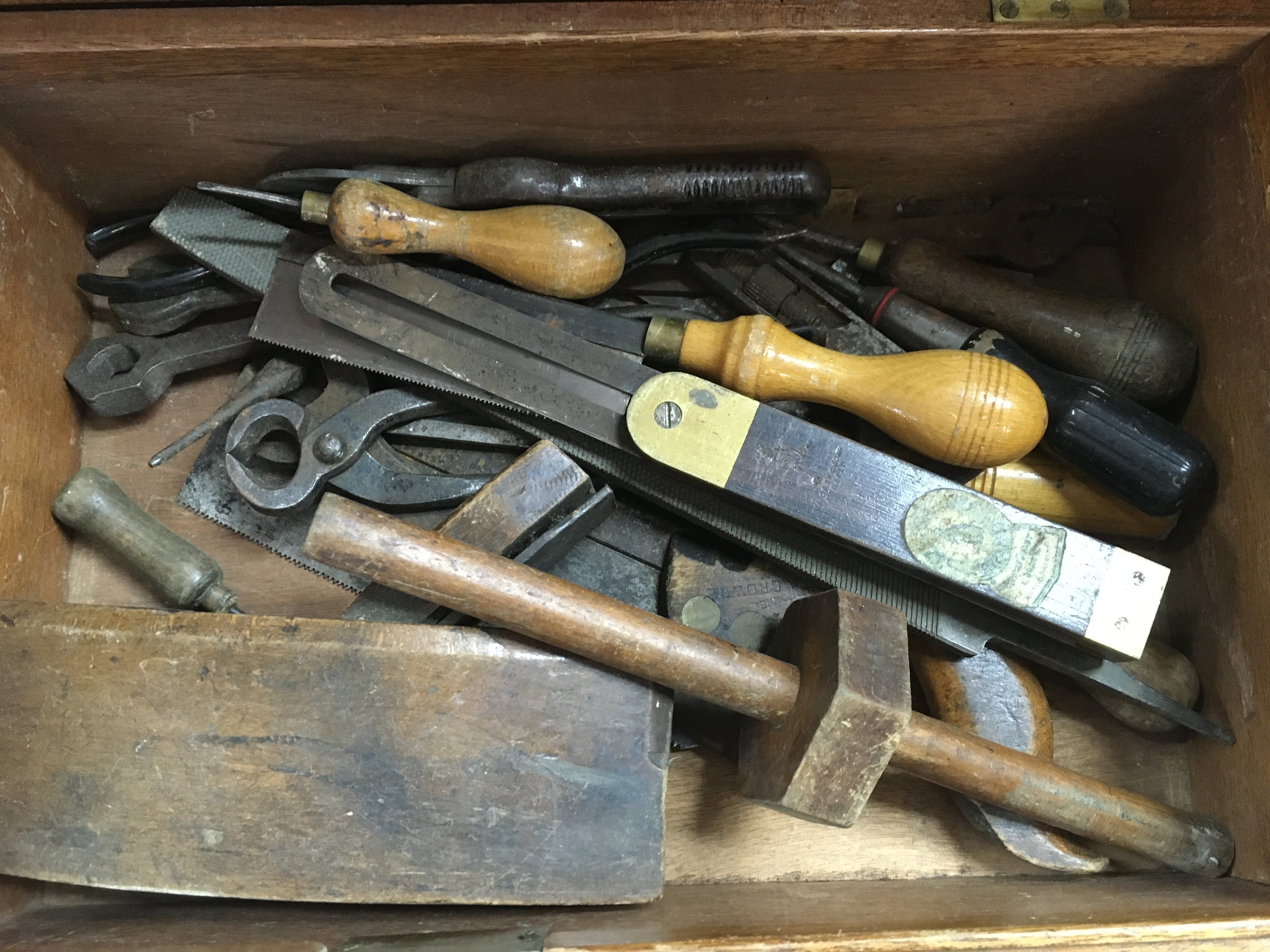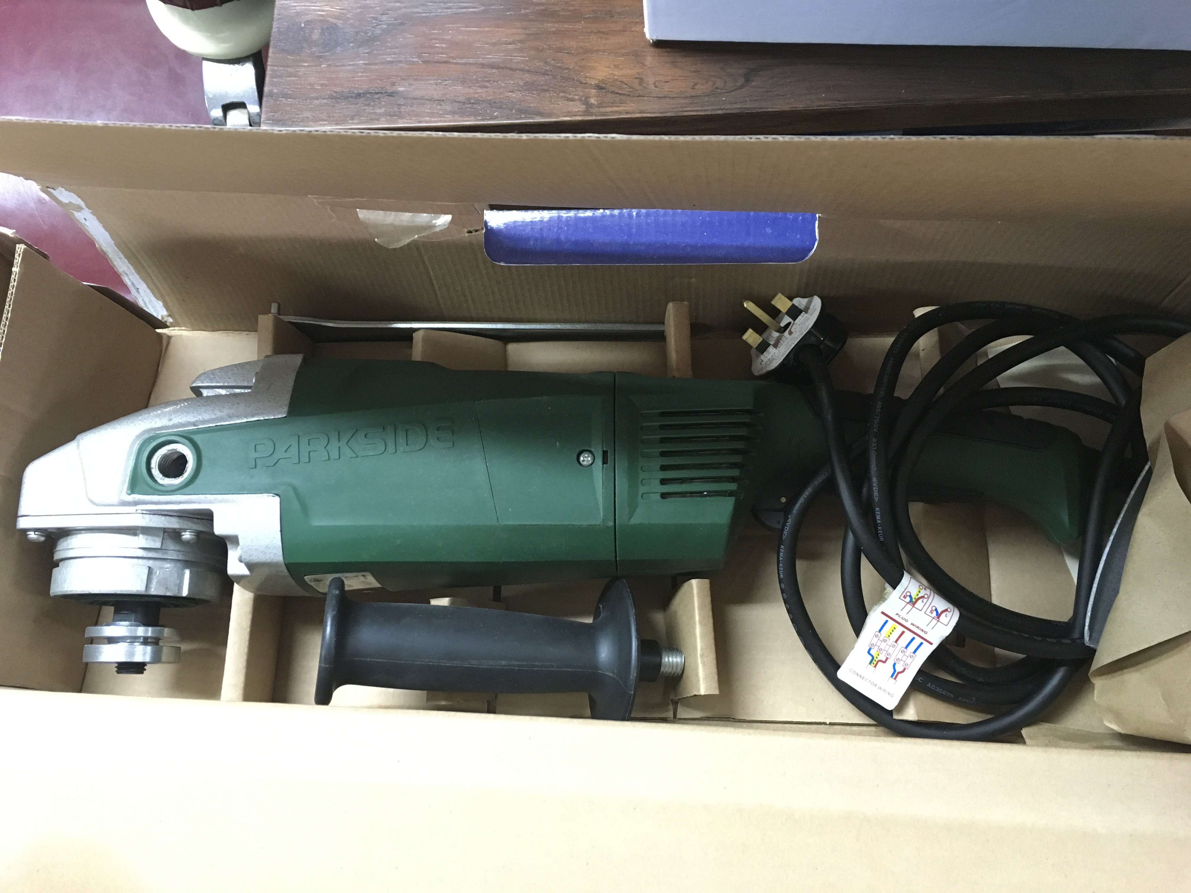 A collection of woodwork tools including a saw, steel plane, chisels etc and a boxed parkside angle grinder. This lot cannot be posted