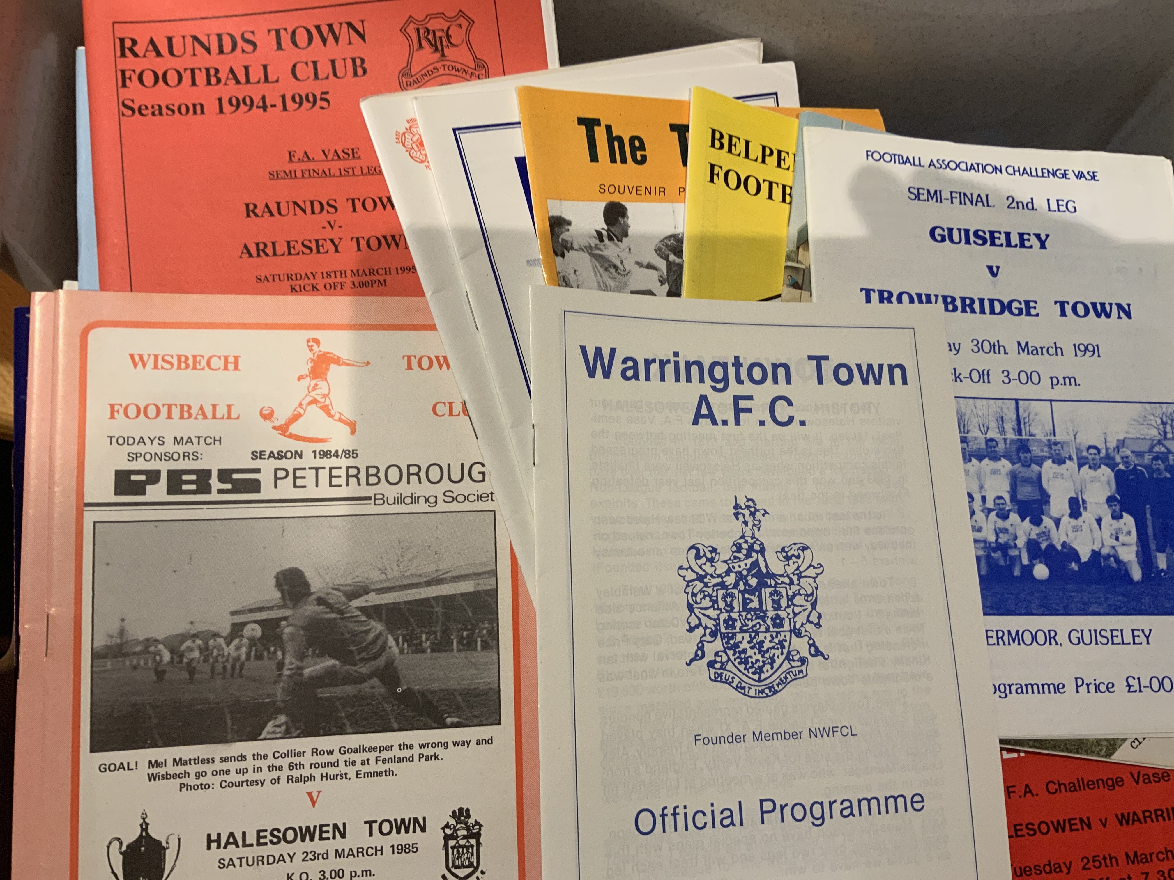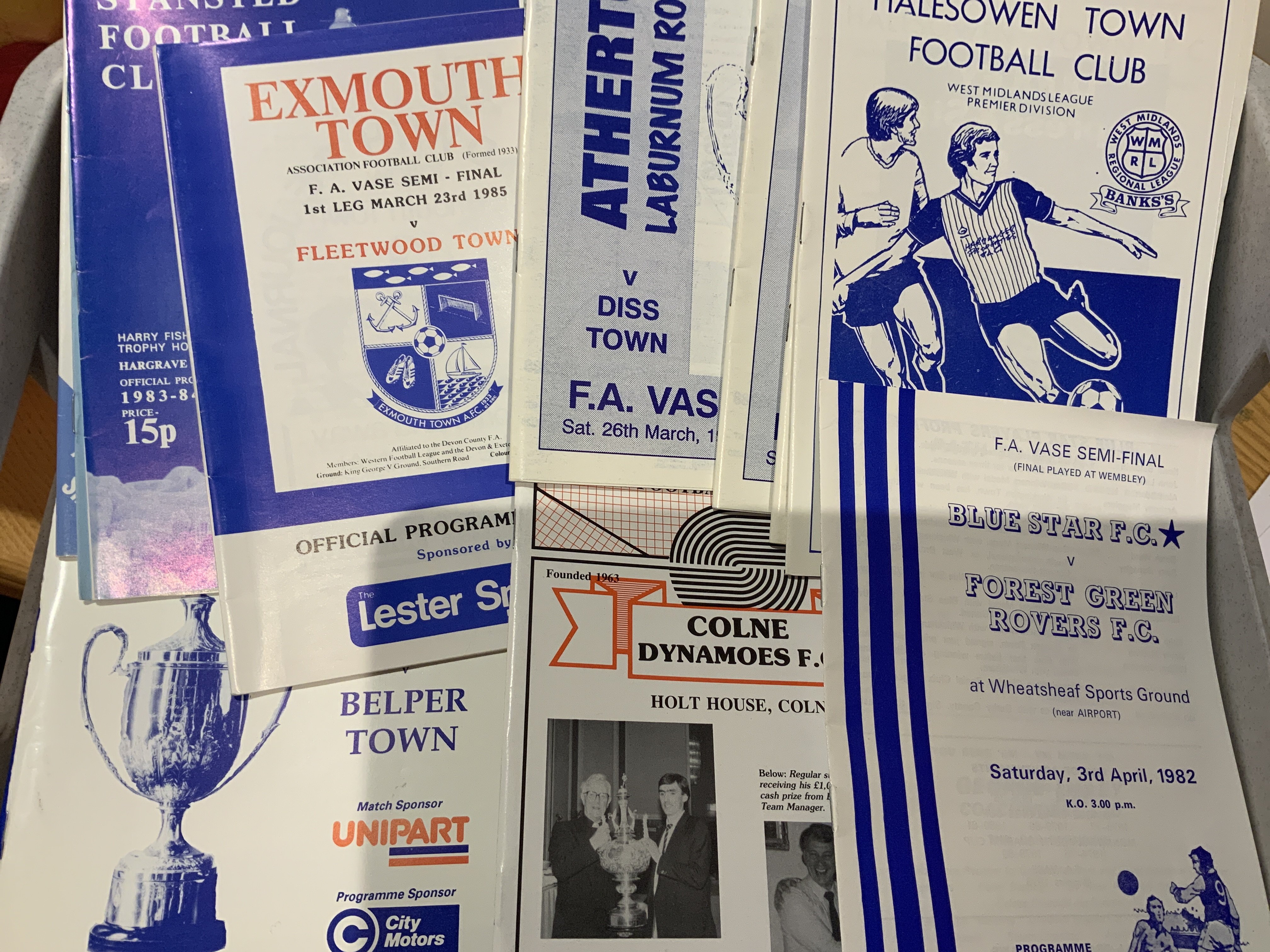 FA Vase + Trophy Semi Final + Final Football Programmes: Large box containing around 200 excellent condition programmes from both of the great non league competitions. Slight duplication. For collectors of finals this is a great opportunity to collect the semi finals. (200+)