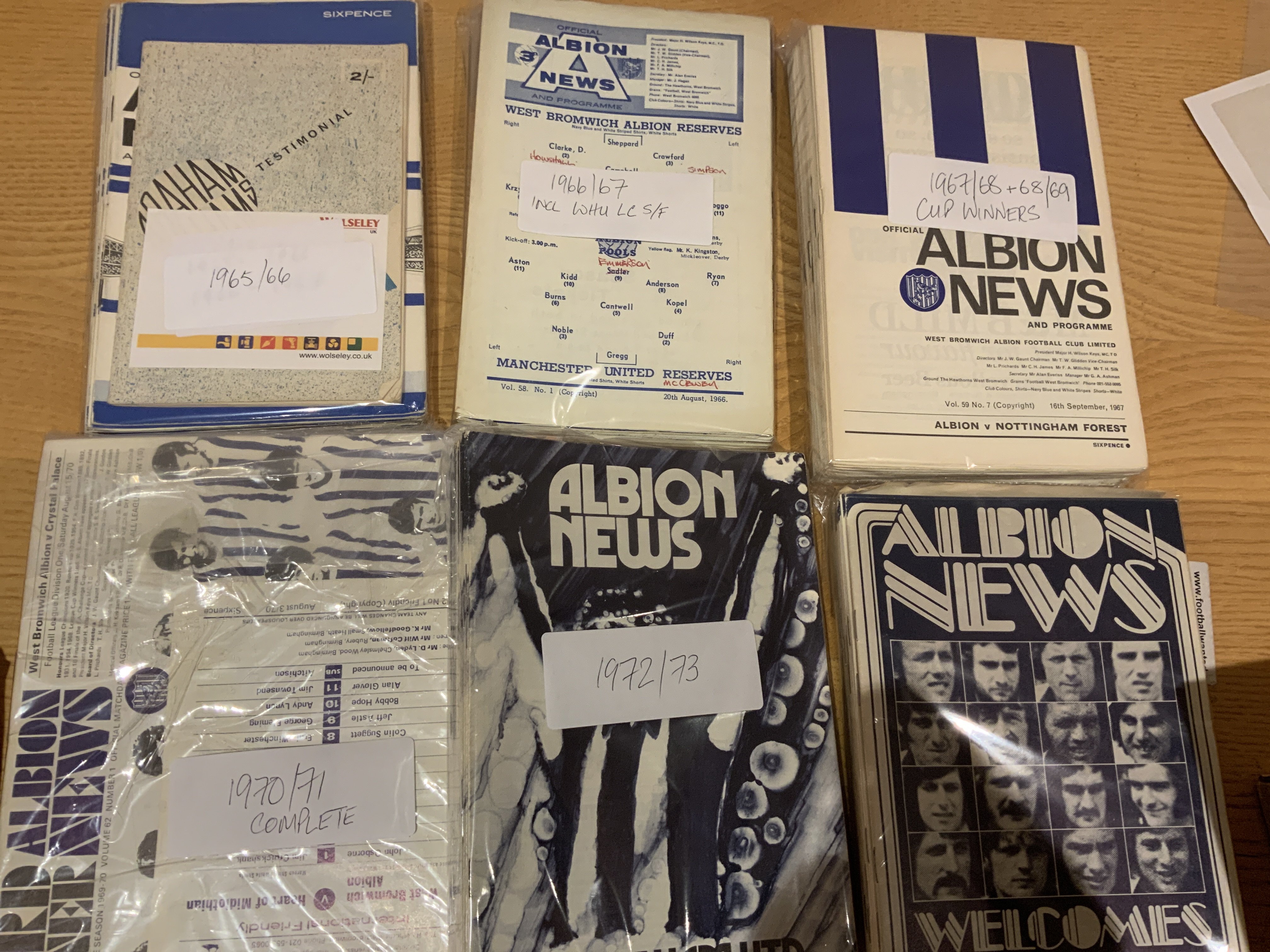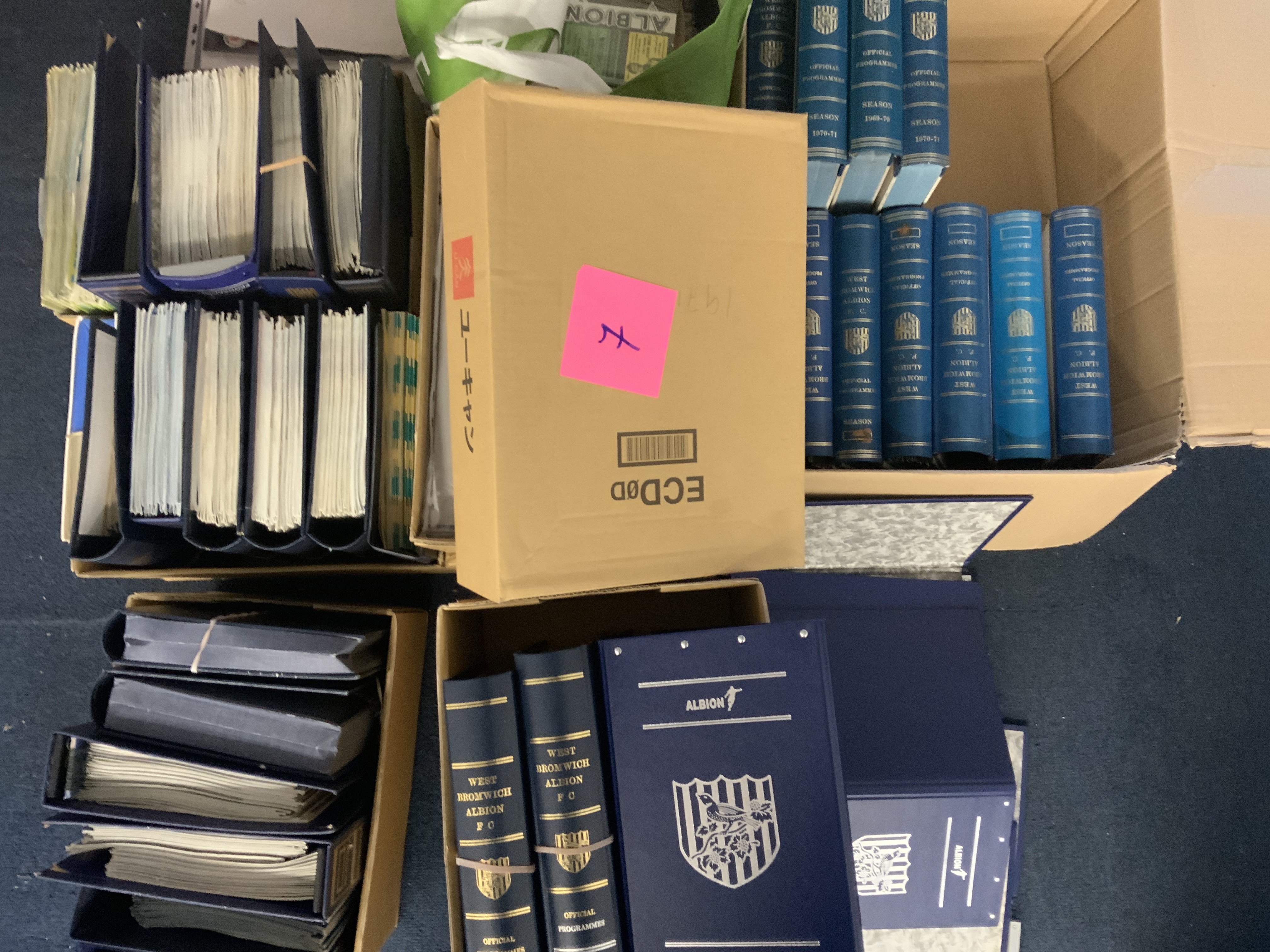 West Brom Home Football Programmes In Binders: Probable complete seasons from the mid 60s onwards in 40 official binders plus some later seasons and a few earlier programmes without binders. Mainly excellent. Must view but not for posting. (8 boxes)